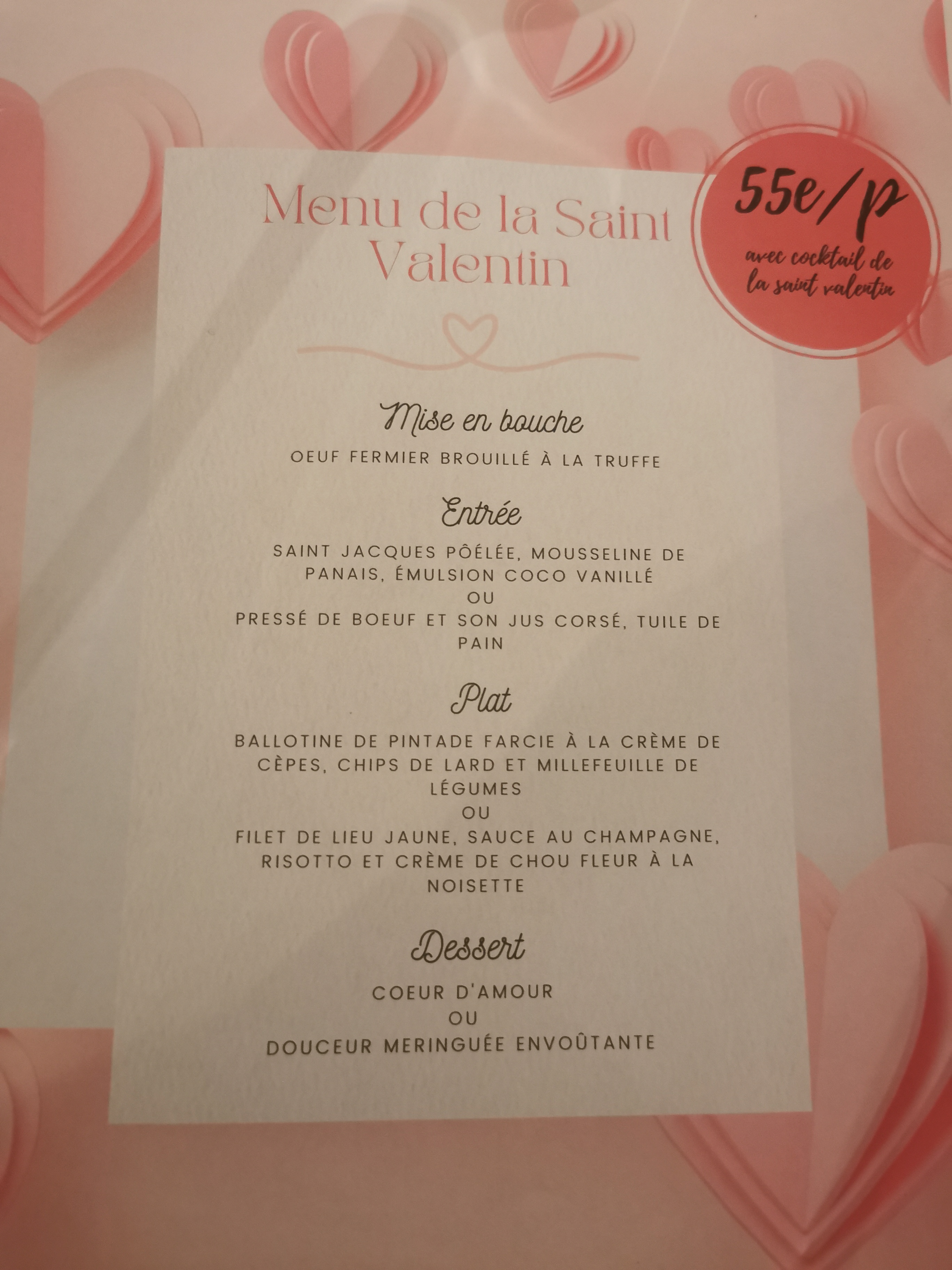 Très belle décoration de la salle de restaurant. Repas de la Saint Valentin. Rose et déco sur la table nous attendait menu unique pour ce jour unique avec un menu tout inclus sauf vin et café au prix de 55 euros par personne. Service et accueil parfait. Repas rechercher et pour la majorité fait maison. Pour ma part j'ai trouvé bien mais aurais du être relevé car un peu fade et manque de couleur dans le plat principal pour la présentation. Durée du repas 2h. Mon assiette entrée juste tiède dommage pour les St Jacques. Température du restaurant basse avec un chauffage style clim ce que je peux comprendre vu la demande du gouvernement et les charges des restaurants. On y reviendra pour tester la carte classique.