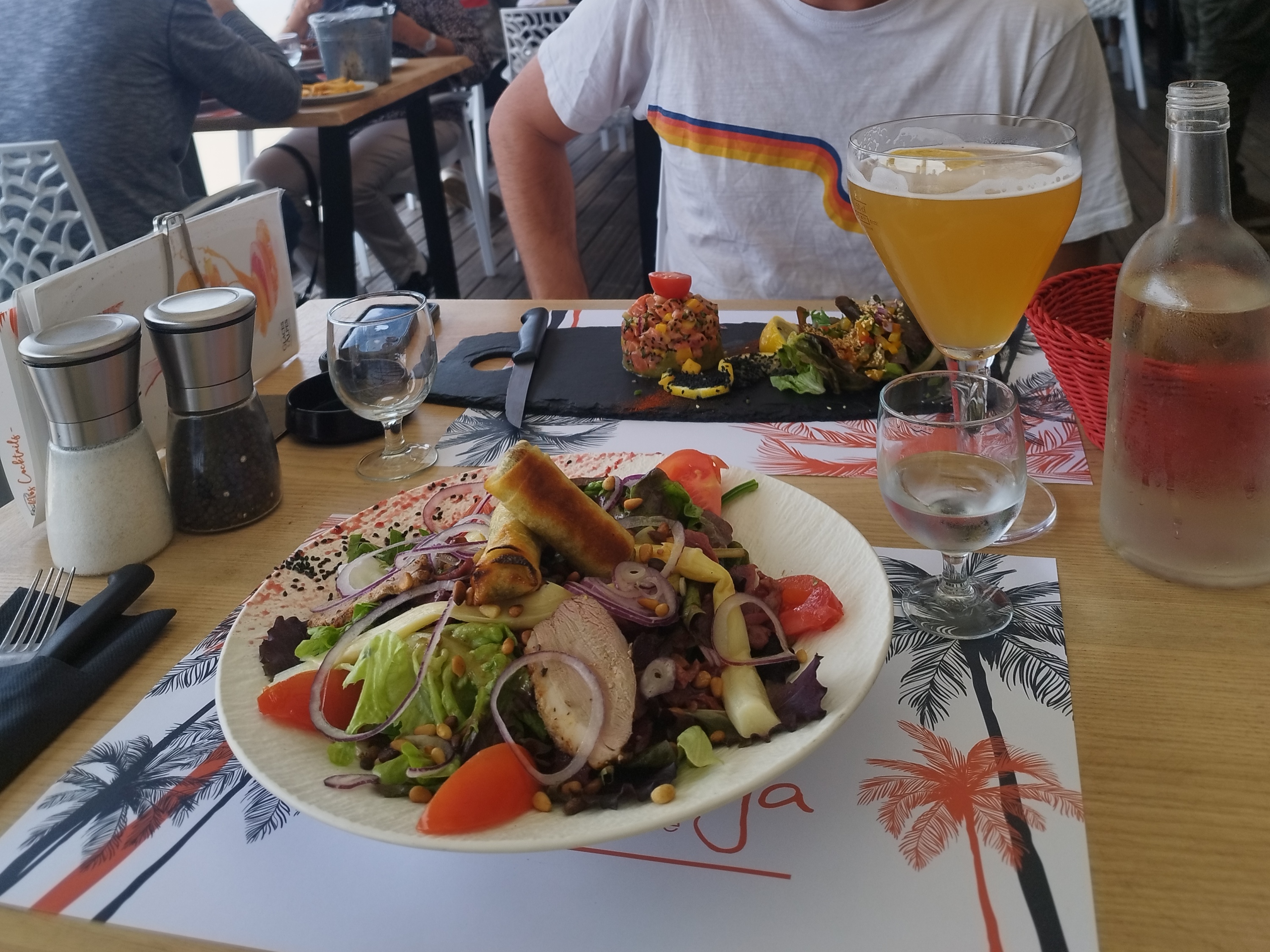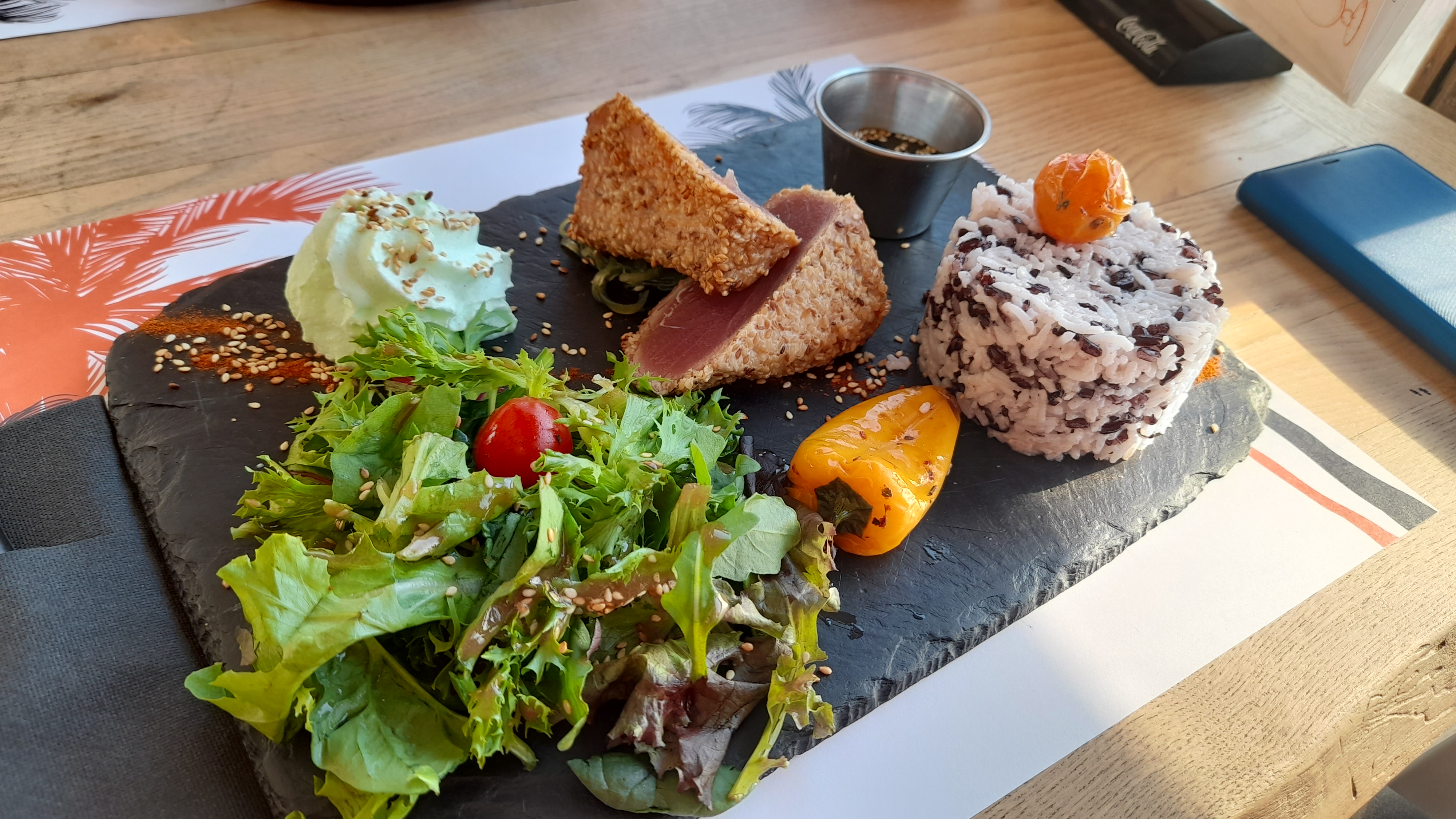 J'ai fait entrée plat à la carte. D'abord en entrée j'ai pris des moules gratinés, j'ai pas aimé à cause du manque d'assaisonnement et le faible goût des herbes qui doivent être surgelés, aucun goût ces moules grosses. Ensuite j'ai bien kiffe mon tataki de thon bien cuit avec son riz. La présentation des assiettes niveau bep cuisine. Service professionnelle qui met du temps à se lancer. Belle terrasse agréable. Prix raisonnable. Ils acceptent les chiens c'est cool.