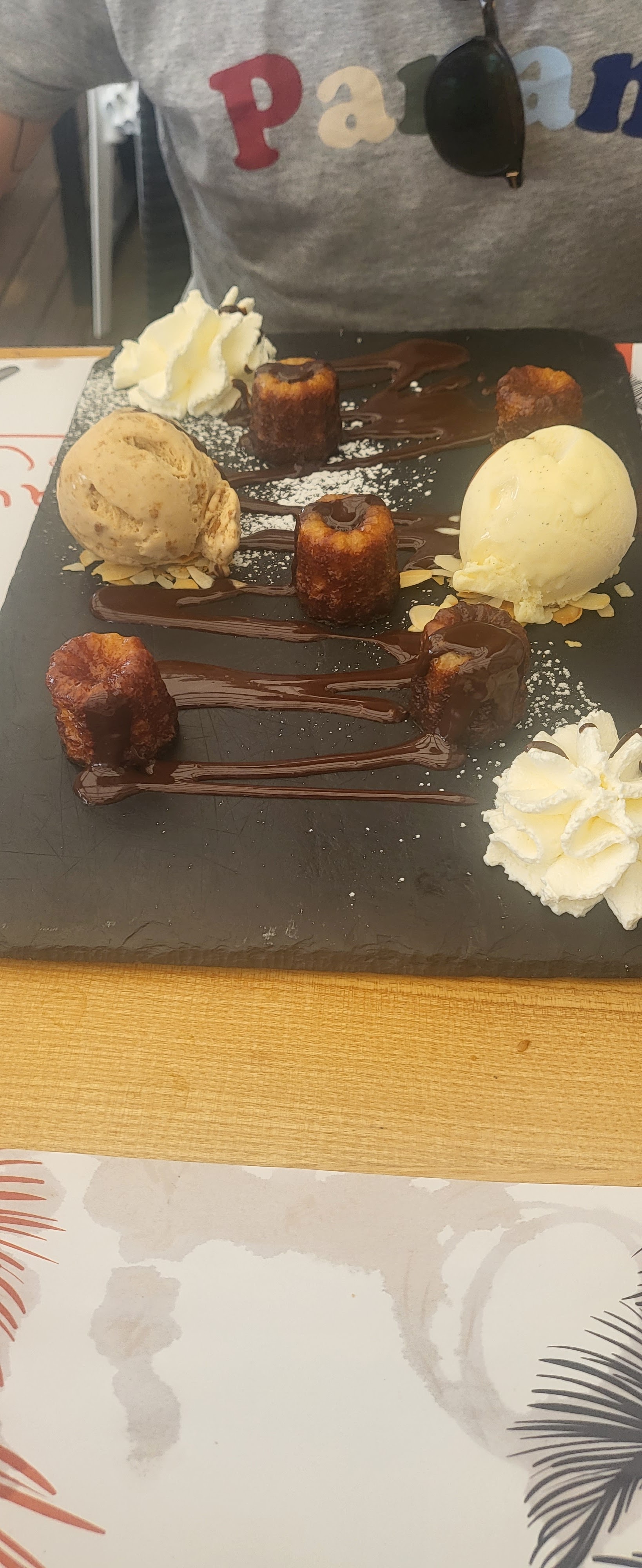 Impeccable. On a un peu attendu, mais de notre faute. 😅 On voulait être sur le côté avec vue 👀 QUE sur la plage 🦀 et la mer 😉 (C'est vrai que la concurrence 😕 juste dessous coupe un peu la vue 👀. Mais voyez les photos rien de catastrophique quand même. Il suffit de ne pas baisser les yeux...) Un espace ouvert bien agréable voir 👀 photo de la terrasse (sauf quand le vent 💨 s'en mêle. Mais là La Playa n'y est pour rien...) Bien entendu possibilité d'aller en salle. Mais le 2 juillet, pas très envie... Petit bémol pour nous avoir 3 personnes différentes au cours du service c'est moyen. L'assiette de 12 huîtres (pour 2 = moins cher que chacun 6 !)très proprement ouvertes (non non, ce n'est pas toujours le cas ! ) servies avec un pain 🥖 aux noisettes 🐿, riche idée 💡 ! La poitrine de prince noir sauce barbecue : un régal. Je m'en lèche encore les doigts ! Certains des accompagnements sont préparés maison 🏡 De mémoire il me semble qu'outre les frites 🍟 au moins la fameuse sauce barbecue et le sirop de chocolat 🍫 sur mon dessert 🍰 en font partis. 😉 Haaaa ouiiiiii, le dessert 🍰 ! Un délice : des mini cannelés (pour moi meilleur que les Bar.. de Bordeaux) dont je me suis servie pour saucer le sirop de chocolat 🍫 chaud sur 2 boules de glace aux parfums raffinés. Joliment présenté sur ardoise, la aussi, voir 👀 photo. Heuuu 🤔 J'espère n'avoir rien oublié. Mais allez donc y jeter un coup d'œil, et lèchez vous les doigts à votre tour ! 😉