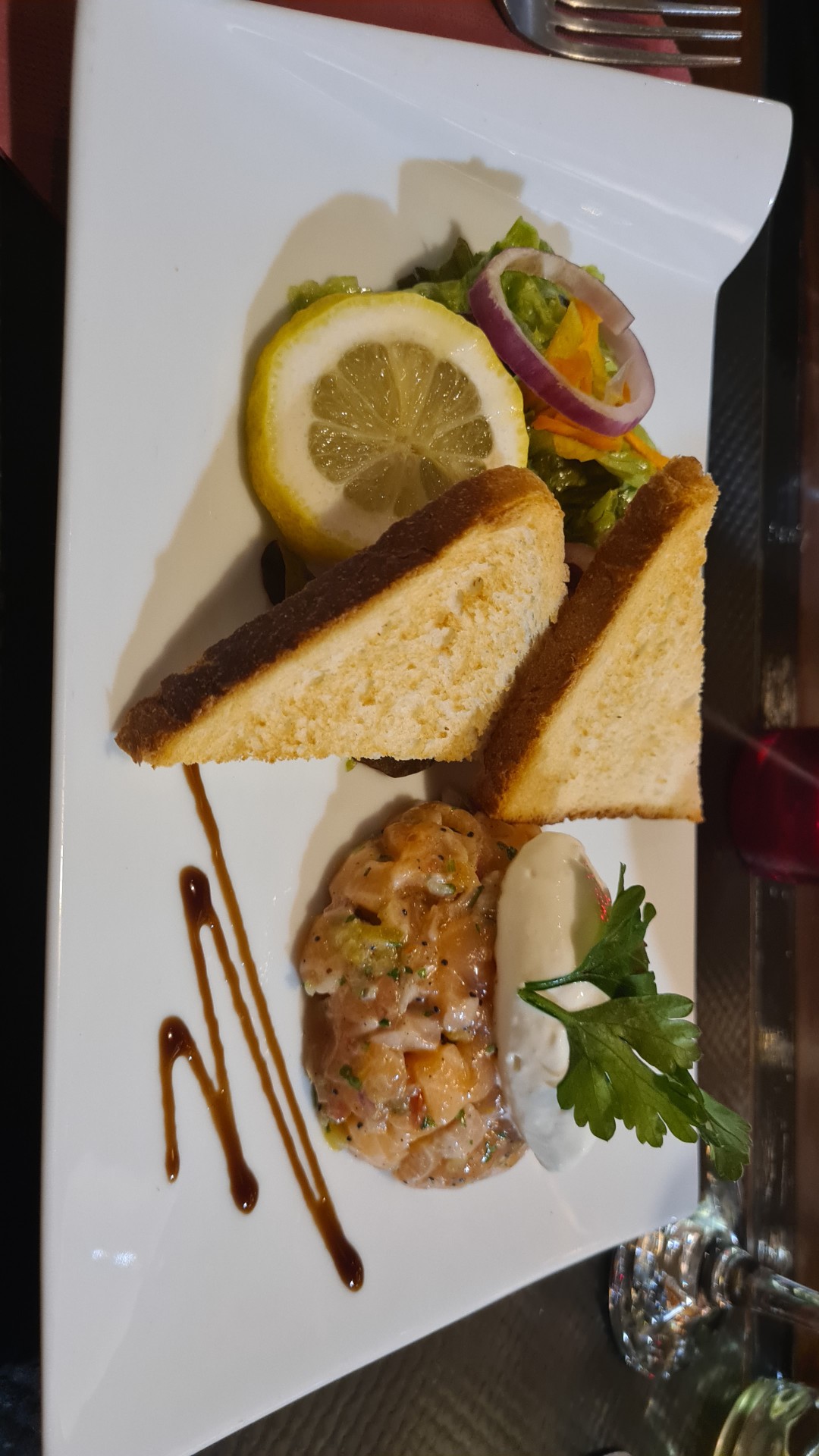 Tartare de saumon très bon Viande dur Tiramisu moyen Jamais été déçu avant , débordé quand le restaurant est complet dommage pour moi