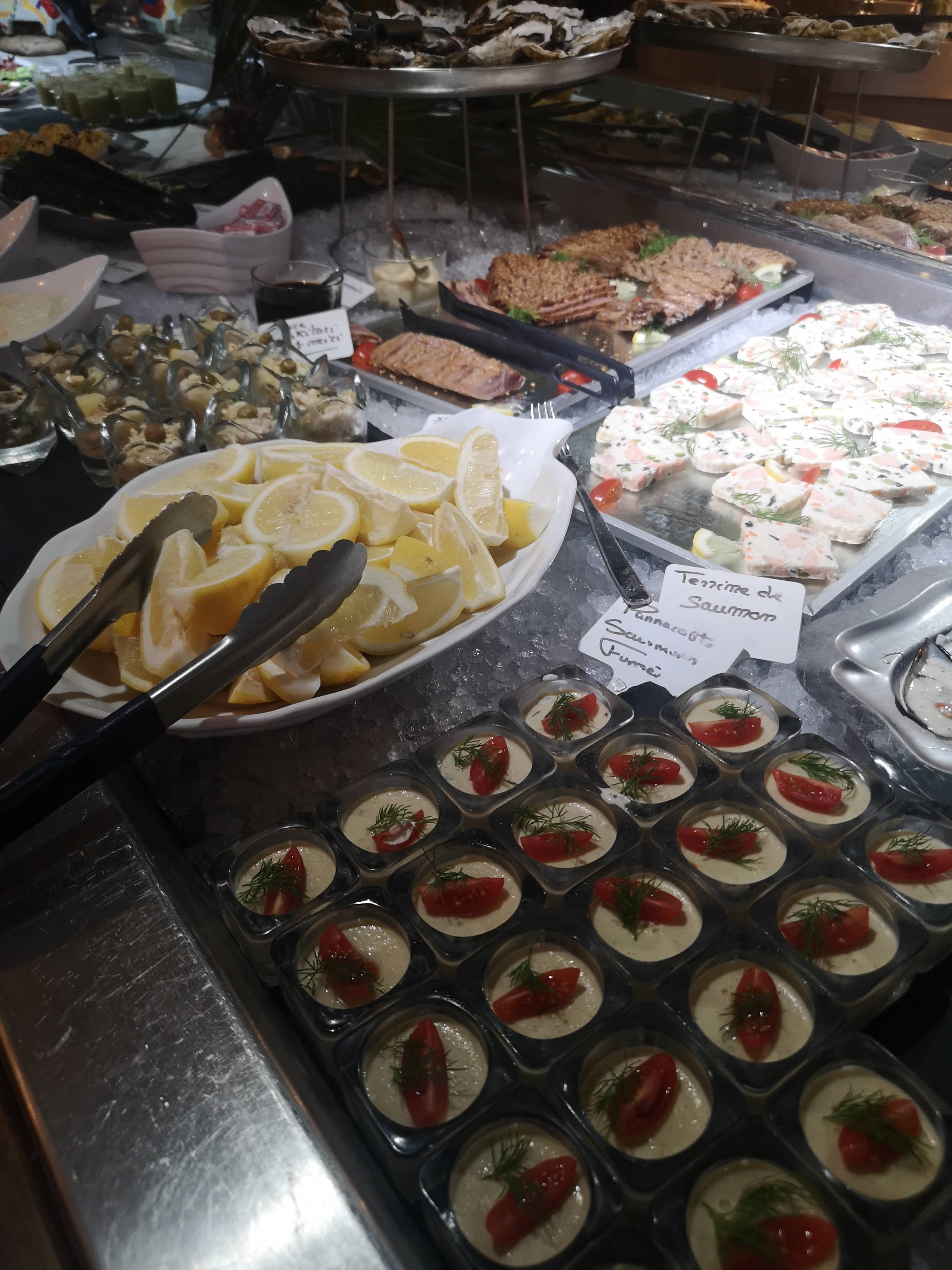 Bonsoir. Amoureux des délices de la mer, nous vous recommandons vivement cet établissement, nous reviendrons prochainement. Un buffet magnifiquement présenté. Parmi un large choix, nous avons dégusté ce beau plateau de fruits de mer, sardines marinées, de savoureuses petites verrines, une soupe de poisson maison ... excellente!! Merci au patron pour son accueil très chaleureux et son travail passionné.