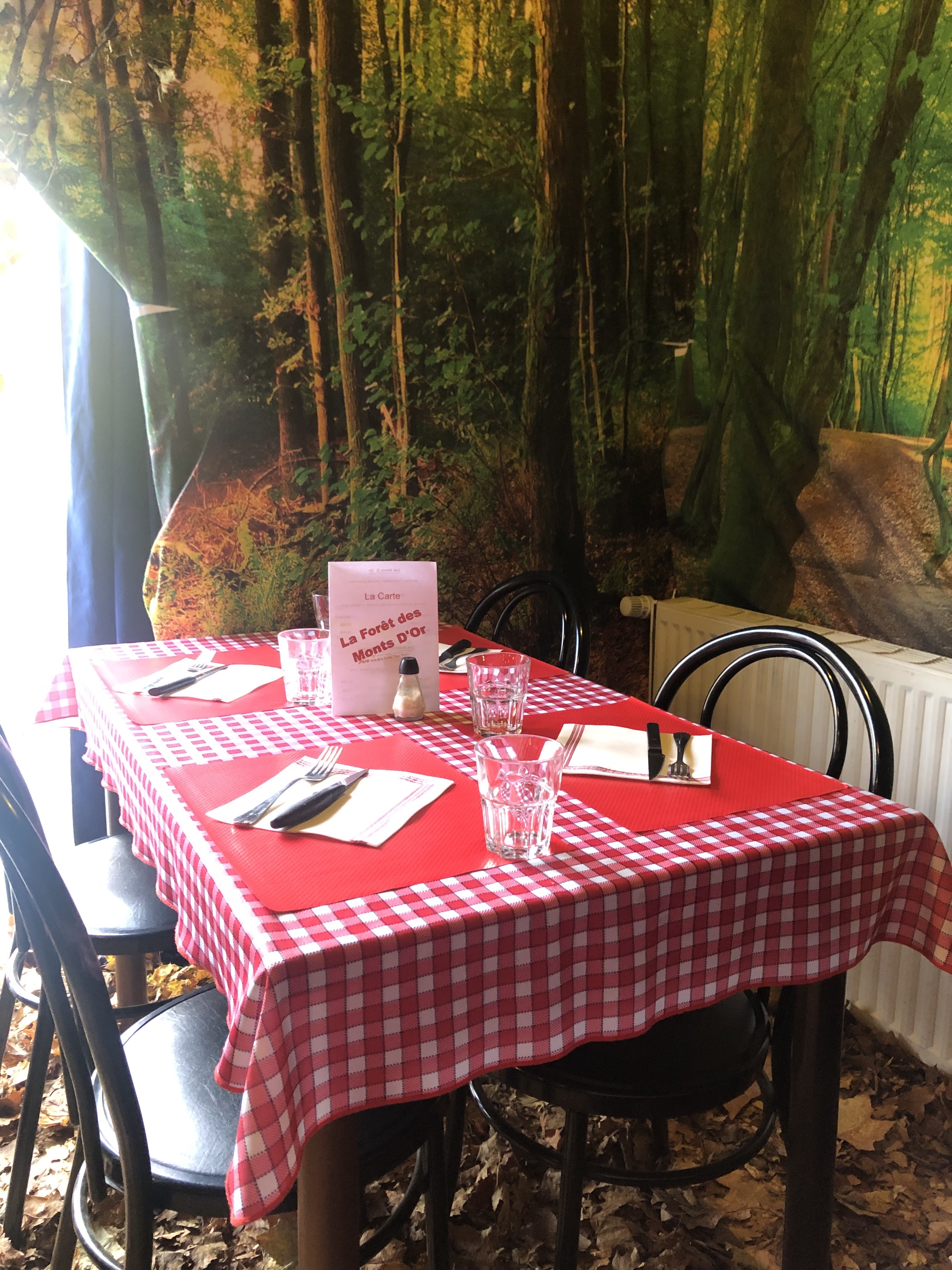 Restaurant avec décor et cuisine à thème, qui change chaque mois. Cette fois, avions les pieds dans les feuilles , en pleine forêt…pour déguster une boite mont d’or aux girolles.