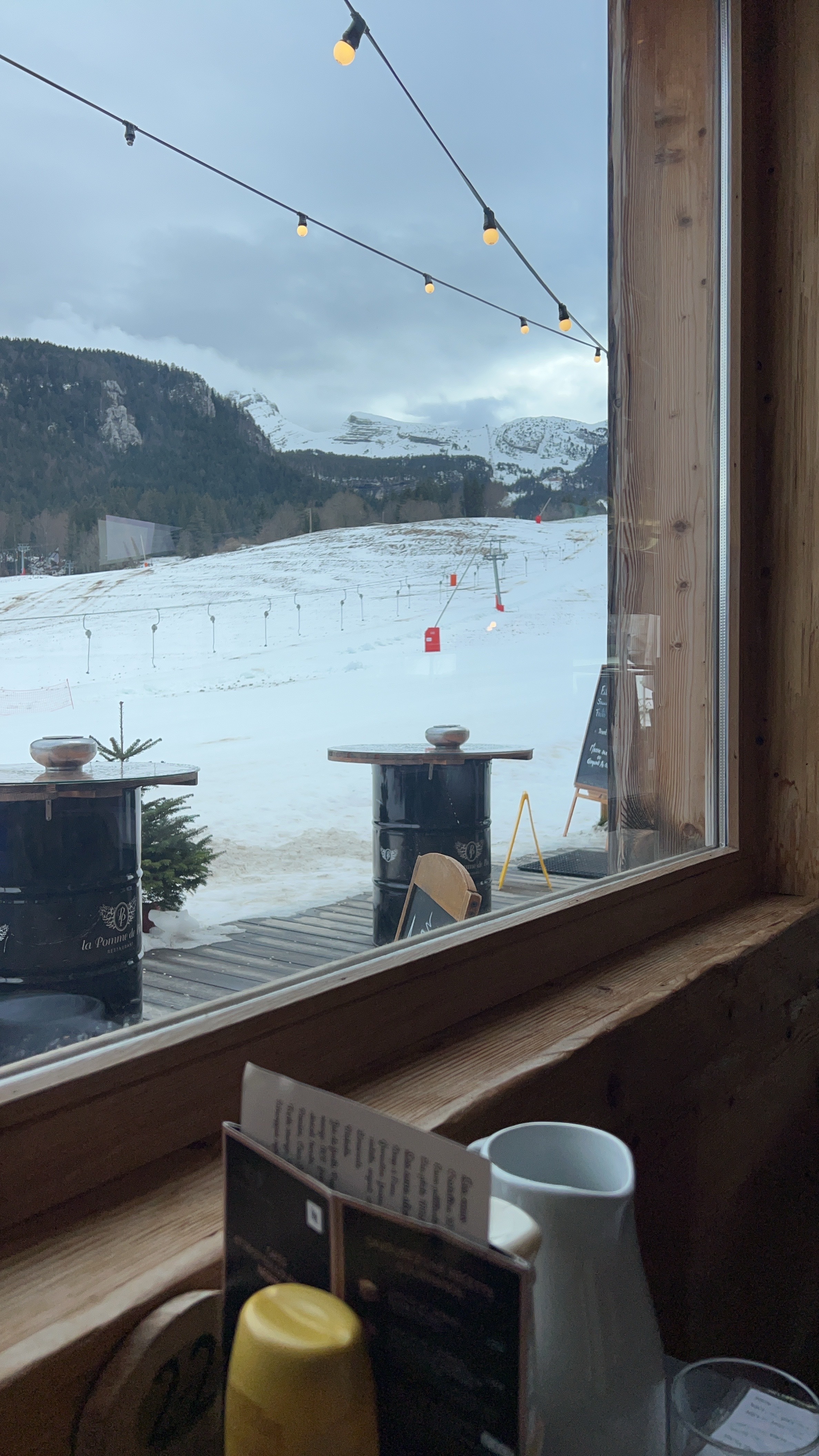 Idéal pour prendre un café le matin avec une vue magnifique sur la montagne et les pistes et pour un déjeuner rapide après le ski ! Personnel très gentil !