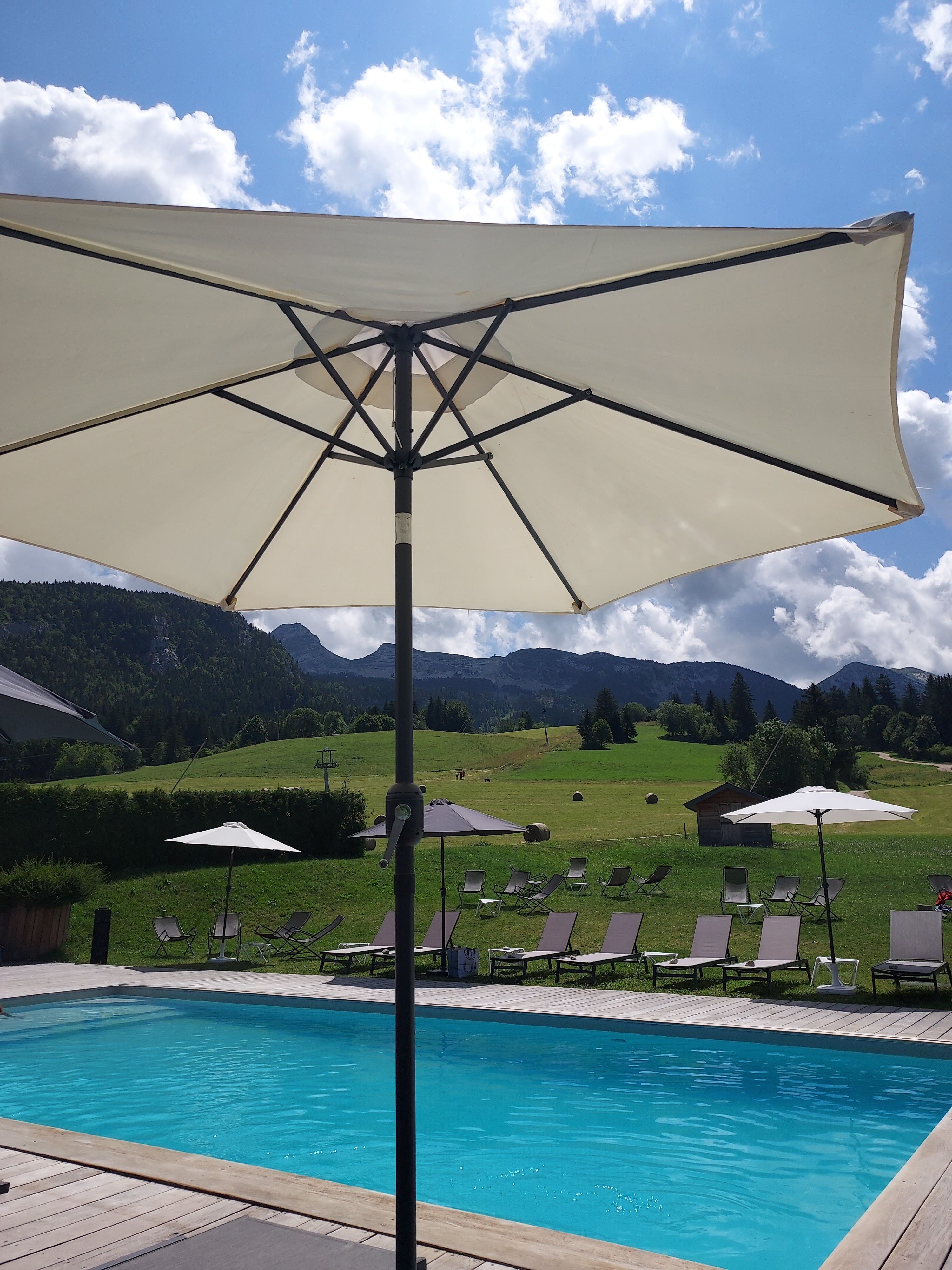 Très bel endroit pour déjeuner et faire un plongeon dans la piscine face aux montagnes (en été )