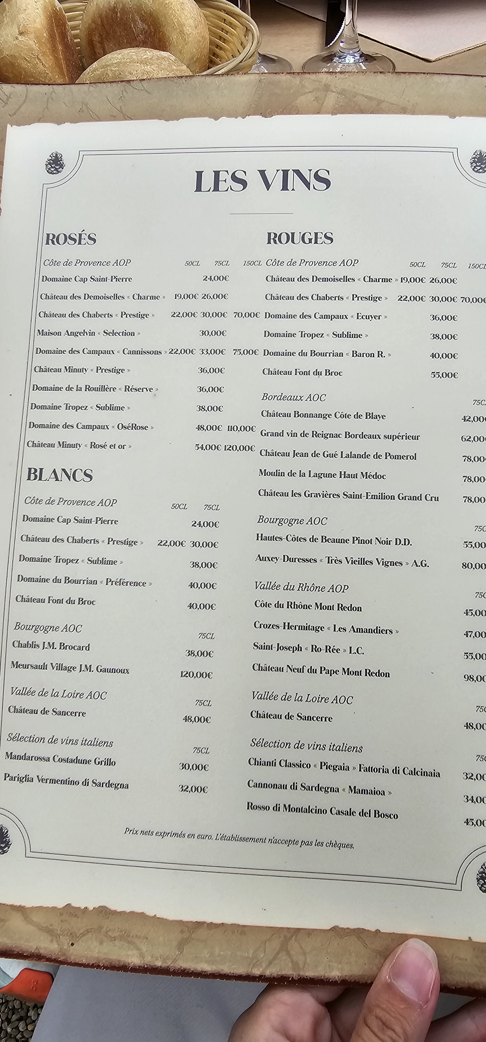 Menu alléchant. Une bonne adresse sur les hauteurs de saint Tropez. Jamais été déçu depuis 10 ans À recommander