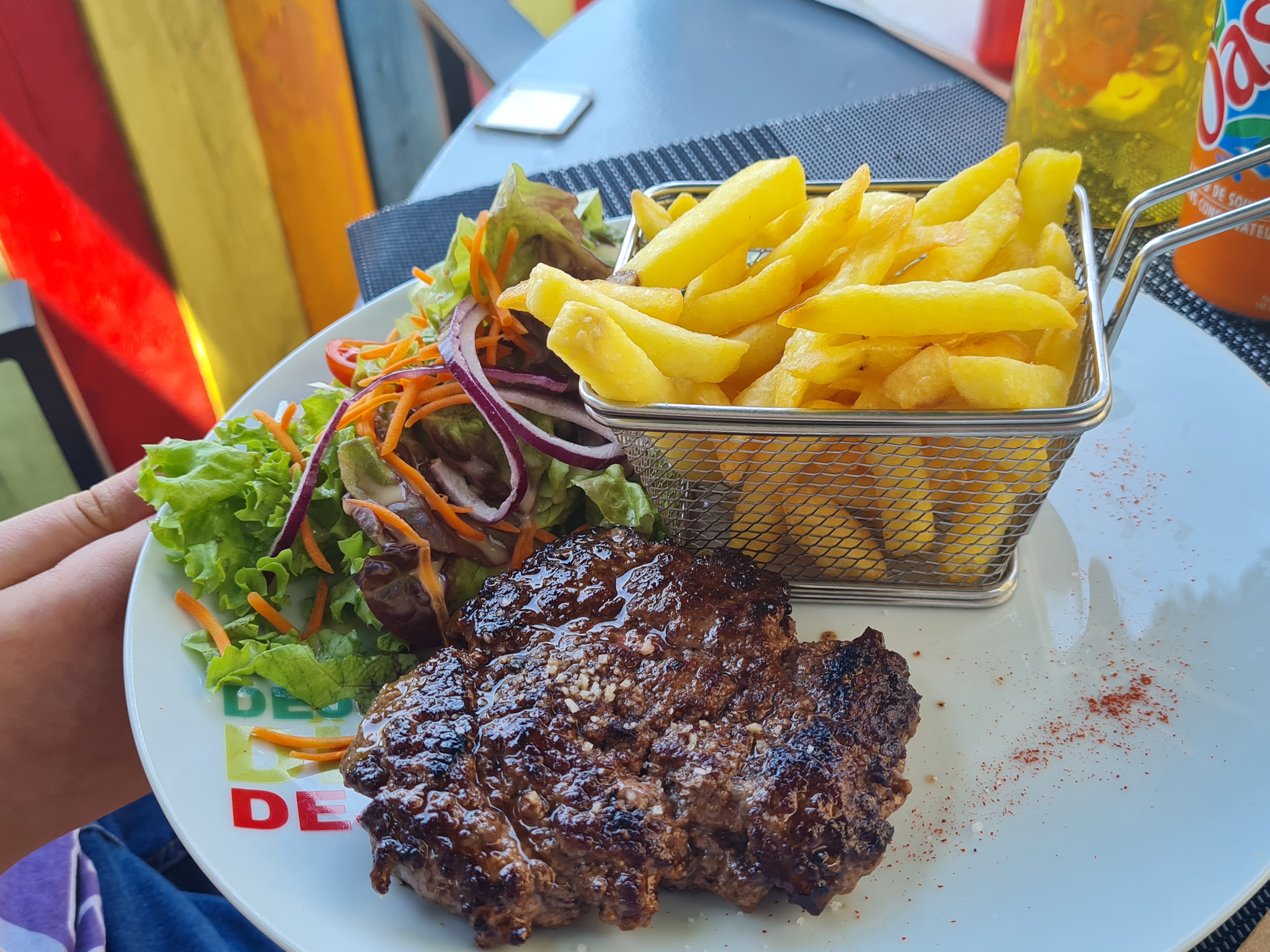 Jolie endroit. Agréable. A côté de la mer. Drôle d'endroit. Mais super. La pièce de boeuf est énorme et délicieuse. Les frites sont succulentes. Je vous le conseille fortement.
