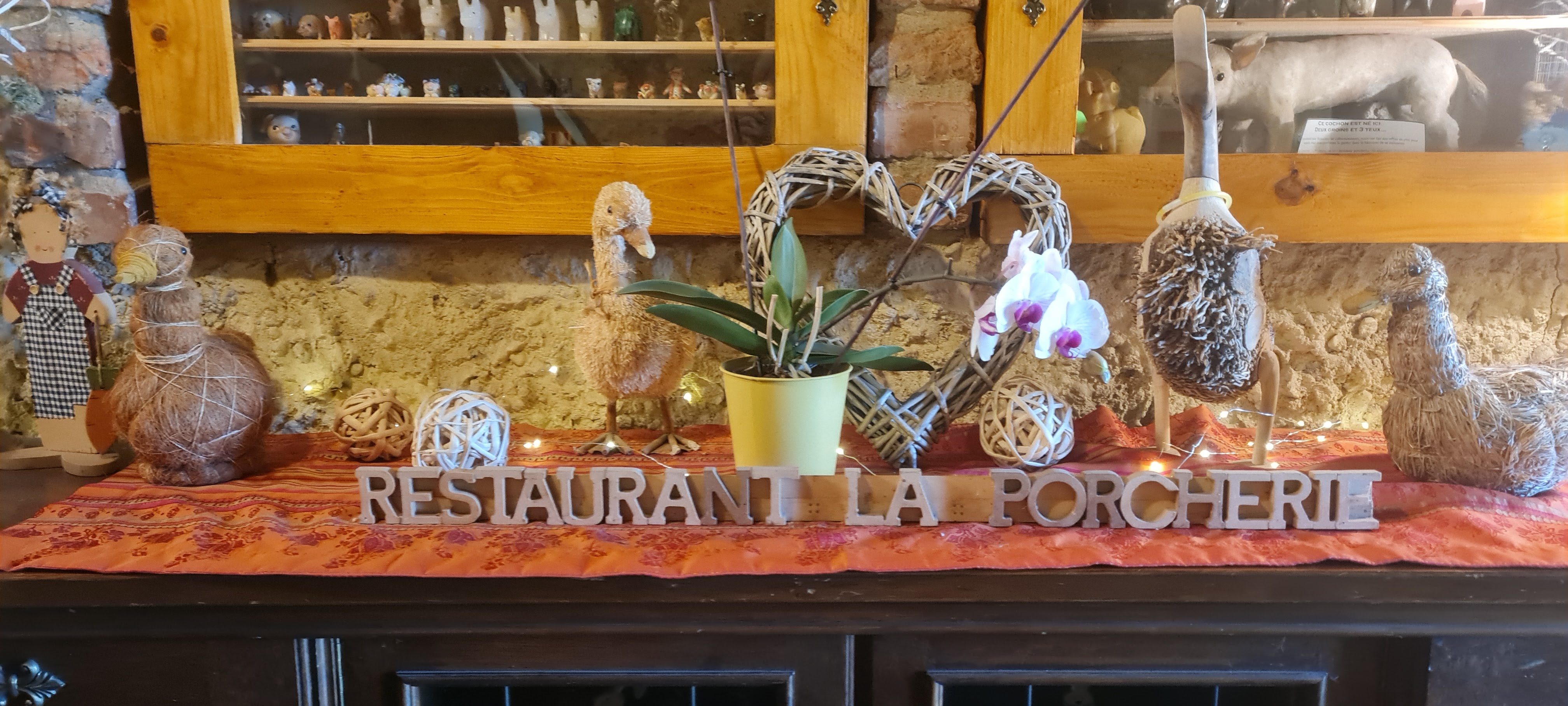 PARFAIT ! A RECOMMANDER VIVEMENT ! SUPER ! Rapport qualité/prix PARFAIT ! J'ai organisé l'anniversaire surprise de mon mari ce mois-ci au restaurant la Porcherie, nous étions 85 invités. C'était parfait ! C'est un établissement authentique avec une cuisine maison du terroir. Nous avons une salle privée avec une sono et une piste de danse. Le cadre à la campagne est exceptionnel . On ne peut y venir manger que en groupe. Mes invités étaient ravis de pouvoir danser pendant tout le repas. Le rapport qualité prix est exceptionnel car Le tarif est de 38€ par personne pour le repas et la salle privée avec la sacem et la sono ! c'est bien moins cher qu'une salle des fêtes avec traiteur et DJ ! -l'apéritif est à discrétion avec des salés et éclairé par la lumière douce d'un chandelier et de la cheminée - L'entrée : la terrine elle est à l'Armagnac et divine. Pour les crudités, c'est une brunoise de tomates oignons frais accommodées de jeunes pousses d'épinard et le jambon persillé est superbe. - Les pommes de terre sont réellement cuitent dans la cheminée, avec ce gout agréable de braises. Le porcelets qui tournent à la cheminée sont cuit au feu de bois dans notre salle privée. Le fromage blanc assaisonné qui l'accompagne est savoureux. - Grands plateaux fromages brie, bleu et chèvre avec des noix et de la salade , - Nougat glacé très bon et autant qu'on en veut - Côtes du Rhône savoureux en adéquation parfait avec le menu. - Grande salle propre, il y a même une chaise bébé et le service y est souriant !