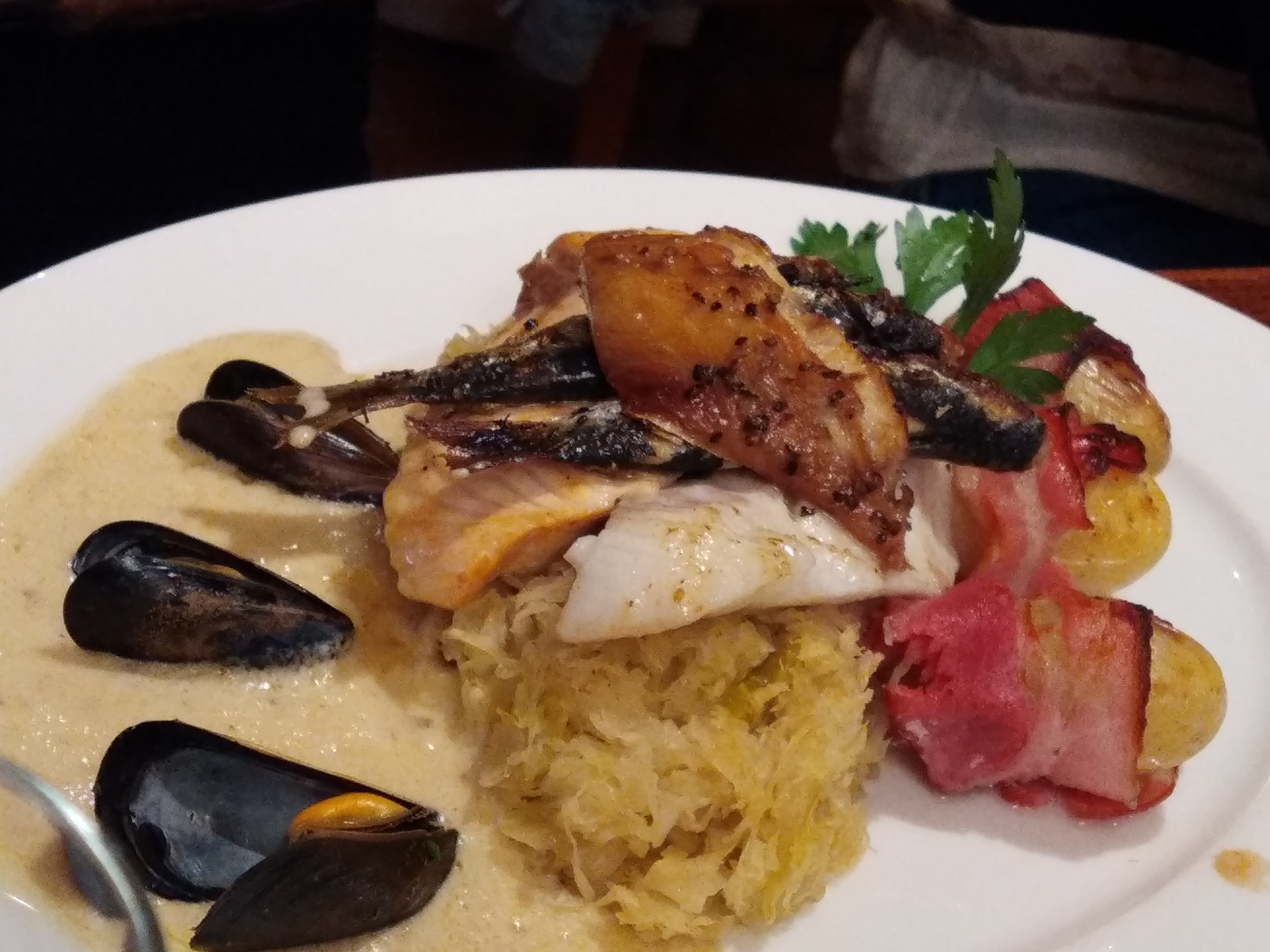 Très bonne choucroute de la mer, marmite de moules bien garnie.