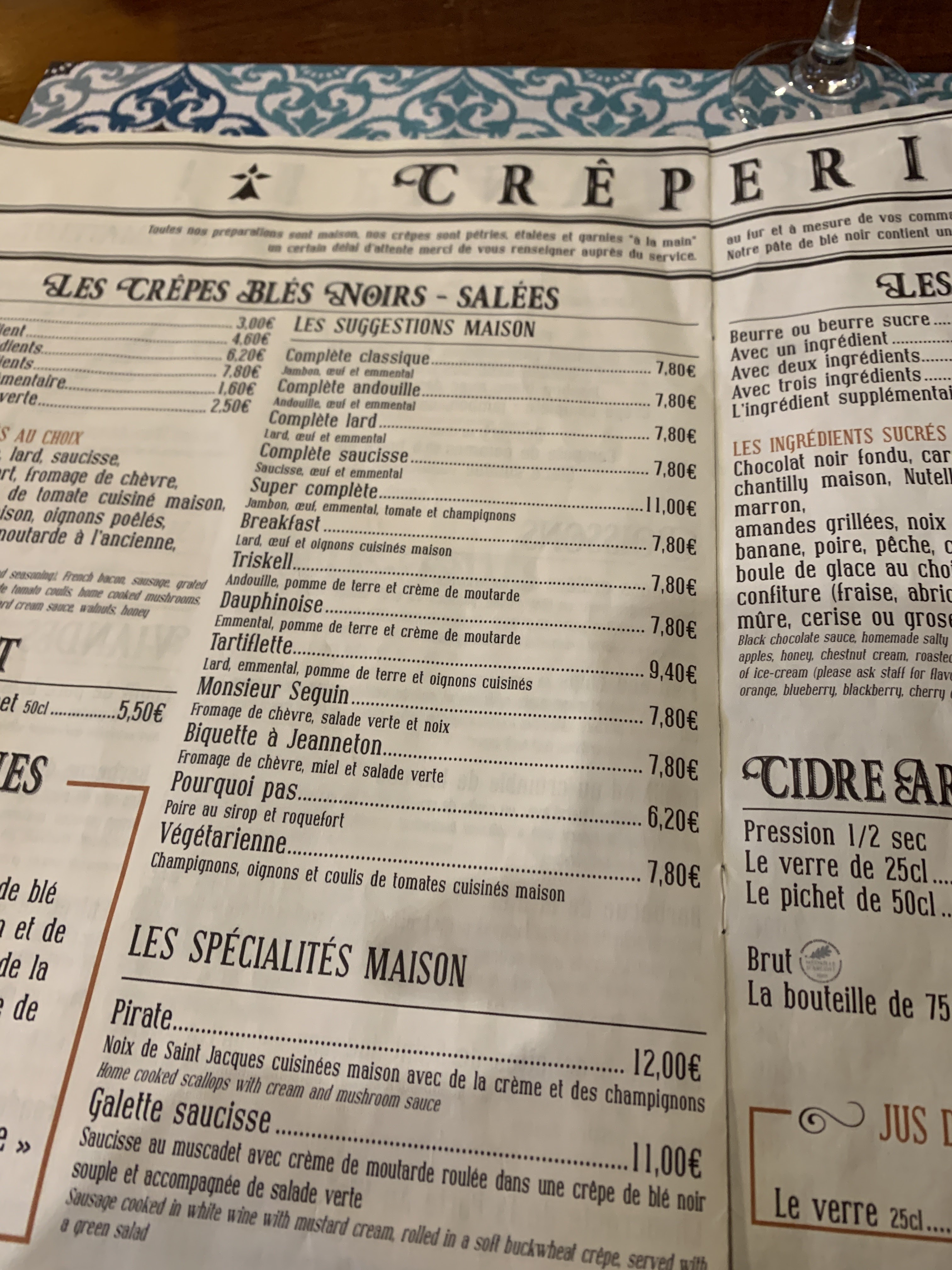 Excellences galettes, et crêpes. La crêpe au beurre sucre est de loin la meilleure qu’on ait mangé depuis le début de notre séjour. Prix tout à fait abordable !
