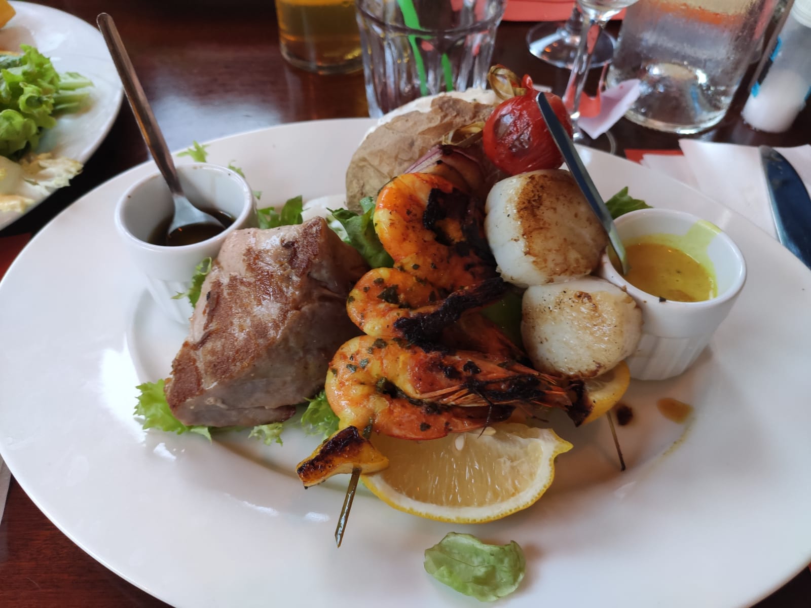 Après une ballade sur le marché de Concarneau (vendredi matin) nous avons visité la magnifique ville close une ville fortifiée. Pour nous régaler nous avons choisi La Porte Au Vin et nous n'avons pas été déçu. Brochette de la mer avec de belles St Jacques et beaux morceaux de thon mi-cuit accompagné d'une belle pomme de terre. Chèques vacances acceptés. L'accueil est sympathique. Encore une bonne adresse 👍
