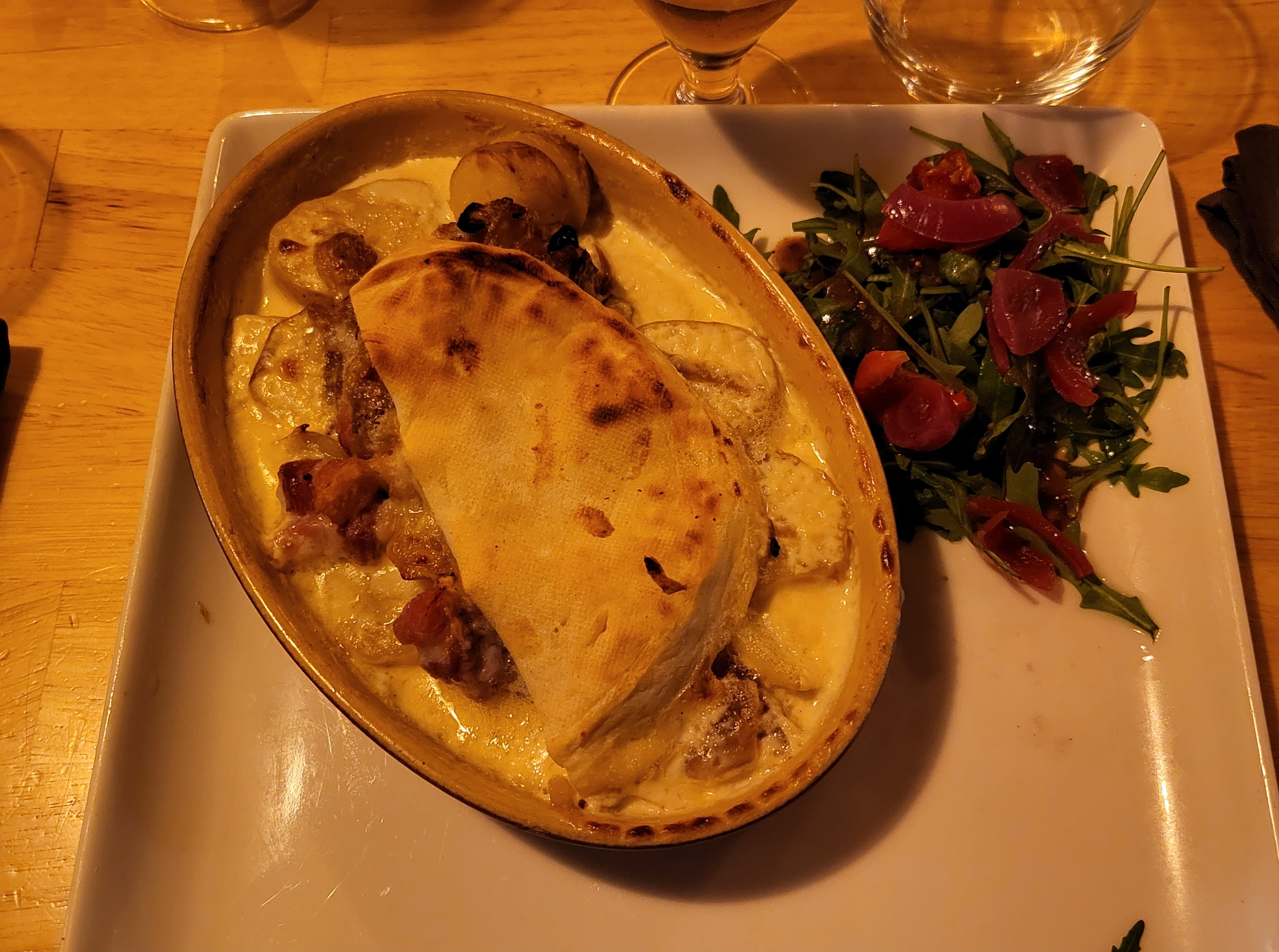 Saint felicien roti flambé au génépi avec un vin blanc. Servi vers 22h. Excellent