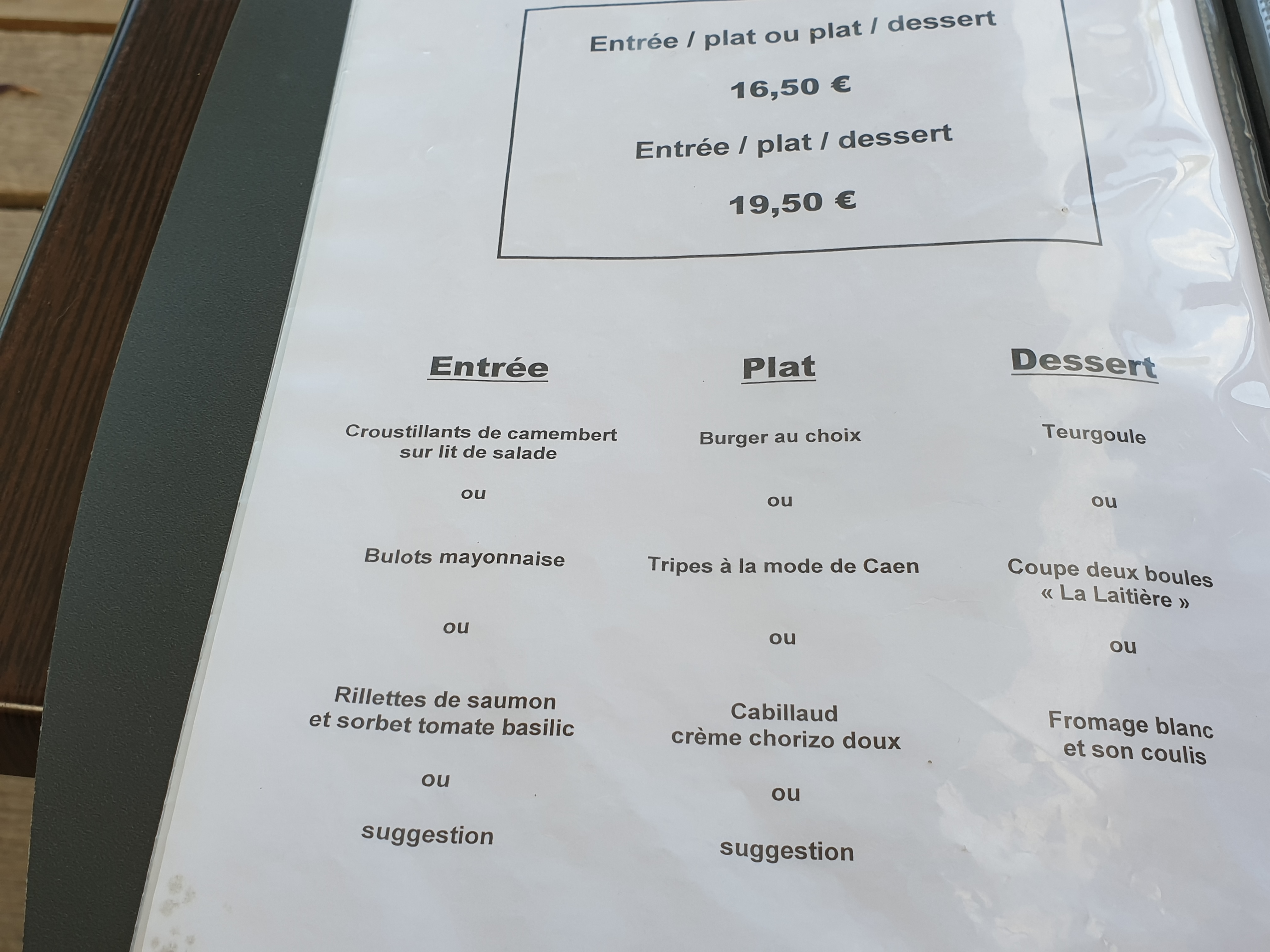 Bjr cadre sympathique, gros bémol quand on parle de frites désolé les frites froides et molles. creme brûlée liquide, et pardon mais pour une terguoule soit disant a cuit 6 heures un aspect bizarre , vous auriez pu également préciser que la glace était servie liquide.question service nous sommes tombés sur un serveur sympa en observant les autres soit ils se sont fait engueuler avant ou on leur a pris le sourire .service lent et oublis fréquents dans les commandes.les toilettes déplorables sale sans papiers ni savon pour les mains. Je ne recommande pas ce restaurant surtout dans un lieu touristique où nous devrions s'attendre a bien mieux que cela.
