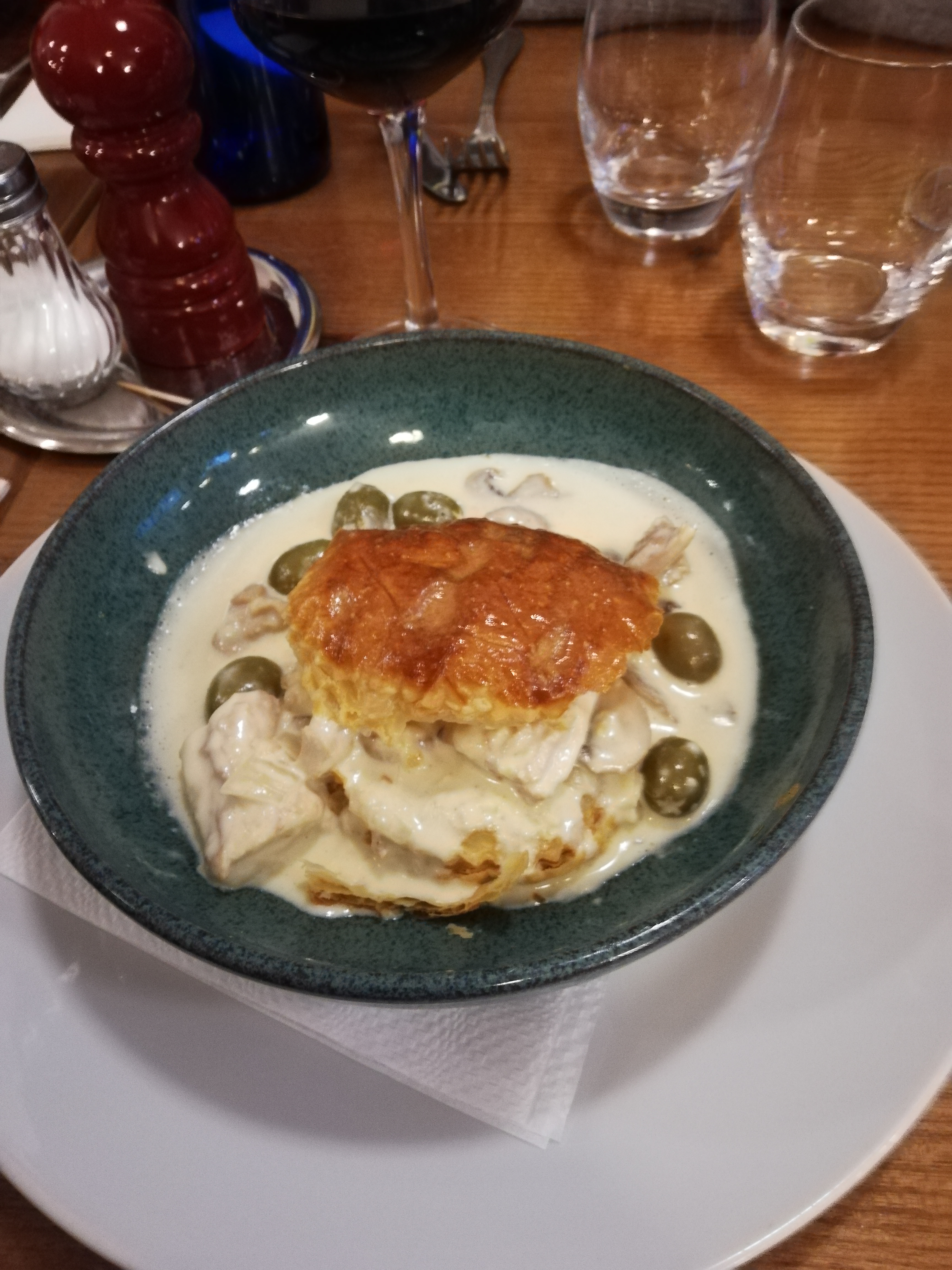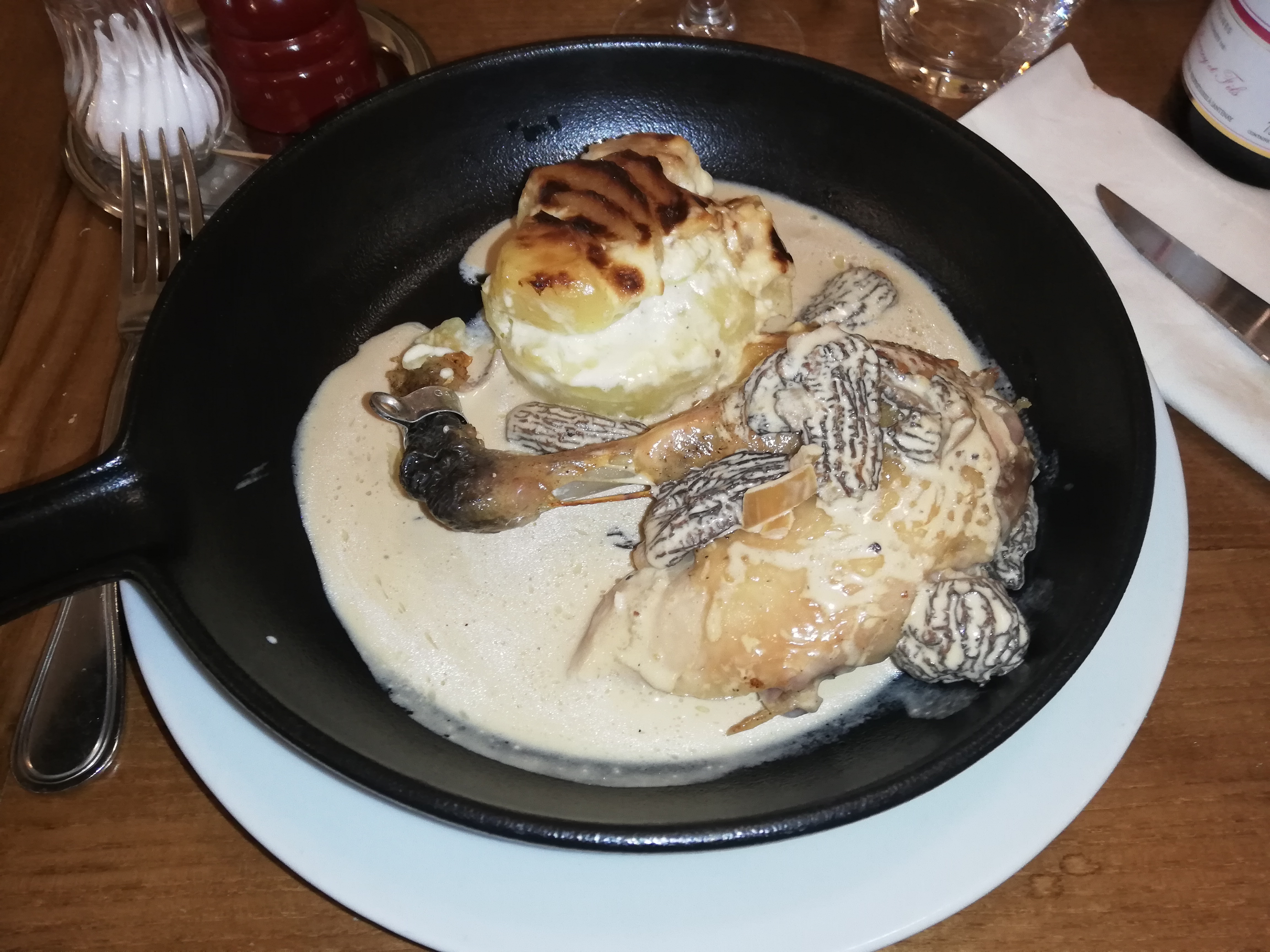 Jour de marché avec peu de monde, repas à 24,50 , Entrée, salade chèvre aux lardons copieuse et bonne, poulet à la crème, champignons, pattes, très bon et très copieux, crème brûlée très bonne, en un mot un excellent repas pris dans une salle agréable avec bonne ambiance.