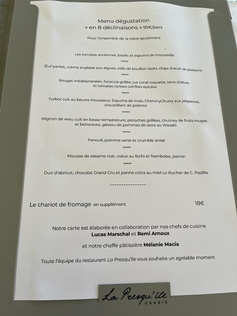 Avant de faire une balade dans les calanques nous voilà partis faire une pause gastronomique à Cassis. Le restaurant est super bien situé en dehors du centre (😅) nous avons pris le menu en 8 services pour goûter un peu à tout. Cuisine assez simple et bonne avec quelques associations sympa, un bonne accueil. Un petit bémol sur la partie dessert, le dessert chocolat top, la tarte est elle un peu trop neutre… l’ensemble reste bien. Niveau prix on est sur un budget 1 étoile…