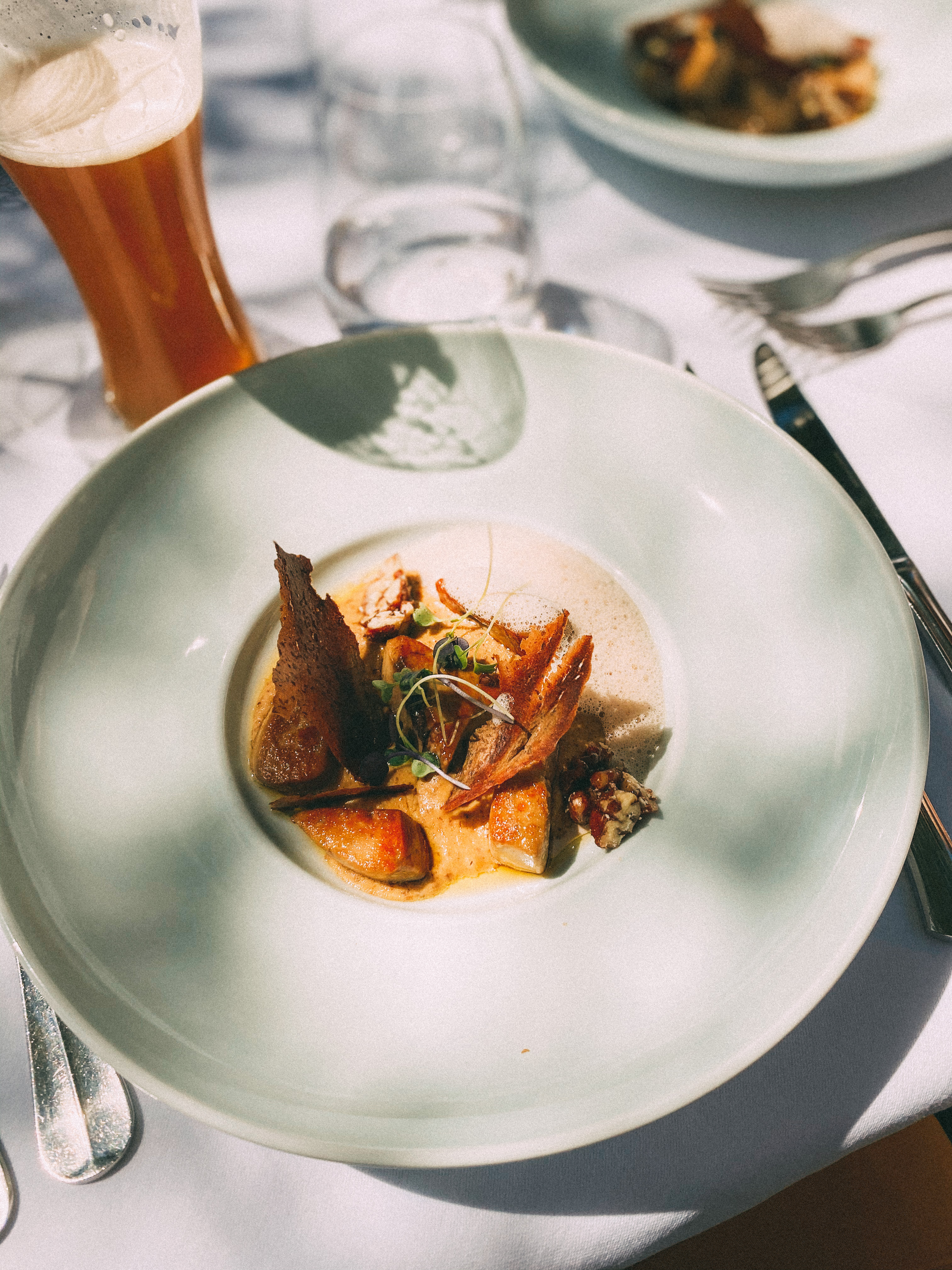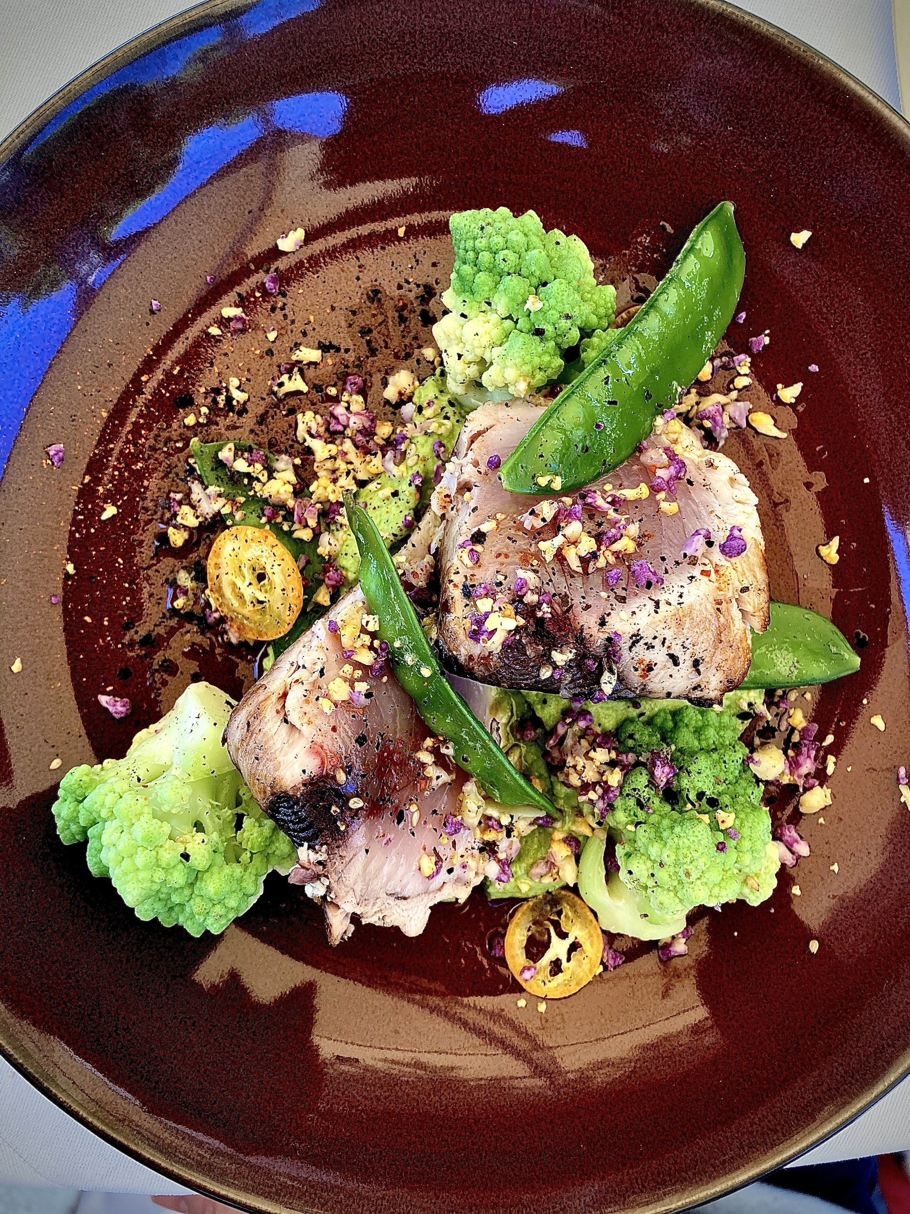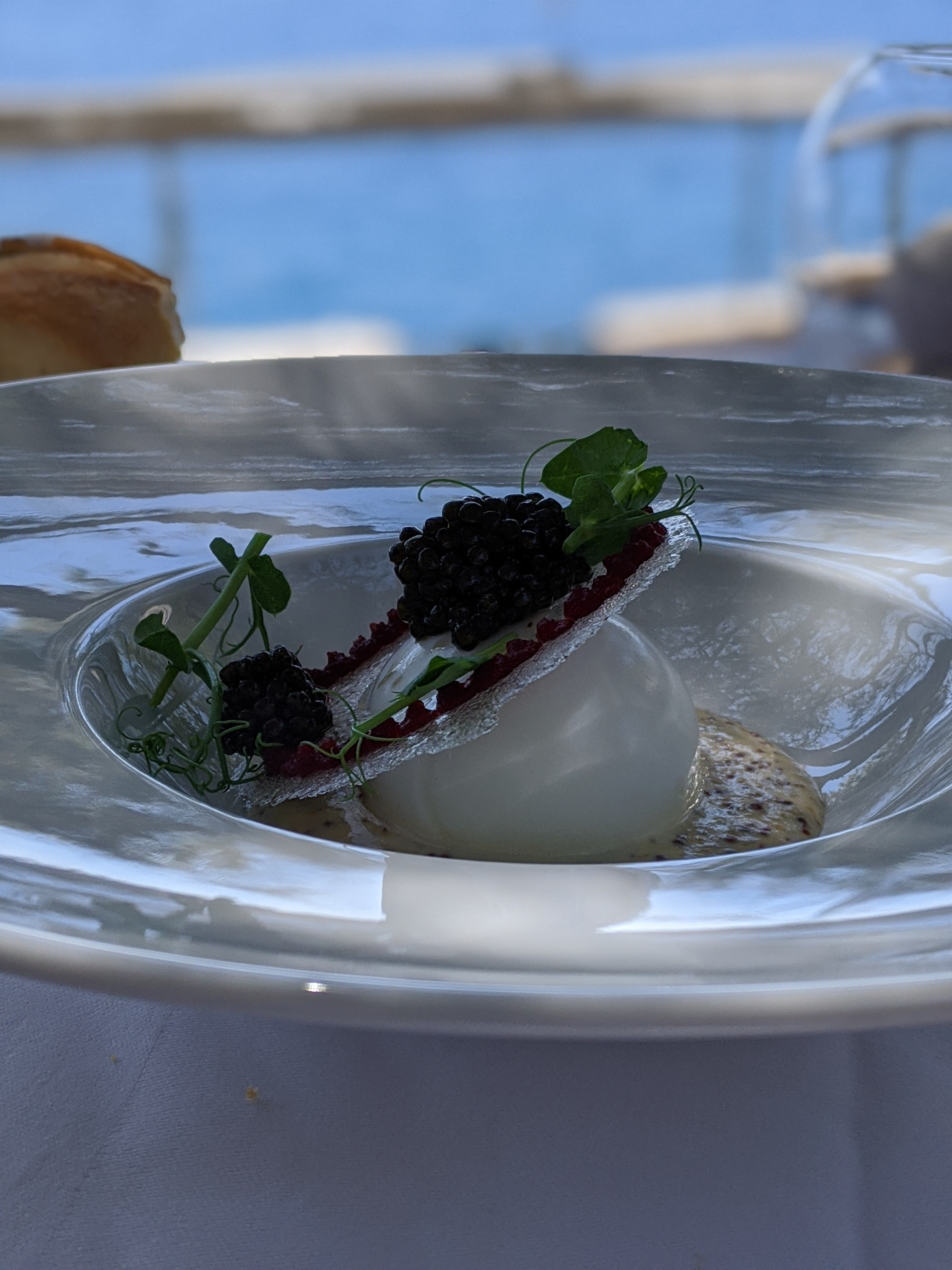 Deux menus possibles lors de notre passage à la Presqu’île, avec de nombreux choix que ce soit pour les entrées, les plats ou les desserts. Une cuisine travaillée et originale, et un service au top du top ! Point négatif, la terrasse de la brasserie juste sous la notre, les photos sont prises d’un autre angle et nous ne nous attendions pas à avoir tant de monde à quelques mètres de notre table … Vraiment dommage car le cadre est magnifique !