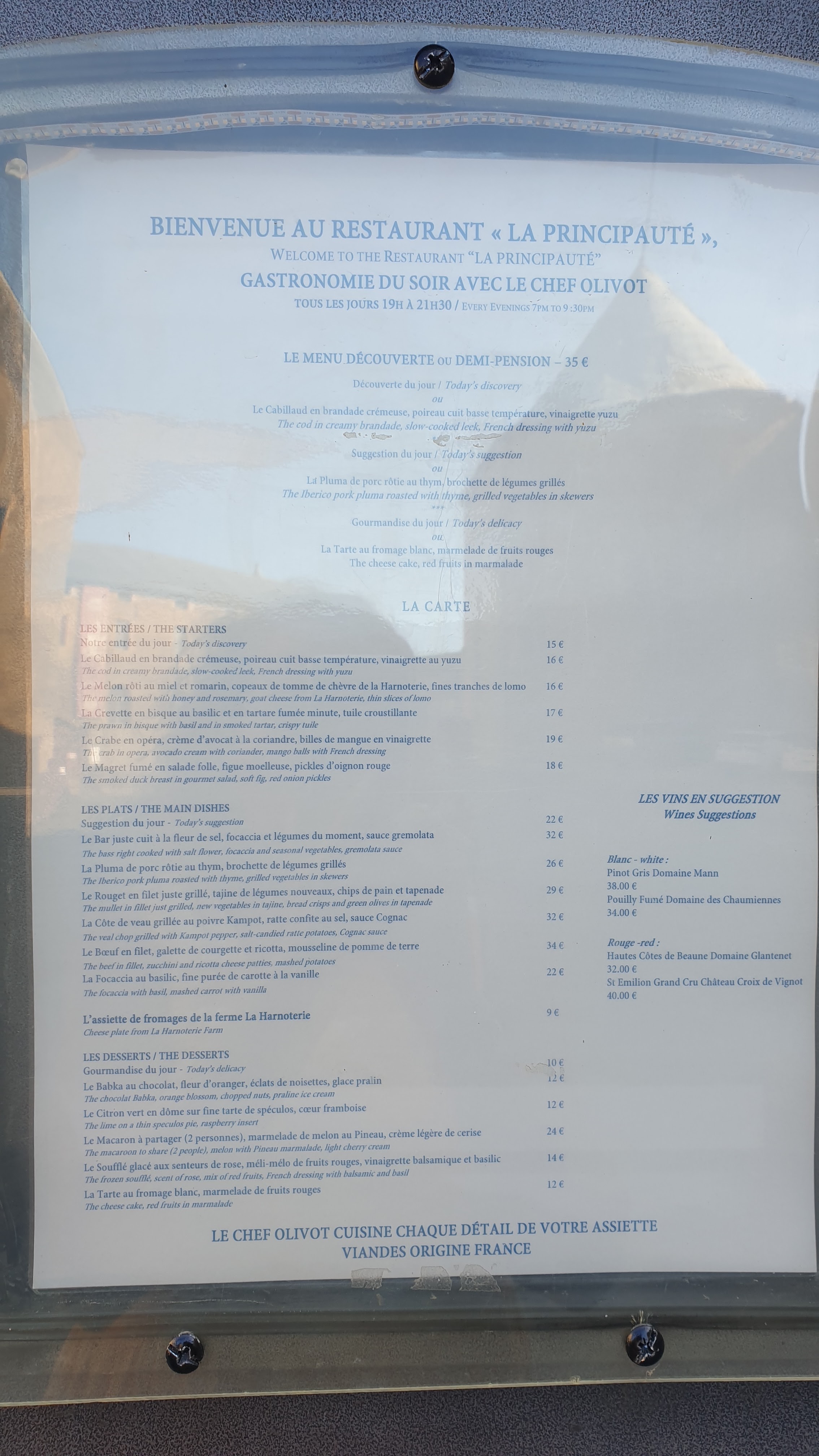 Le rapport qualité prix n’est pas au rdv. Un risotto avec rouget, plutôt un riz collant sans saveur et du poisson grillé. Ris de veau pas nettoyé de ses peaux et cuisson à cœur saignante, je ne suis pas fan. Pareil pour les rognons. Les menus manque d’équilibre d’un jour à l’autre.. soit trop léger soit trop lourd. Un jour c’est potage , rouget risotto et brioche, le lendemain c’est crème brûlée de foie Gea, rognon ris de veau et gâteau coco.. Personnellement je trouve la cuisinée en deçà du lieu et des appellations des plats.