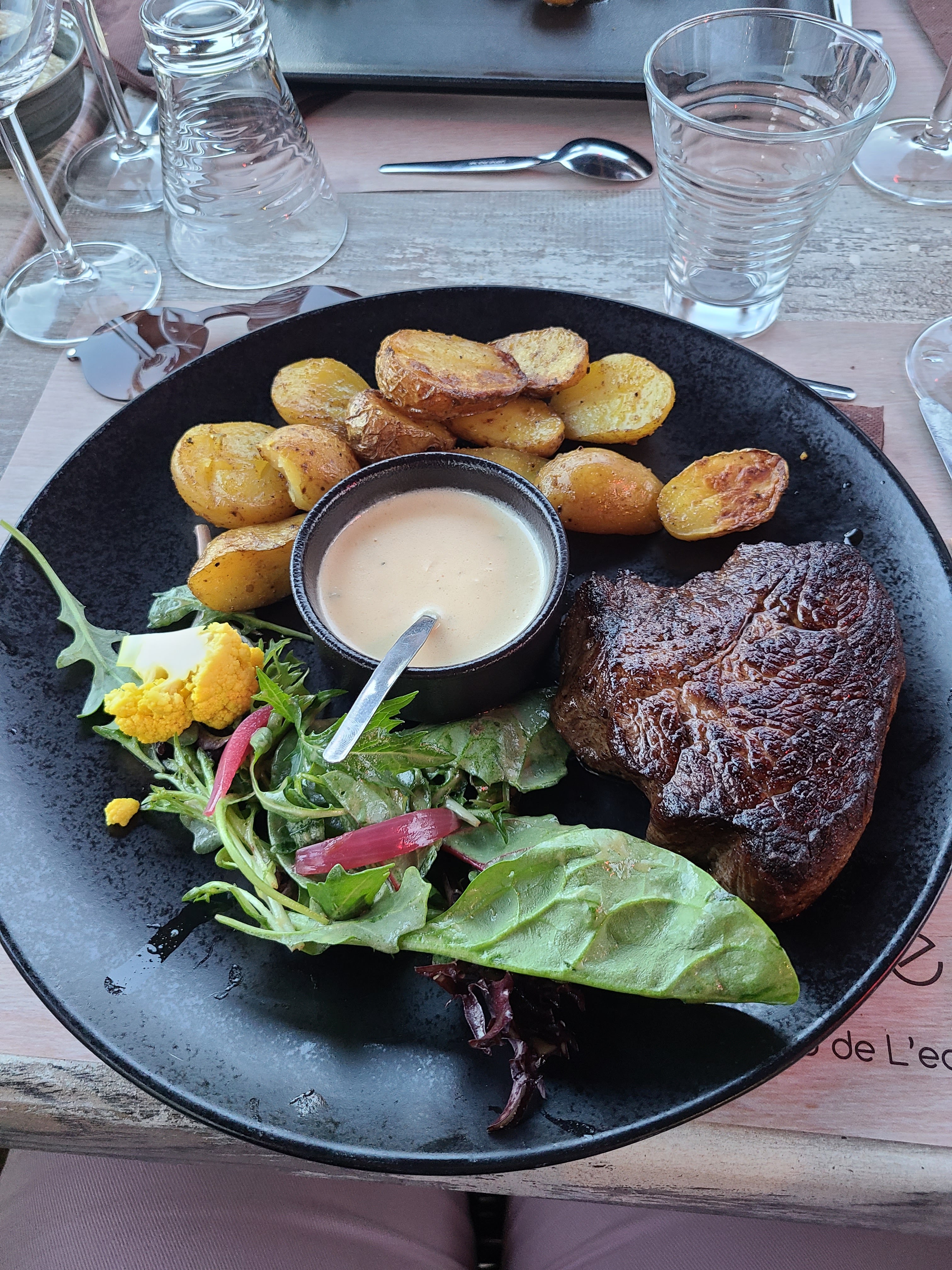 restaurant avec terrasse au bord de l'eau, serveur un peu tête en l'air mais sympa. Manque un peu de quantité dans les assiettes mais plats assez bons. Un peu déçue car il n'y avait plus le dessert que je voulais et si le fromage venait d'une bonne fromagerie ça serait top.