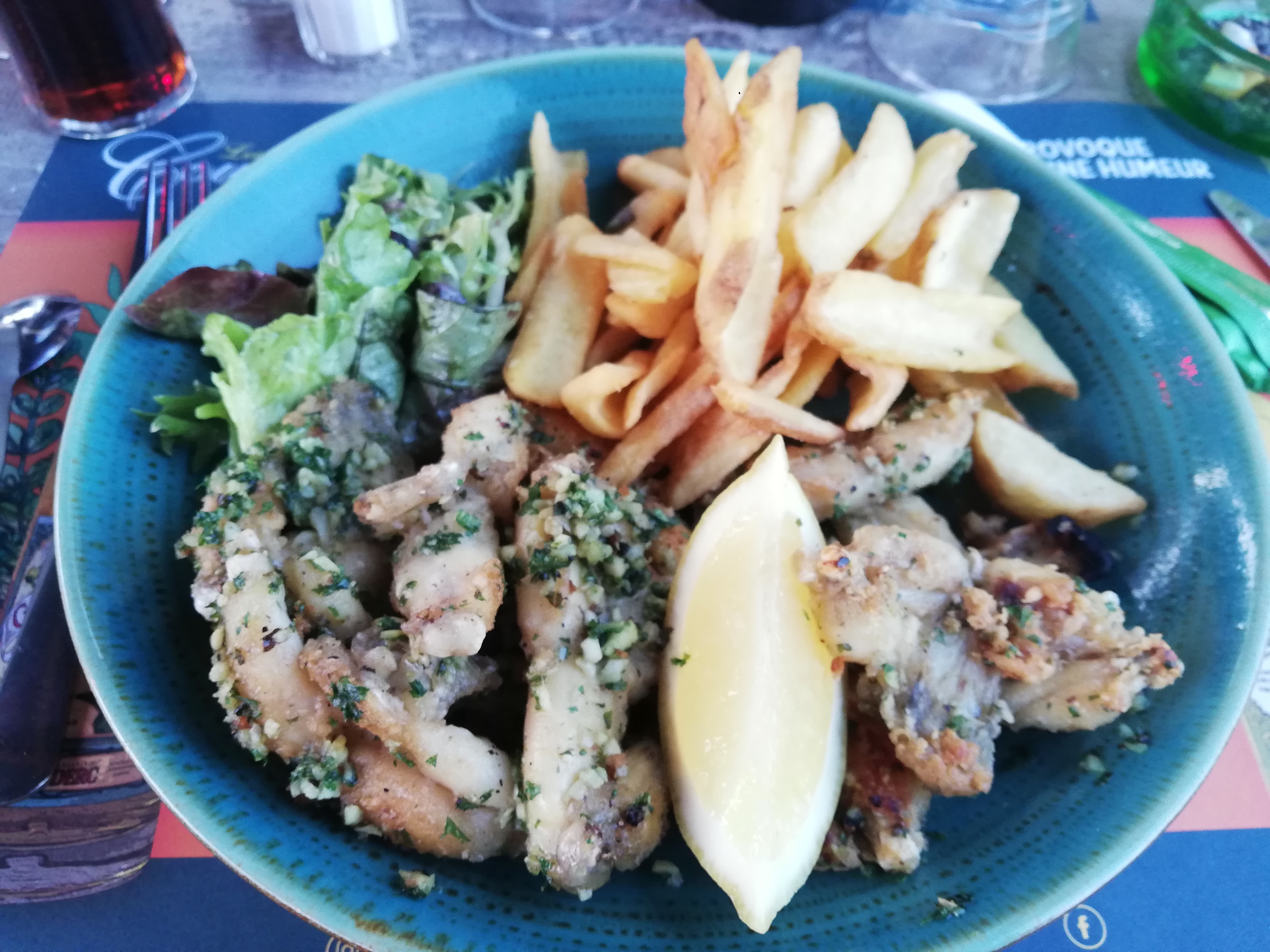 Nous sommes arrivés tard pour déjeuner, les plaques de cuisson éteintes , mais en insistant légèrement, on nous a gentiment proposé au choix un plat ou une salade. Cuisses de grenouilles, frites et salade , je vous assure, un régal. Un cuisinier que nous remercions et un serveur d'une très grande gentillesse