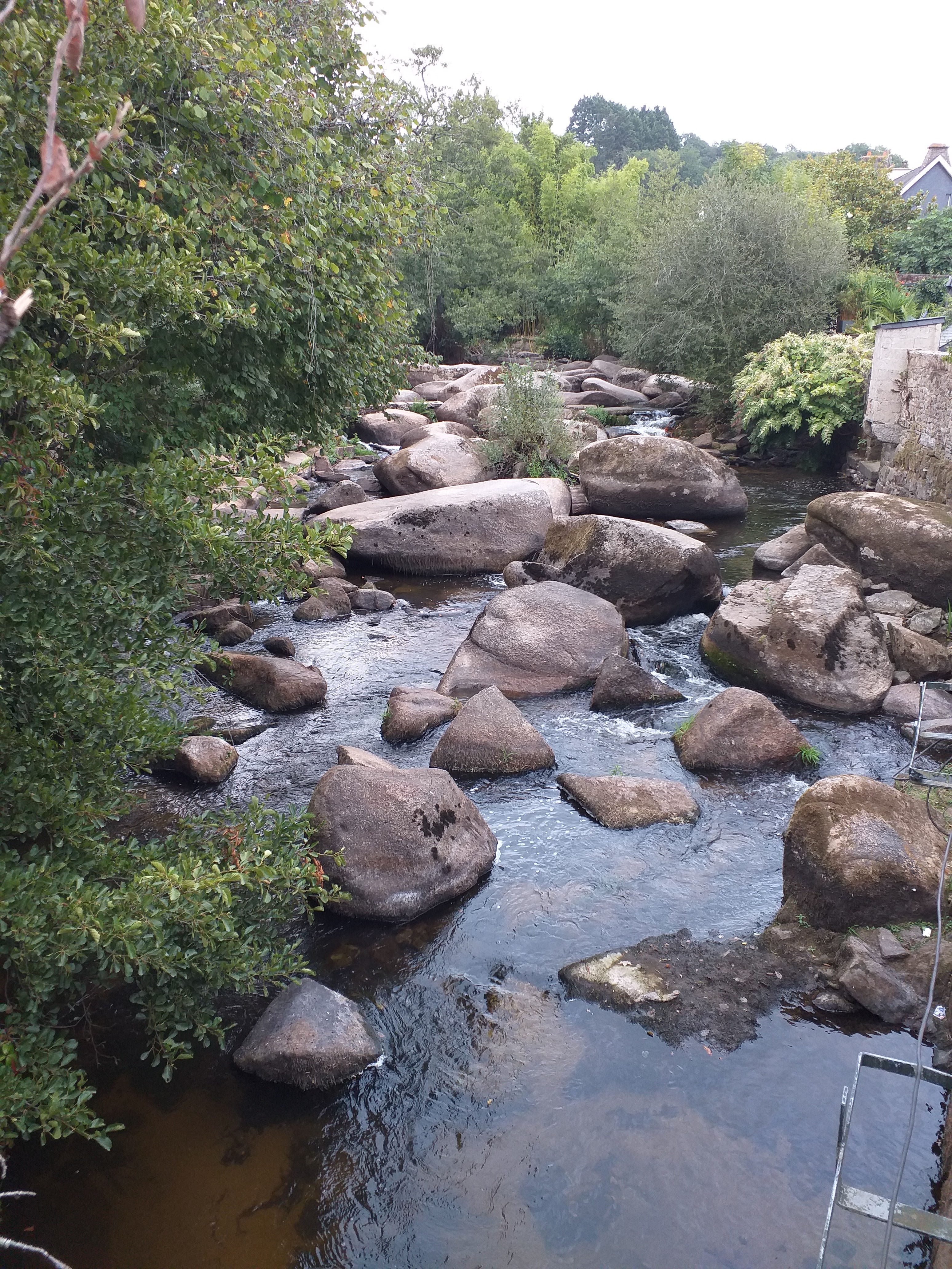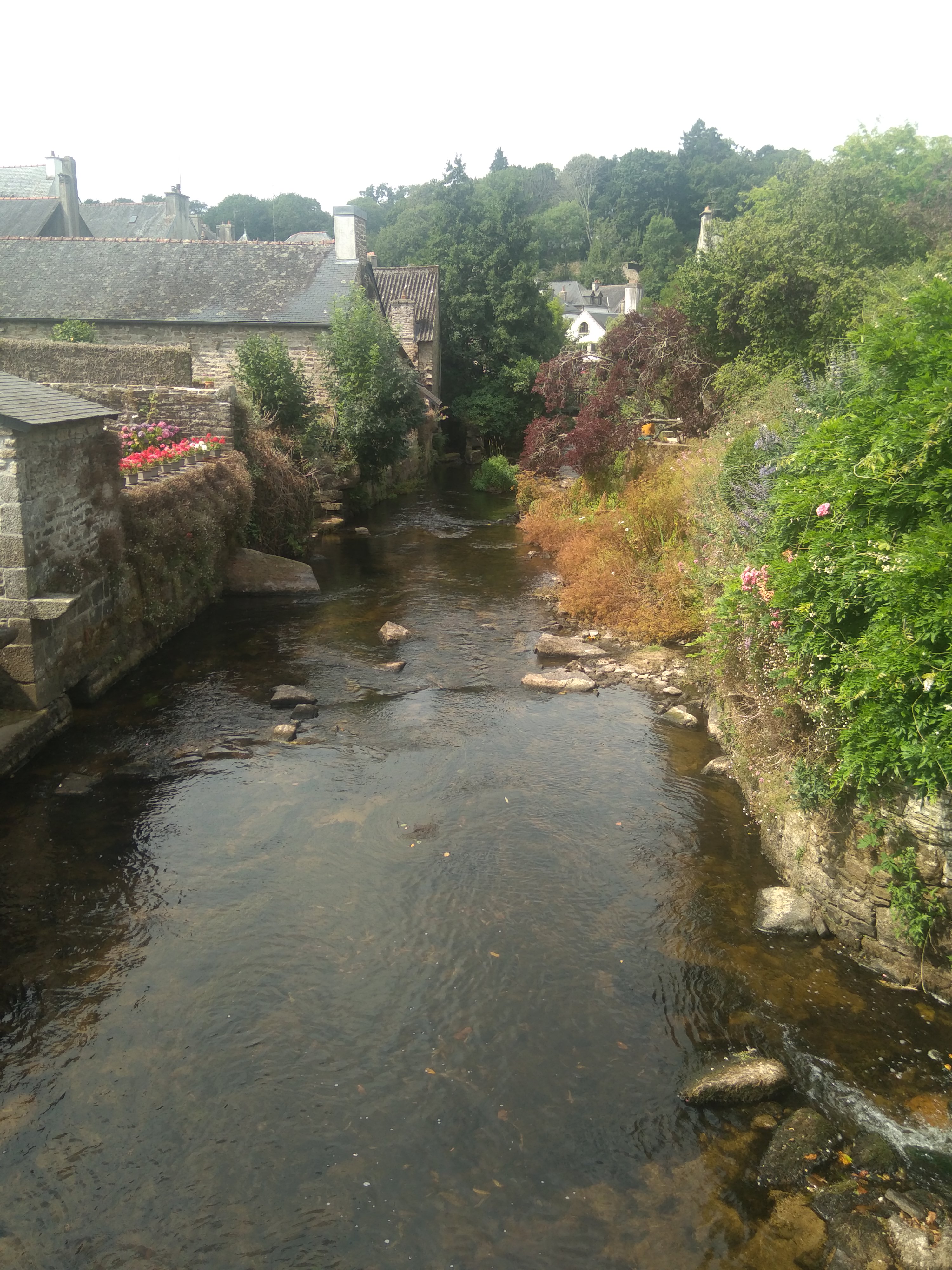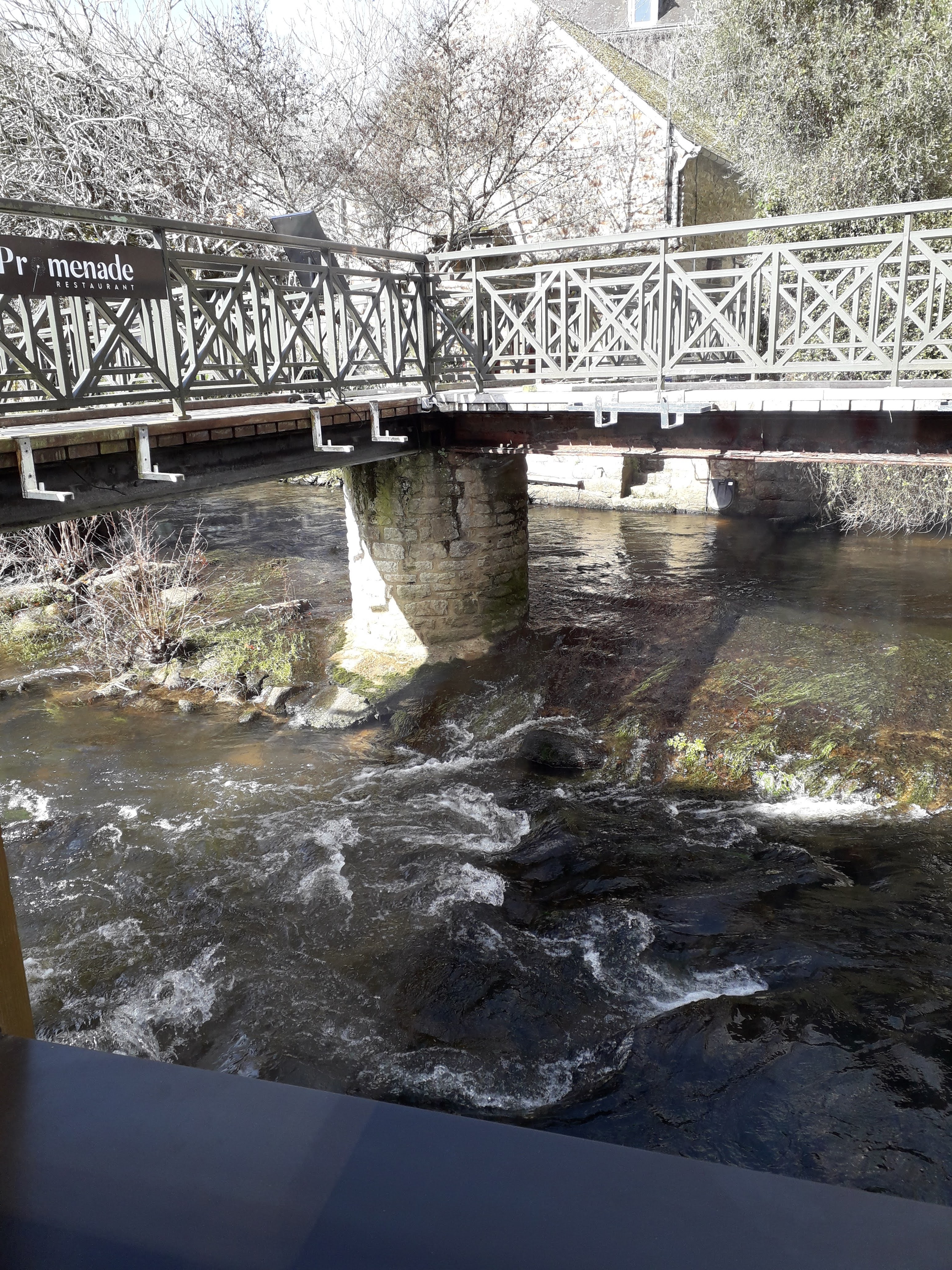 Ce restaurant bénéficie d'un site exceptionnel, au coeur de Pont Aven, et posé dans un écrin sur le bord de la belle Aven, il se trouve au calme dans une zone piétonne. L' accès se fait évidemment par un petit pont, d'abord sur la terrasse à traverser, et que je décline à cause des fumeurs. La salle de restaurant est spacieuse, lumineuse avec toute une façade qui longe l'Aven. Il est recommandé de prévoir une réservation, possible aussi sur Google. L'accueil est sympa avec un personnel chic. En plus de la carte, le restaurant propose un menu du jour le midi avec une unique entrée, un plat, du poisson ce jour, et un dessert le fondant à la mangue. Choix du plat/dessert pour deux personnes. La cuisine est agréable et bien présentée. Le service impeccable. Petit bémol, une certaine attente au départ, mais bien excusable pendant les vacances d'été. Les touristes ont envahi Pont Aven. Attention au stationnement, très difficile en centre ville, la zone bleue ne tolère que 30 mn y compris pendant la pose déjeuner. Ce restaurant mérite une halte gustative, que nous referons avec plaisir après la saison touristique.