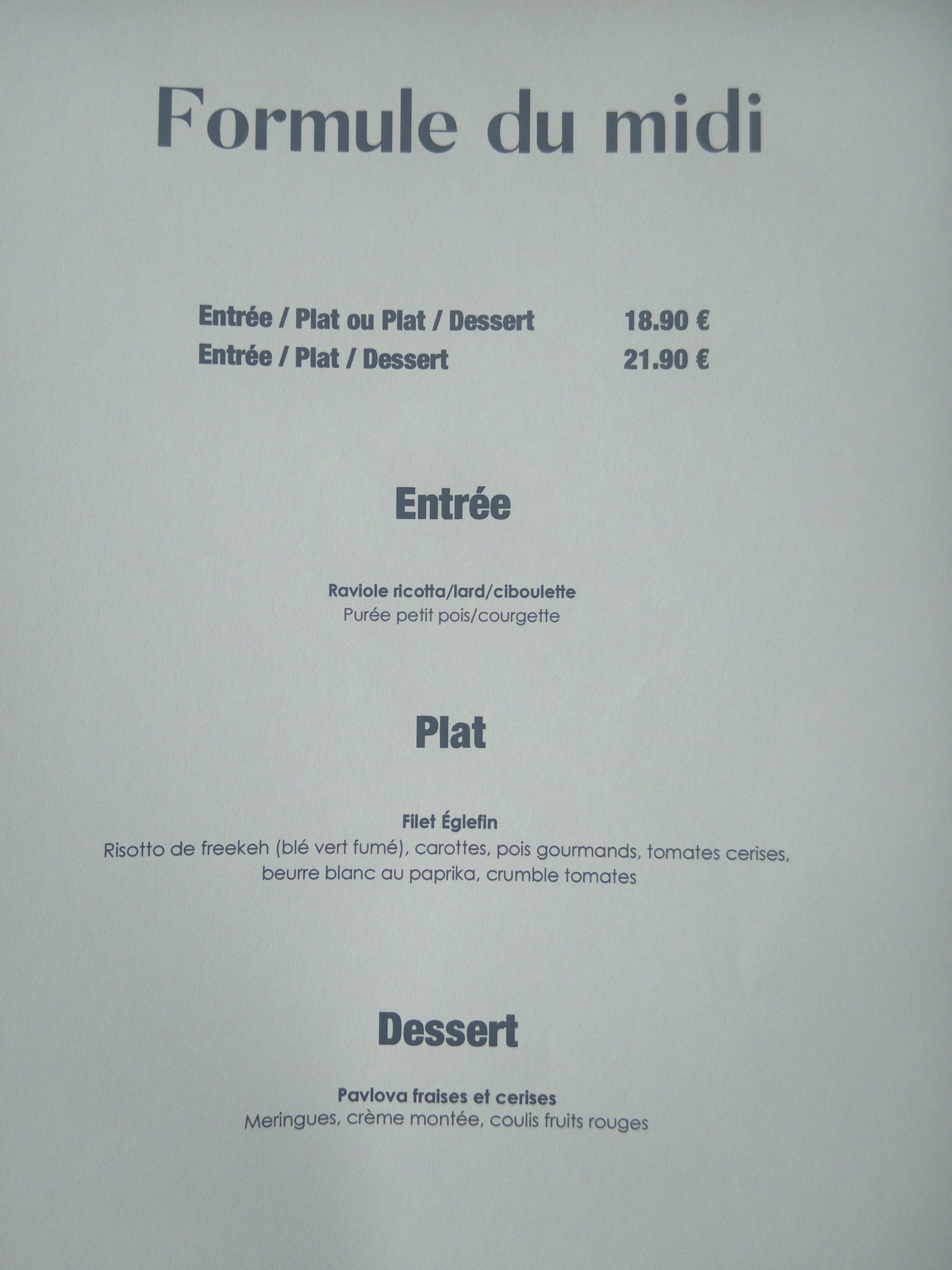Un vrai plaisir gustatif. Formule du jour à 25€ entrée, plat et dessert...un menu pluq que gastronomique. Un petit mot aussi pour la qualité du service et la gentillesse de la serveuse et du serveur.
