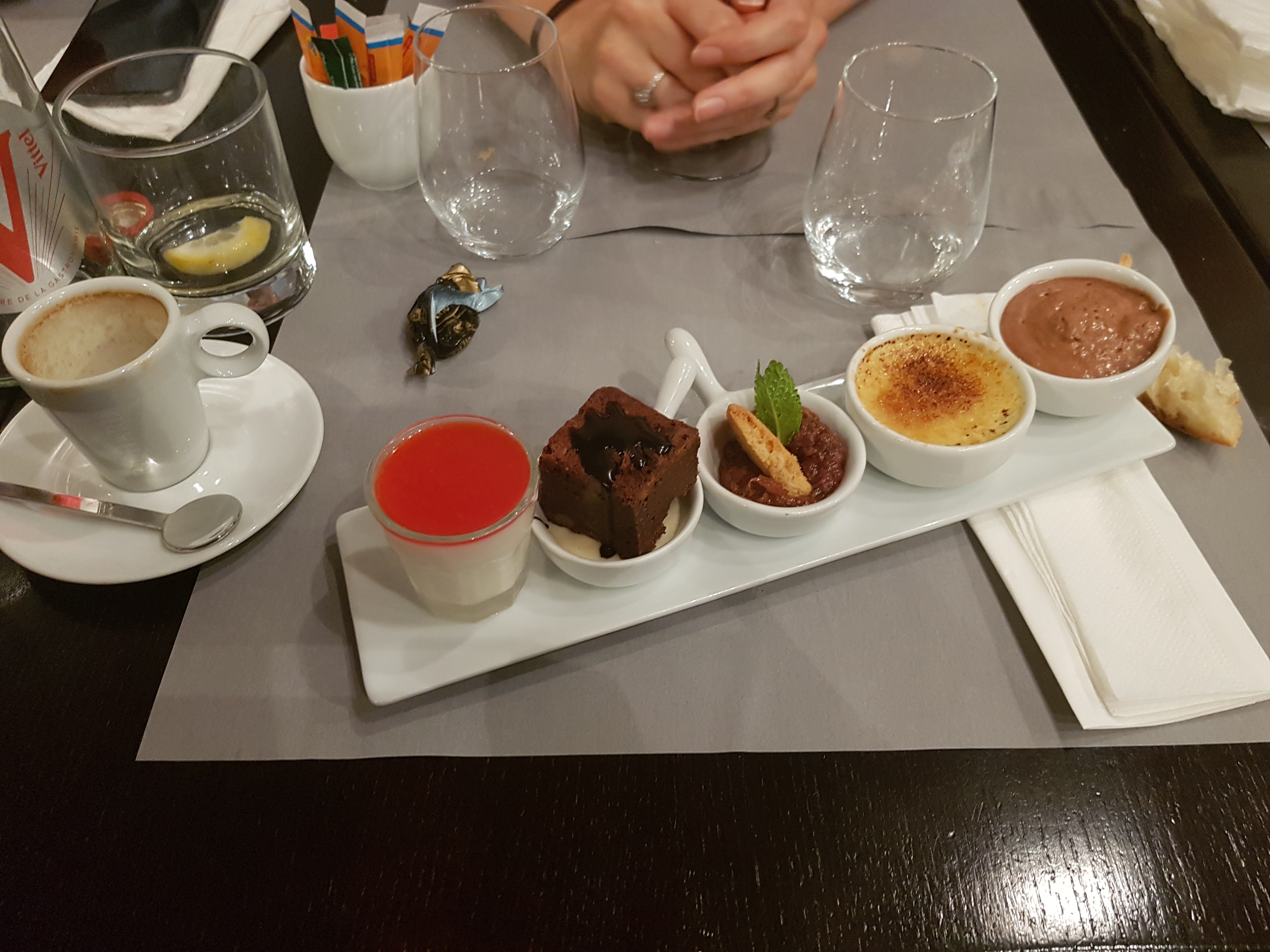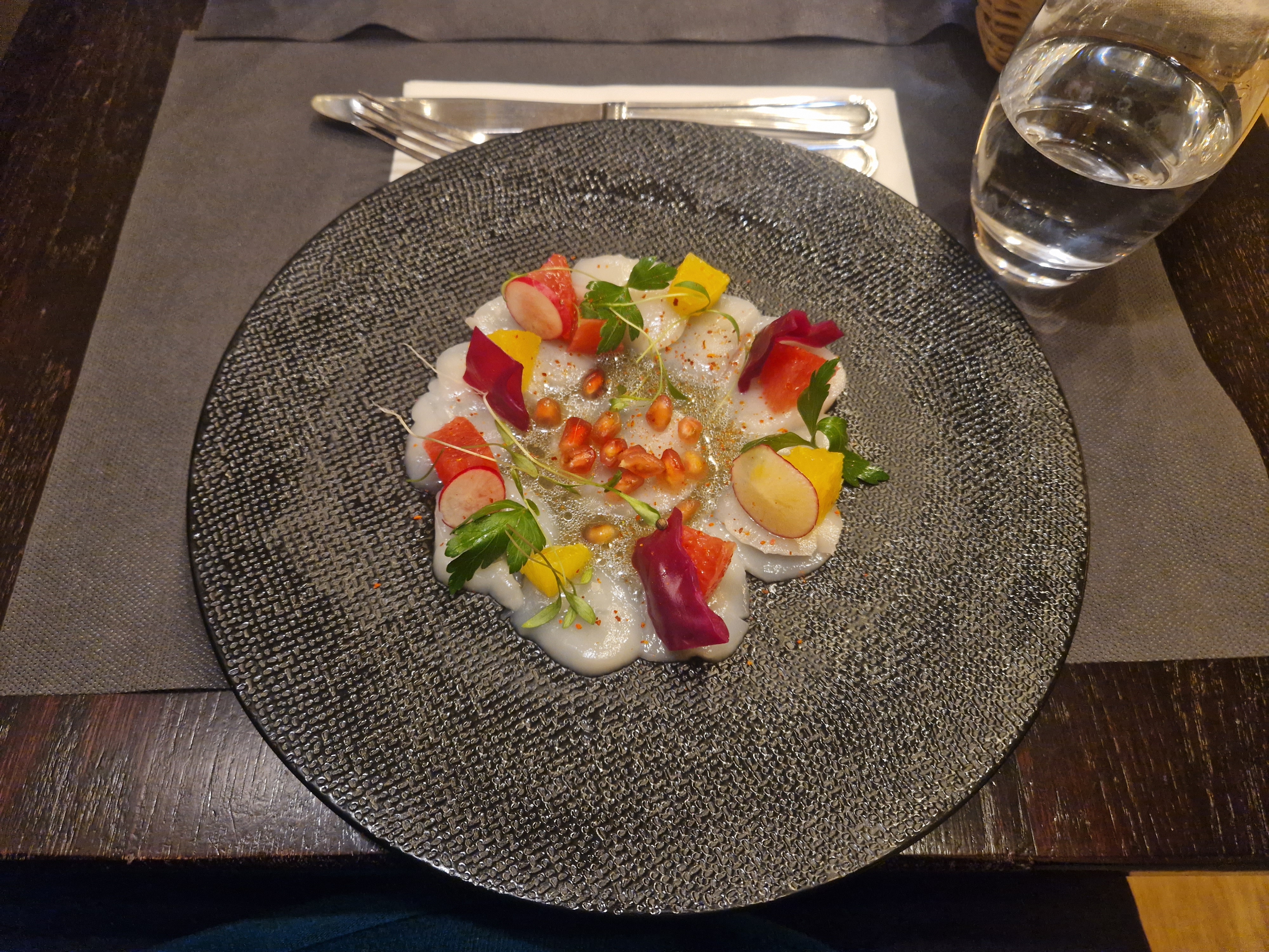 Bonne soirée avec une agréable surprise le plat (risotto gambas et st jacques) vraiment très fin, bon, malheureusement , je n'ai pas pu goûter le dessert (figues rôties) car il n'y en avait tous simplement plus (produits frais remarquable) mais le chef s'est excusé en nous offrant de délicieuse crèmes brûlées (à la menthe). Quant à l'entrée, je cherche encore la mayonnaise des œufs mayonnaise façon la puce! A propos du service, serveuse souriante, agréable mais service un peu long.