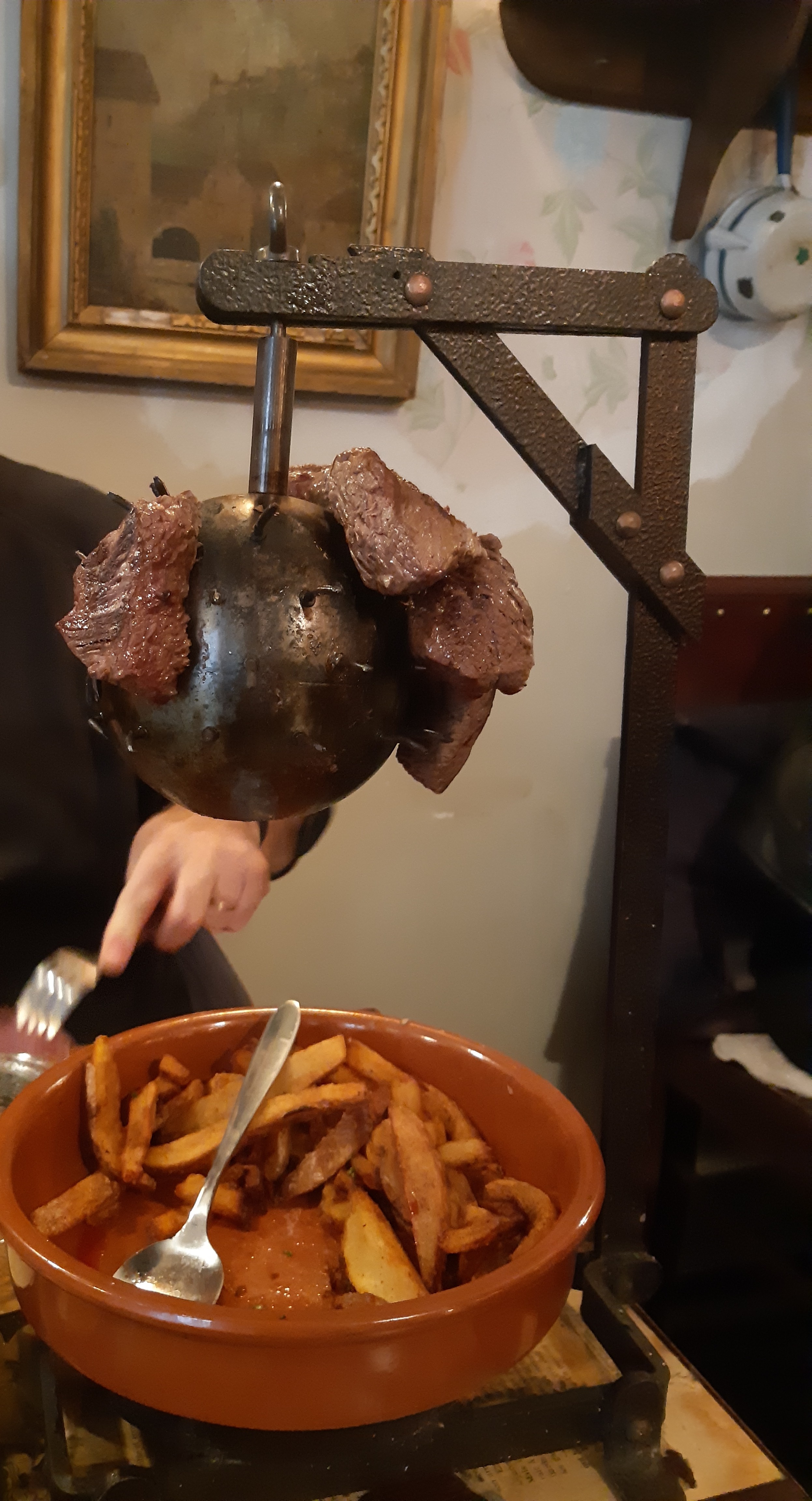 Très très bonne expérience, on se demandait ce qu'étaient les potences, mais on était loin de s'imaginer qu'on allait recevoir une VRAIE potence 😂 Mais cette fantaisie (très appréciée) n'enlève rien au plat, c'était vraiment très bon et copieux (on a eu du mal à terminer nos assiettes), la viande flambée au cognac était savoureuse et juteuse, et le gratin de pommes de terre au munster était excellente ! Les serveurs étaient aimables et souriants. Le rapport quantité/qualité/prix est vraiment très très bon !! 2 petits point négatifs: le gratin qu'on a trouvé un peu trop salé à notre goût, et le fait que les serveurs ne portaient pas de masques ( on a mangé en terrasse, donc pas tellement grave en soi ) On hésitera pas à revenir chez vous si nous repassons dans le coin, c'est certain !! merci pour ce délicieux plat !