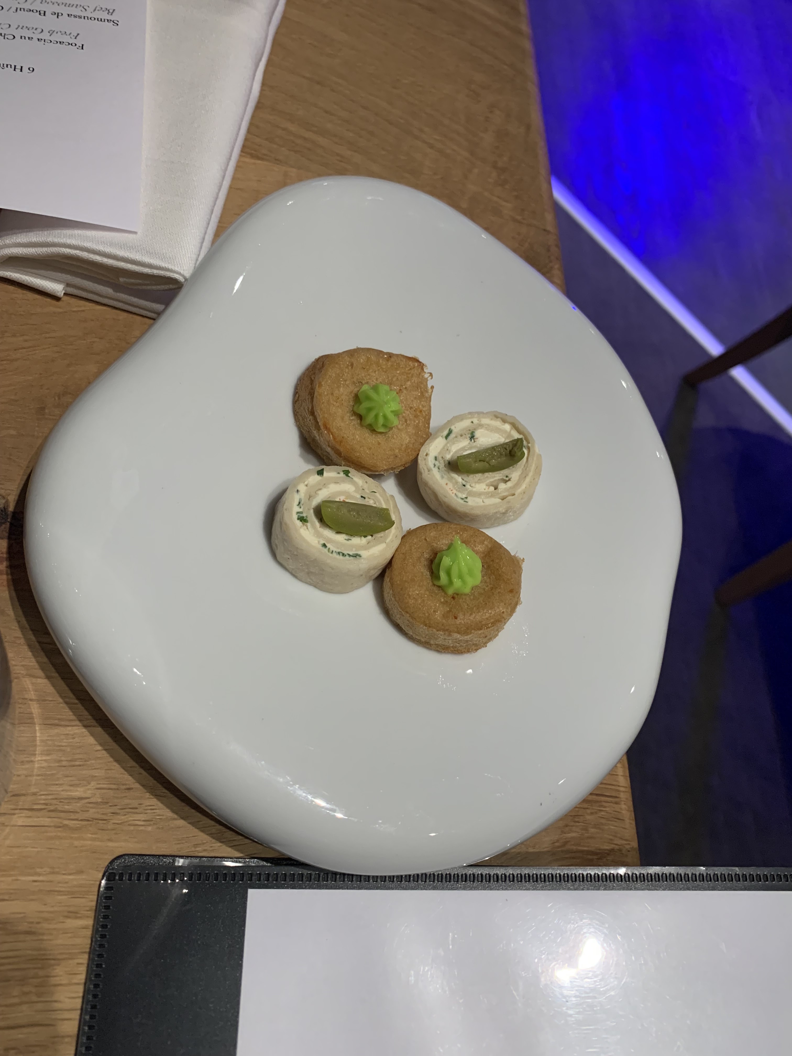 Service agréable Entrée d’huîtres bonnes , sans plus. La présentation étant plus esthétique que pratique: le sel restant sur les mains Surpris par l’avant-goût composé de glace au concombre et de chantilly aux formages de chèvre. Demandez en à la serveuse. Plat de magret de canard très bon pour la viande, la garniture n’étant que ..de la garniture: la purée de carotte ainsi que les dès de légumes ne rajoutant rien aux plats. La sauce du canard étant cependant le lien indispensable du plat. Mousse au chocolat bonne , cependant le dôme de chocolat étant trop dur pour le casser, il m’a fallu plusieurs tentative pour réussir à goûter un morceau du dessert. Le praliné se cachant au dessous de la composition était simplement délicieux.