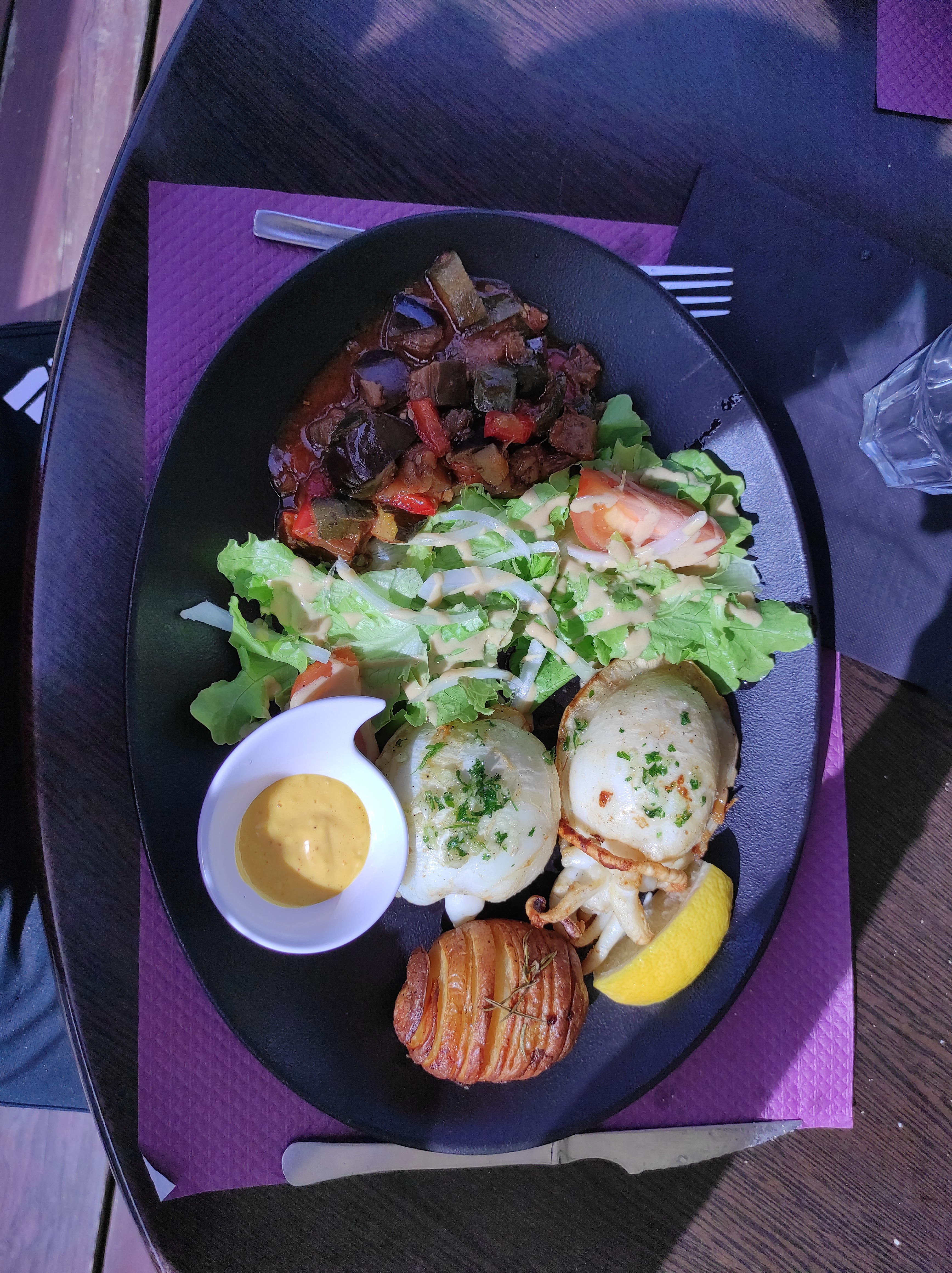 Seiche à la plancha bien tendre et accompagnement très bon. Et pour ma part cela faisait bien longtemps que je n avais pas mangé une bourride aussi bonne avec de vrais morceaux de poissons !!!! Très bon moments et excellente surprise !!!!
