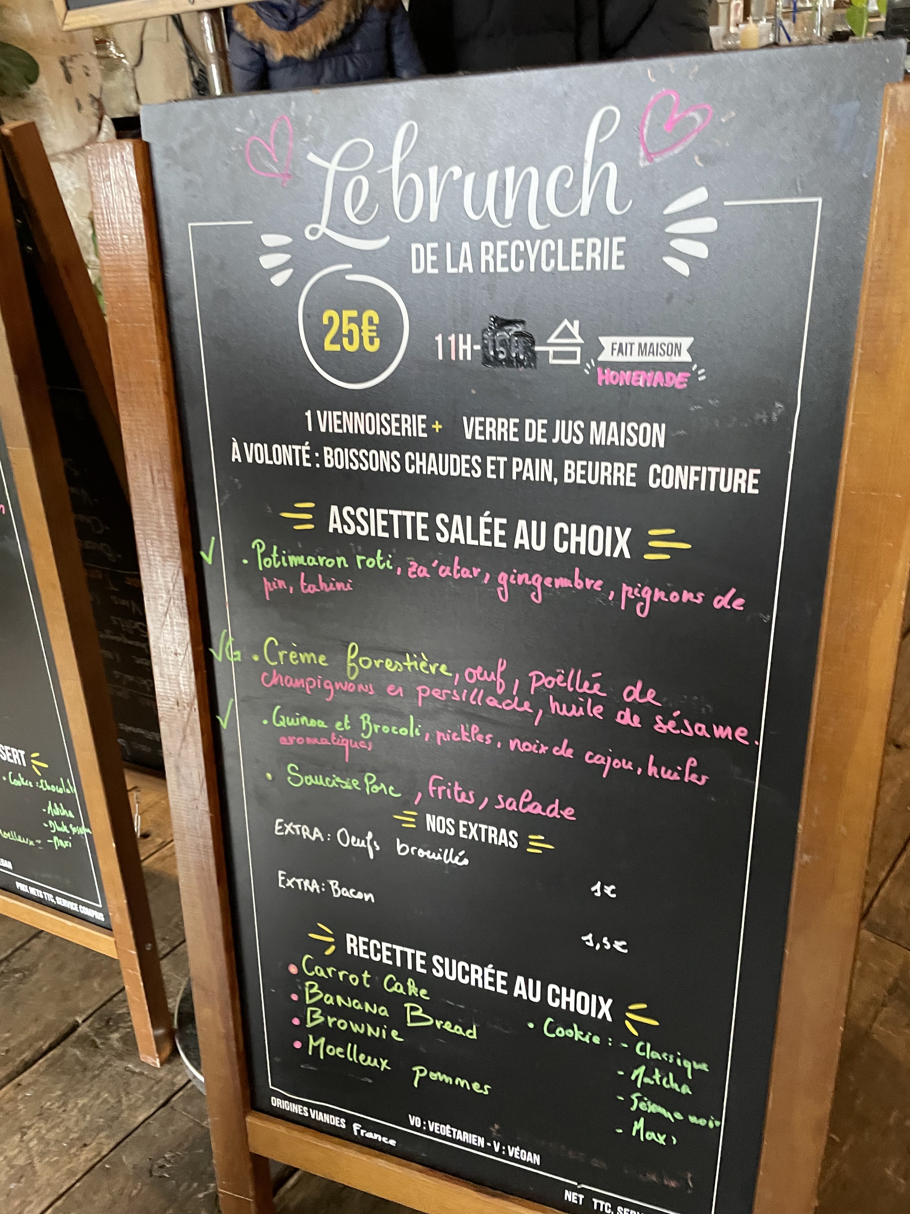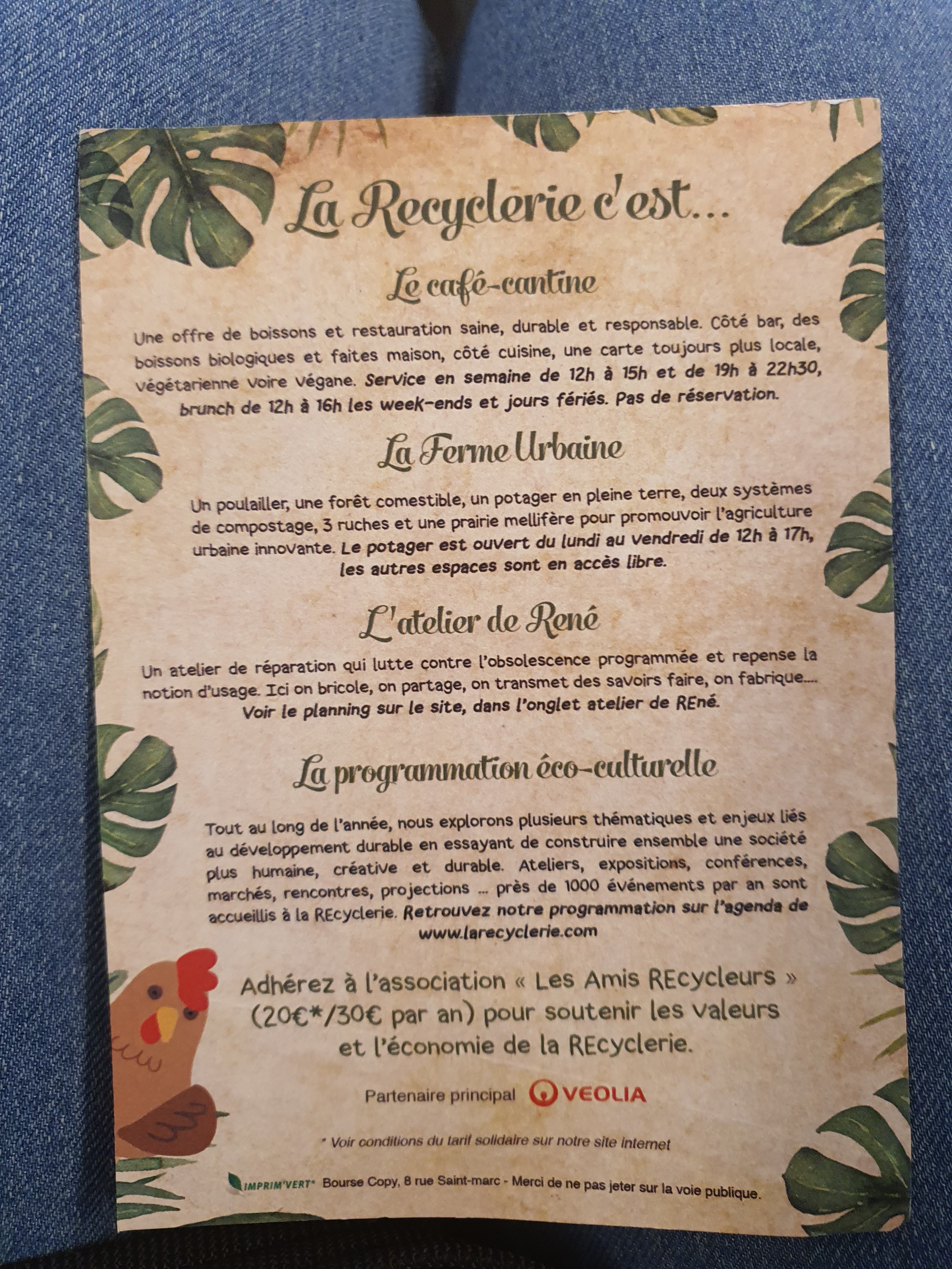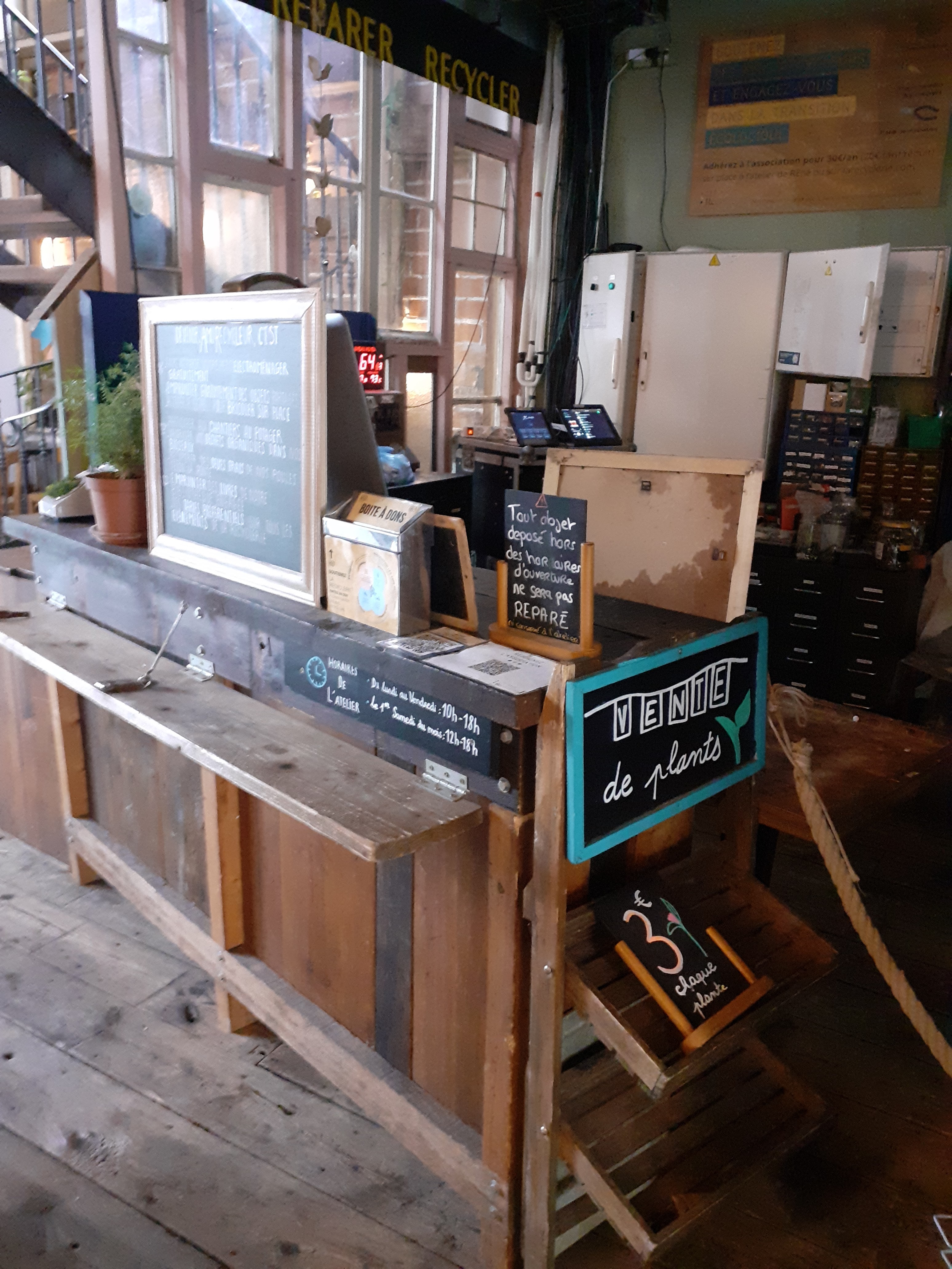 Il existe bien peu d'endroit aussi agréable que celui ci, se trouvant d'ailleurs, en plein coeur de Paris, entre les vendeurs de cigarettes et les kébab hallal. J'y ai dégusté un bissap ainsi qu'un petit brownie, tout à fait goûtus. Le froid m'a peu être un peu gâché le plaisir du casse-croûte en extérieur. Le projet de la recyclerie en elle-même est fantastique, rendre à la population sont autonomie, être plus résilient face à l'avenir. Très très cool.