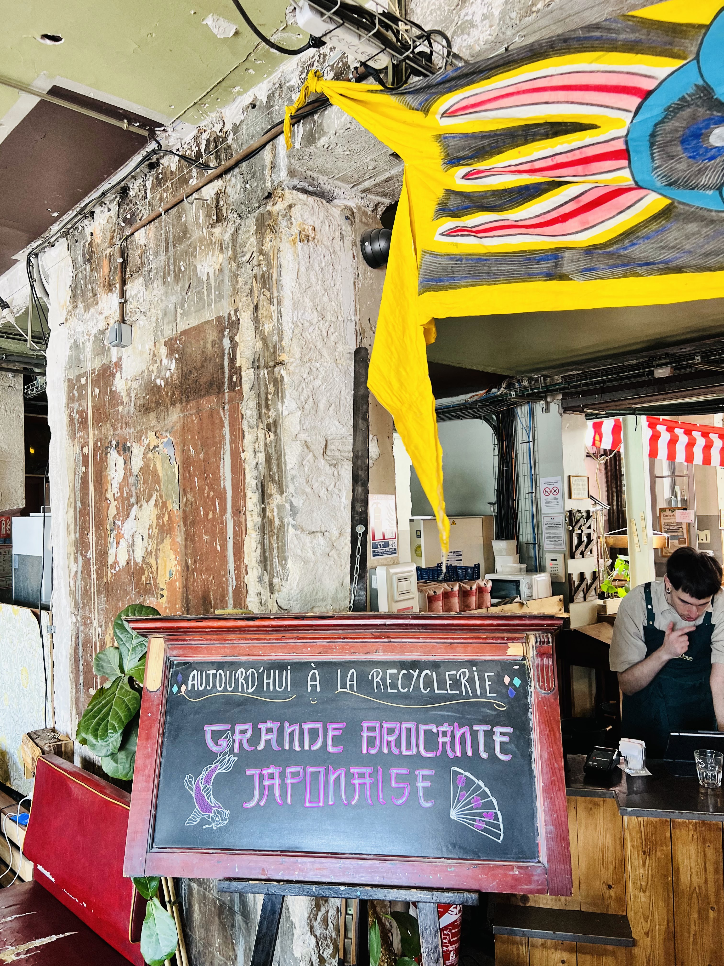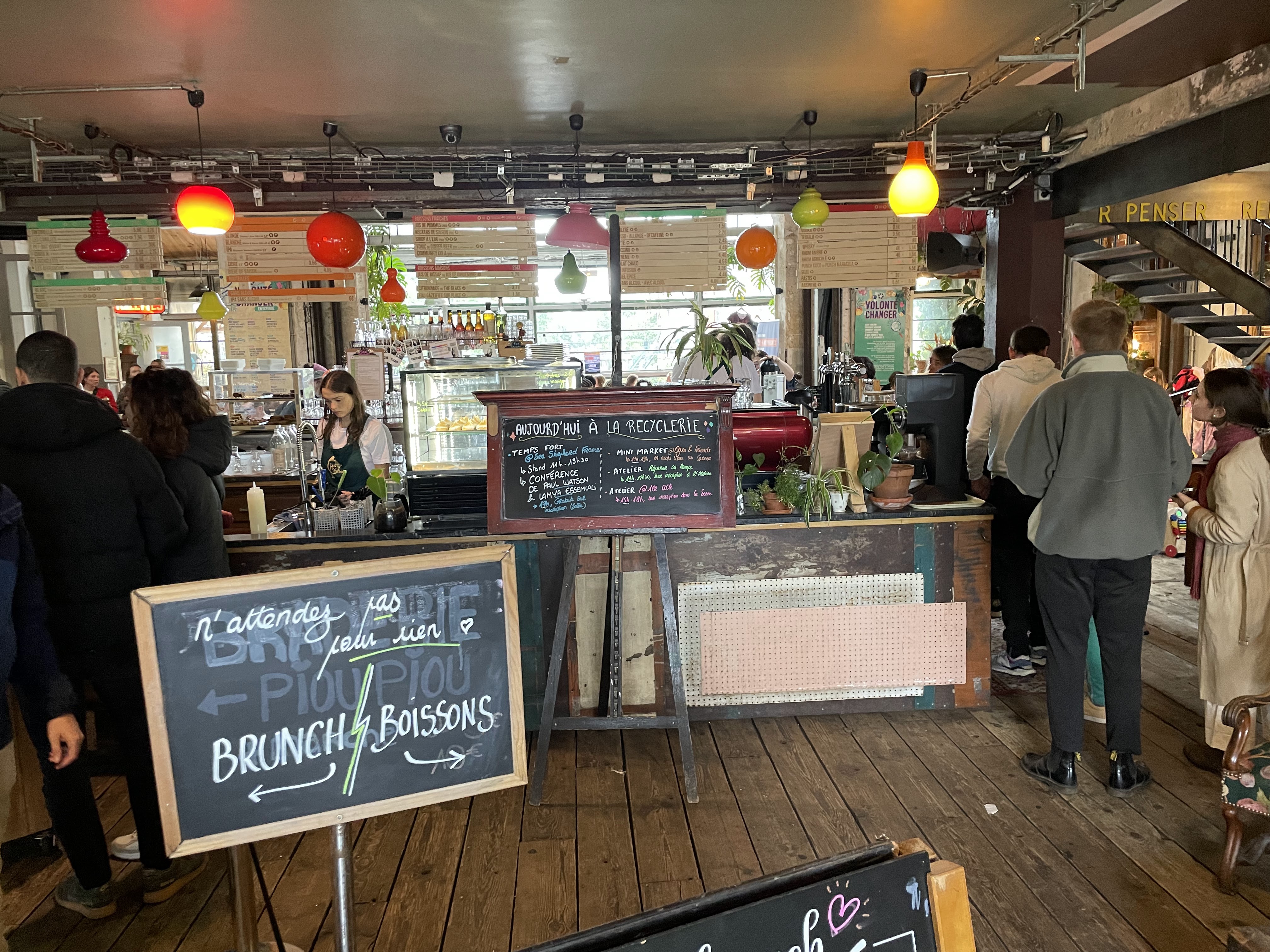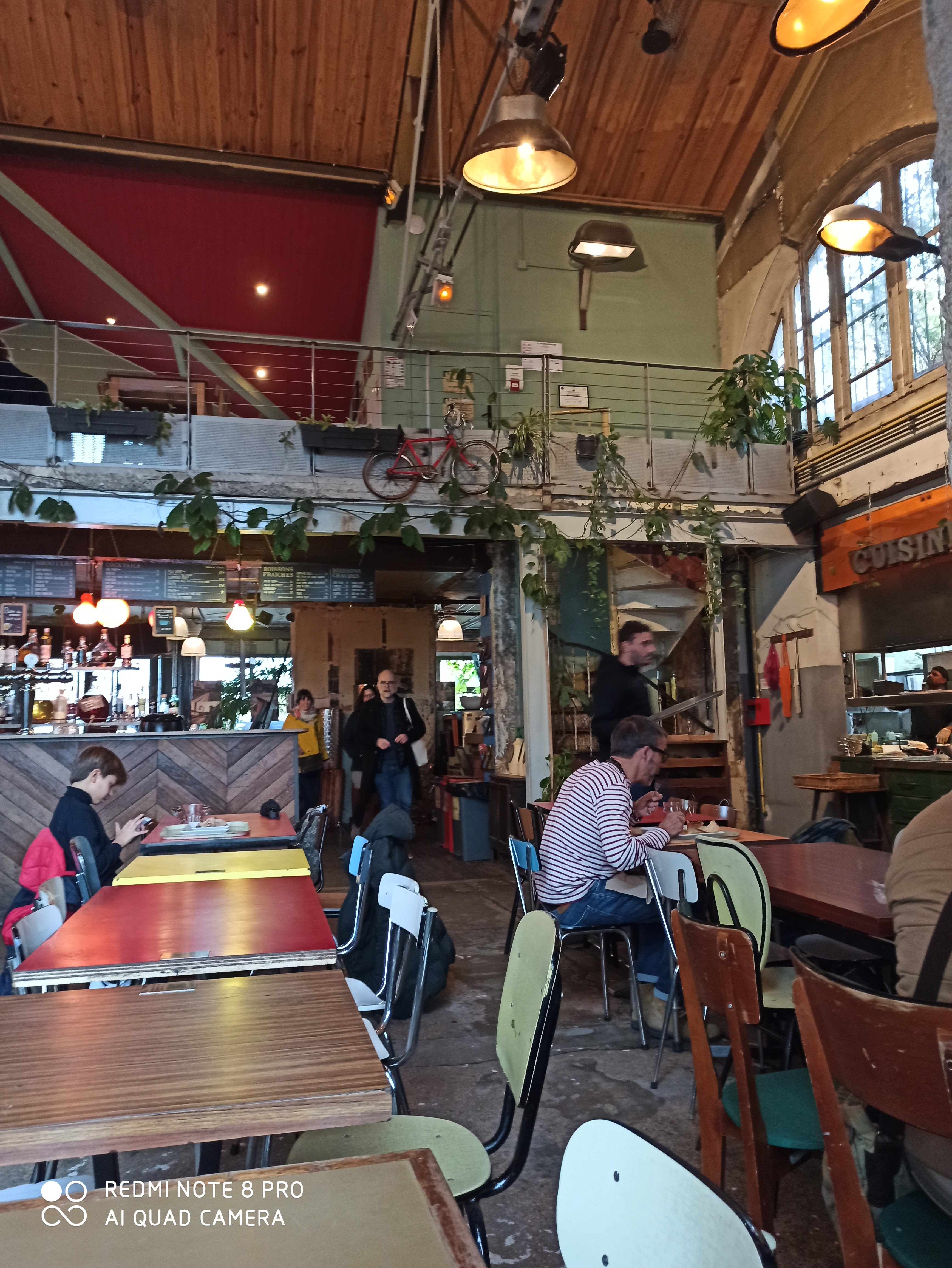 Je peux pas vraiment parler pour les autres aspects de la Recyclerie mais j’adore le coin café/restauration (seulement ouvert du vendredi à dimanche ) avec de très bonnes pâtisseries, des plats sympas, un café plutôt bon, et des serveur•ses trop mims et serviables. Bon, faut compter 8€ pour un cappuccino et un carrot cake mais le cadre les vaut. Ancienne gare, on voit plusieurs éléments de recup, la déco met dans la l’ambiance, y a des chats et des plantes. Bref, c’est cool pour bosser la journée, chiller avec ses potes en soirée, y a des ateliers réparations, souvent un coin fripes et une partie extérieure sur la petite ceinture avec terrasse et agriculture urbaine. Deux choses à redire, la musique est un peu forte et les prix sont pas très bas, voilà