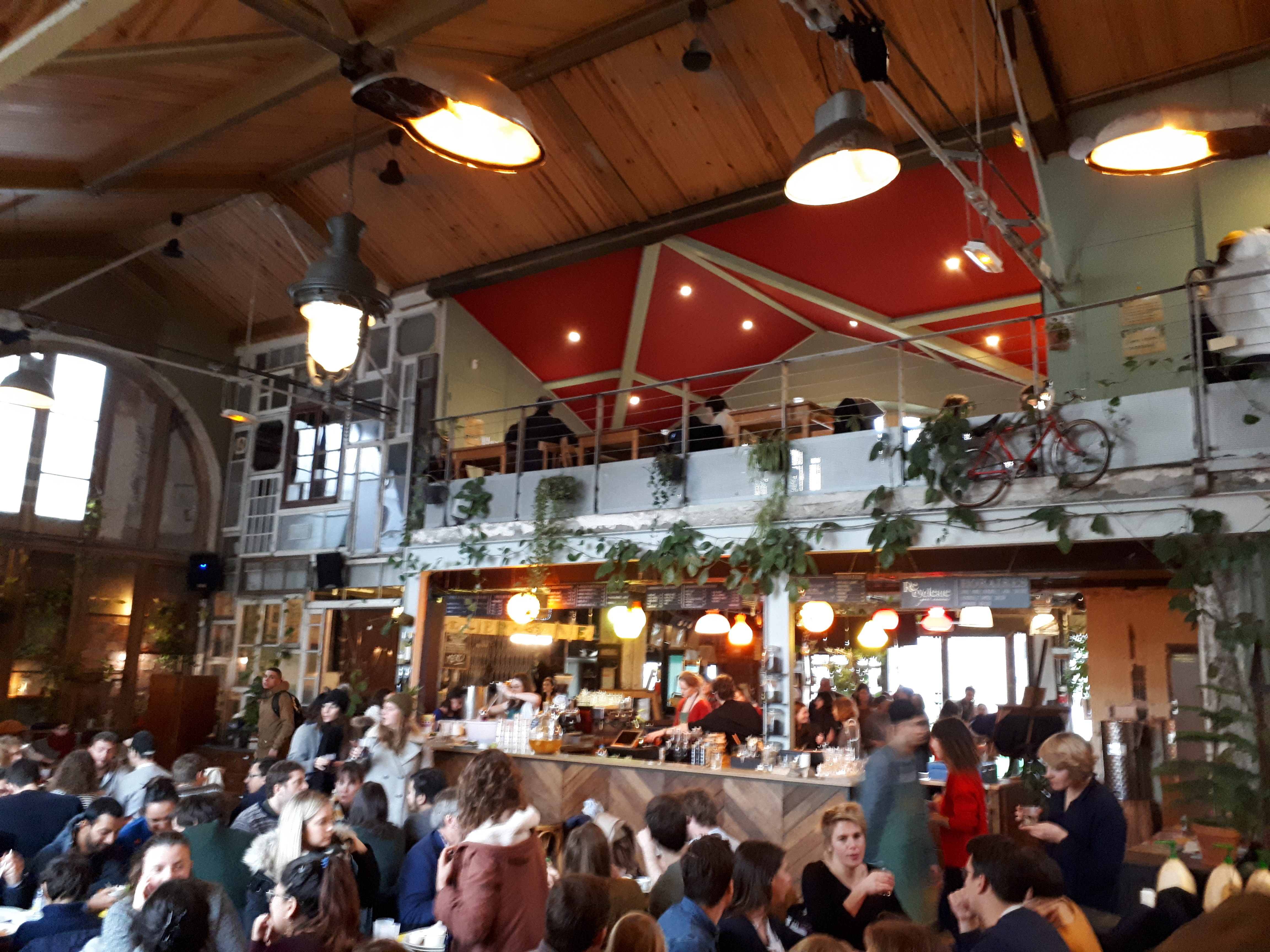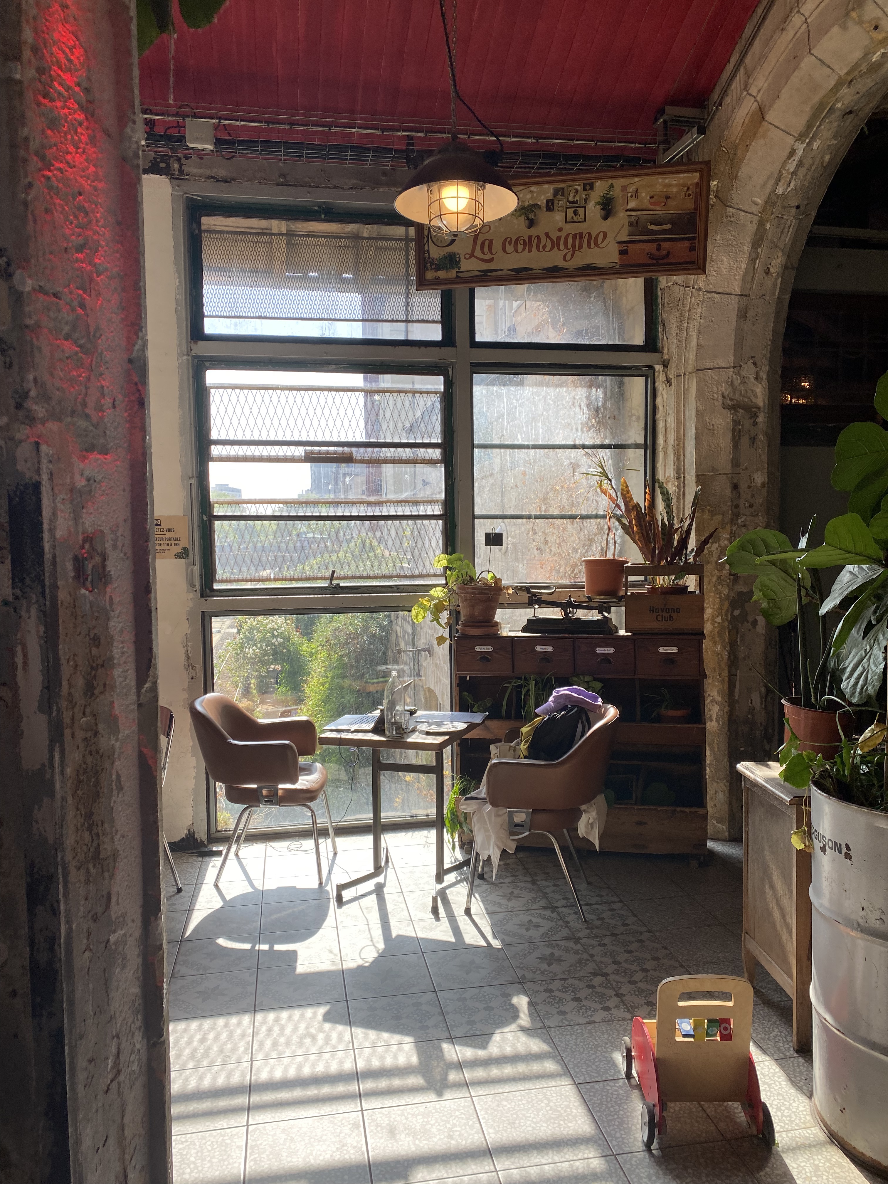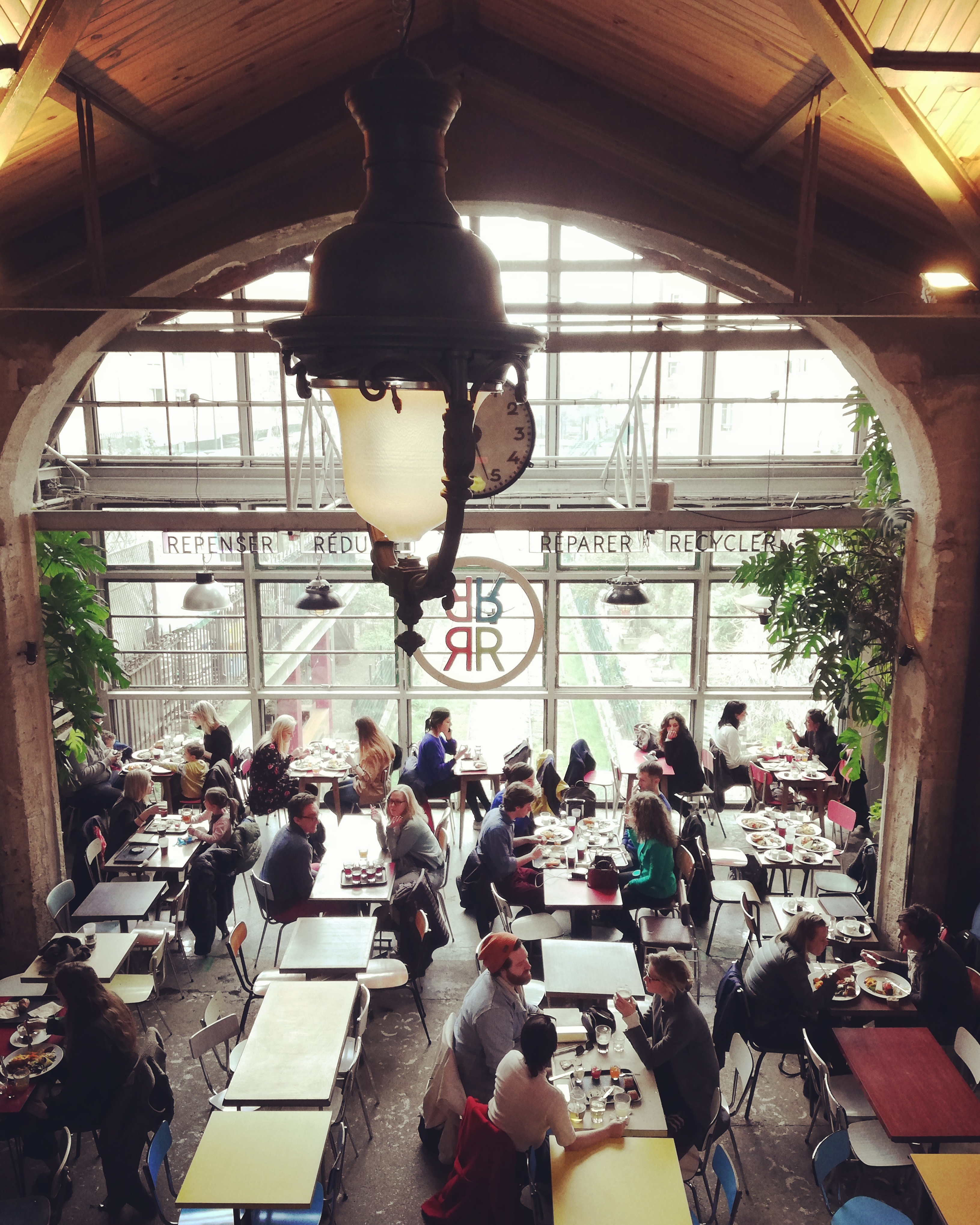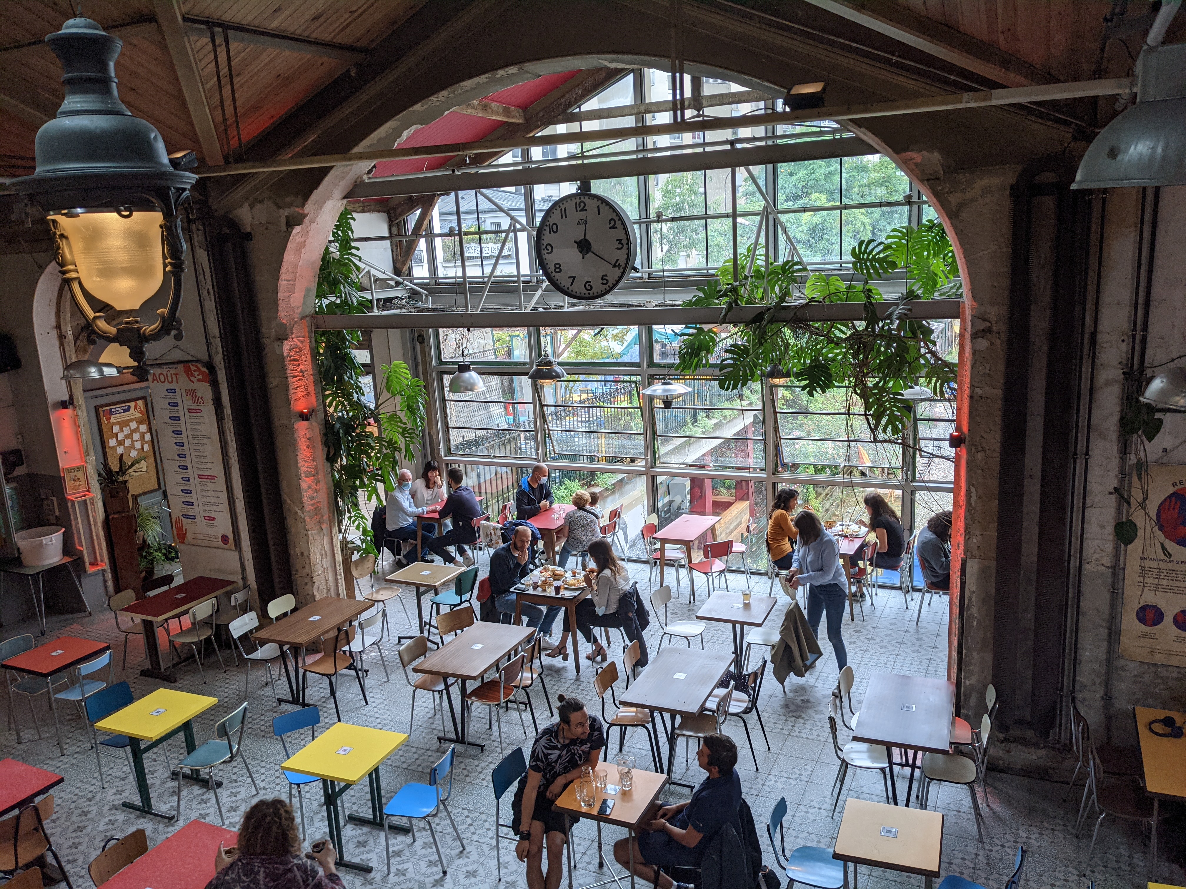 Petit déjeuner, déjeuner, dîner , café ou apéro, c’est le lieu idéal pour se sentir hors de Paris tout en gardant un pied dans la ville . Ancienne gare transformée en lieu eco friendly. Parfait qd on n’a pas envie de bosser chez soi et être ds un lieu lumineux même en temps de pluie