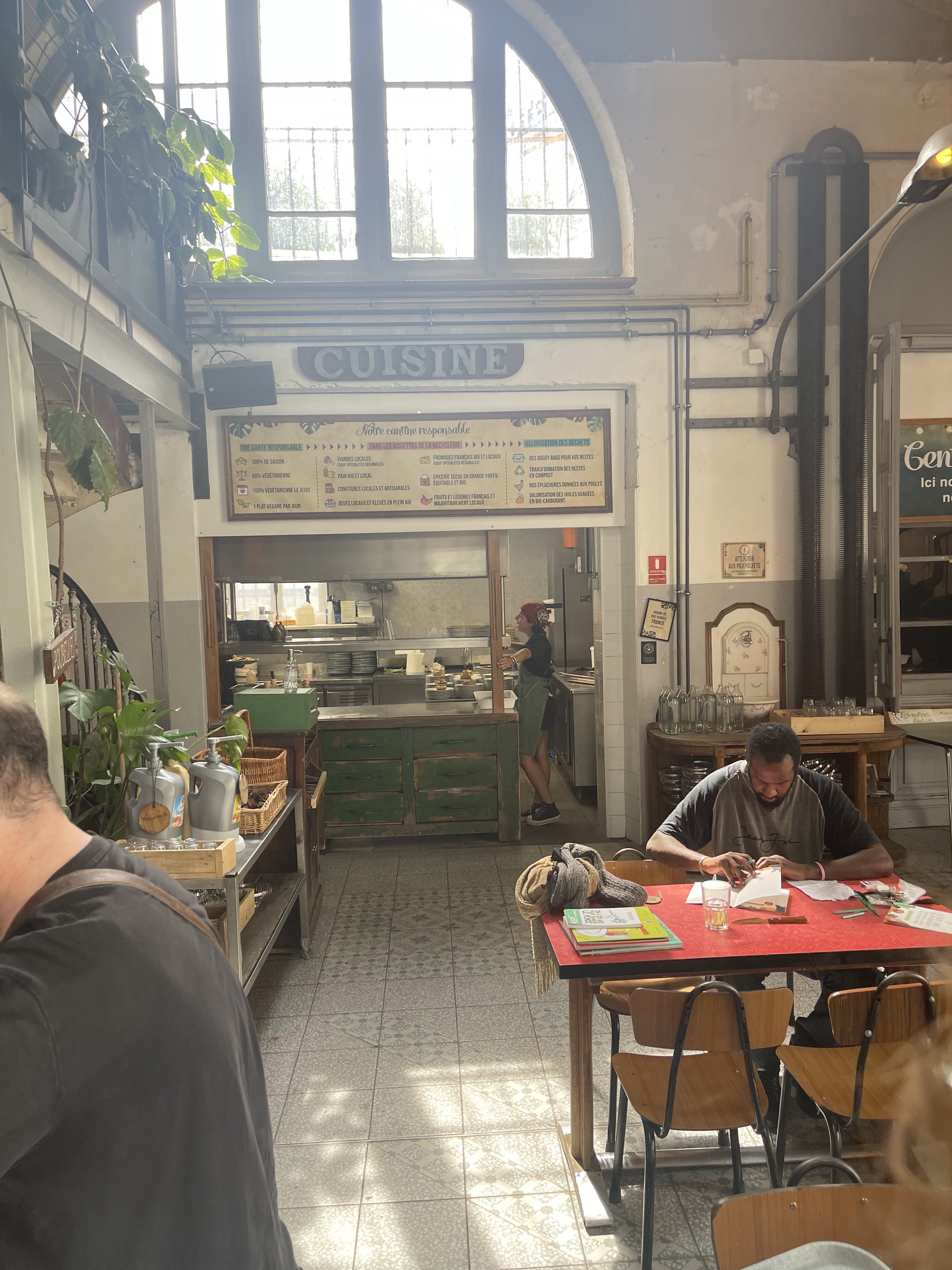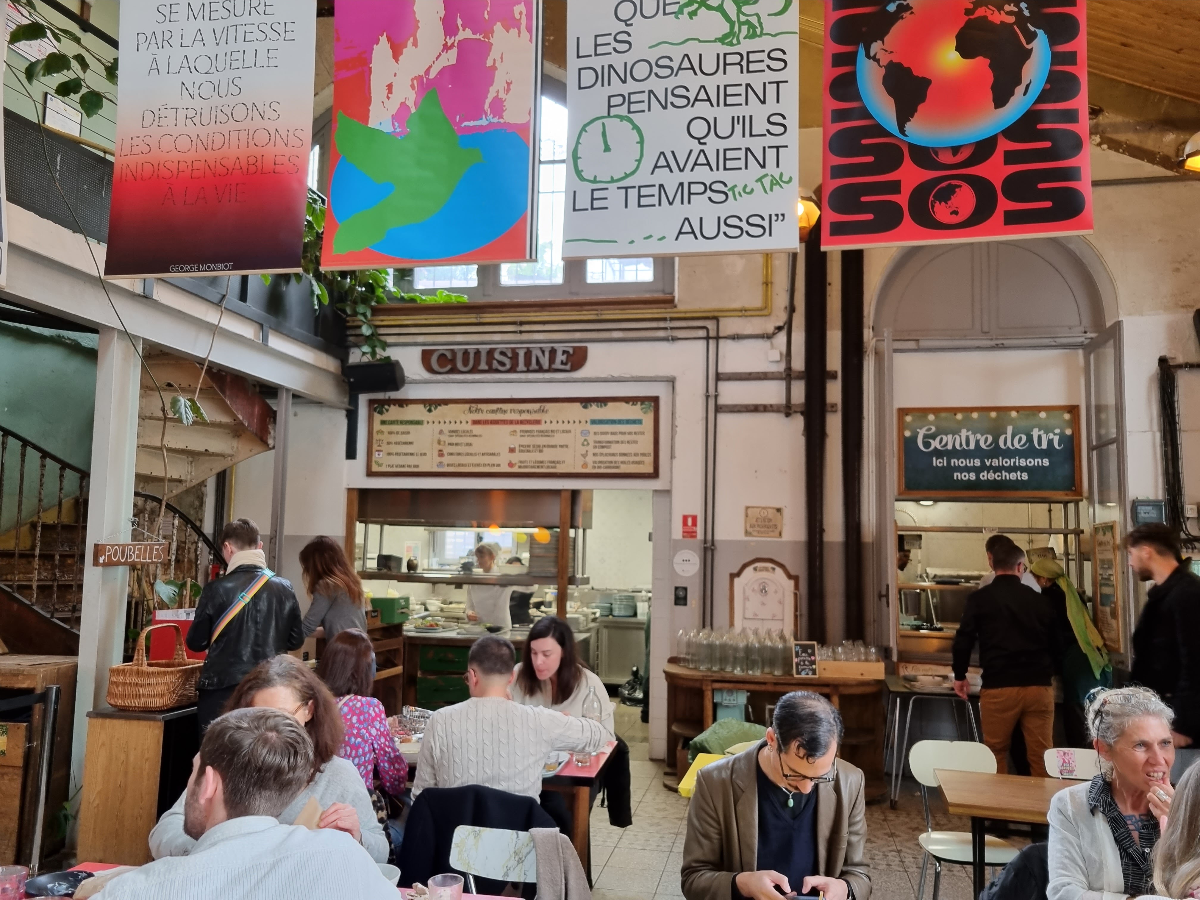 Un restaurant futuriste ! Construit dans une ancienne gare abandonnée celui d'Ornano. Il a pour ambition d'avoir un Paris plus écologique et vert. On peut déjà observer sur son bâtiment depuis la rue toute la verdure présente. Au restaurant il y a un atelier où il répare des petits électroménager (sèche cheveux, mixeur etc..) Avant de jeter voir si on peut réparer, et donner avant d'acheter. On y trouve aussi une ferme urbaine au sein même du restaurant, un poulailler, un potager, une ruche pour le miel etc... Le restaurant fait pousser ses propres légumes, qu'il cuisine dans le restaurant et les déchet de légumes servent pour le composte qu'il fait aussi lui-même... À la caisse, le personnel est très agréable et accueillant et les prix son raisonnable pour du frais et fait maison (jus, thé etc.). Bref c'est un endroit simplement magnifique, avec un cadre apaisant pour passer du temps avec des amies ou en famille. Allez-y vous ne serez pas déçu. J'y retournerai c'est certain.