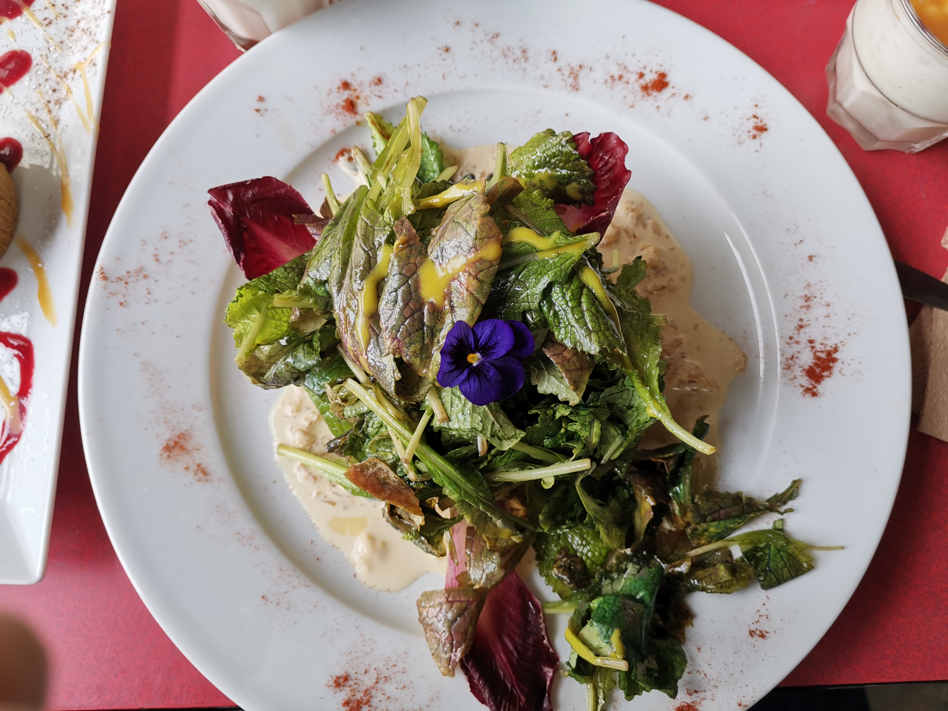 Brunch un peu chaotique, il faut prendre des couverts, des assiettes, le thé, café dessert aux quatre coins du lieu... Le temps de s'asseoir malheureusement mon assiette était froide. Sinon le lieu est magnifique, on sait pas où donner des yeux, ya des plantes partout, un grand potager, des plantes, poissons, poules... Concept génial !