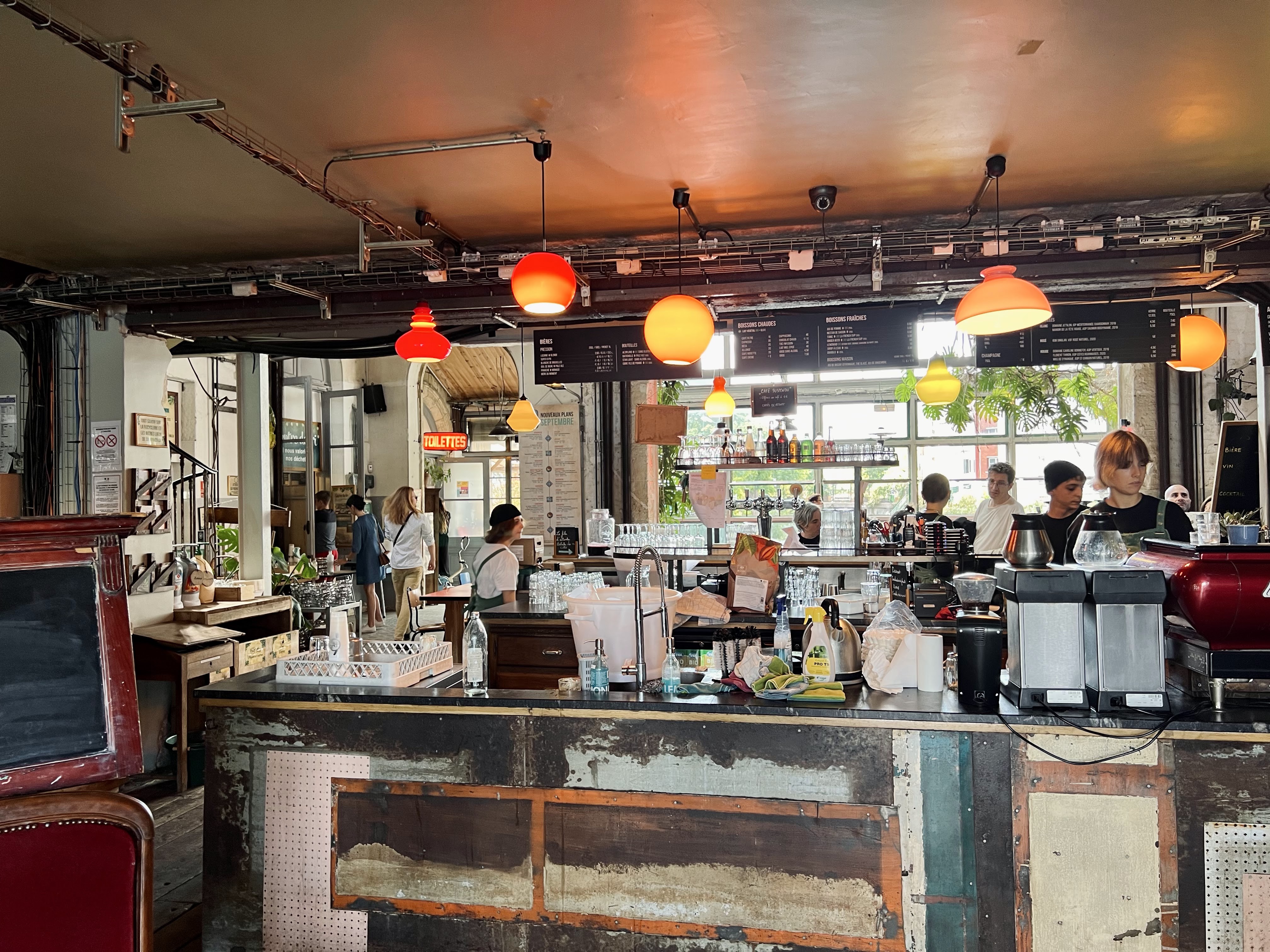 Un café grand et accueillant avec une forte inclinaison vers des choix durables. J'ai déjeuné ici aux côtés d'hommes d'affaires, de familles et de jeunes créatifs travaillant sur des ordinateurs portables. Ils avaient plusieurs options végétariennes et un bar complet de café et d'alcool. Les prix étaient raisonnables, j'ai payé environ 15 euros pour une soupe copieuse avec un œuf poché et au plat, un café et un biscuit.