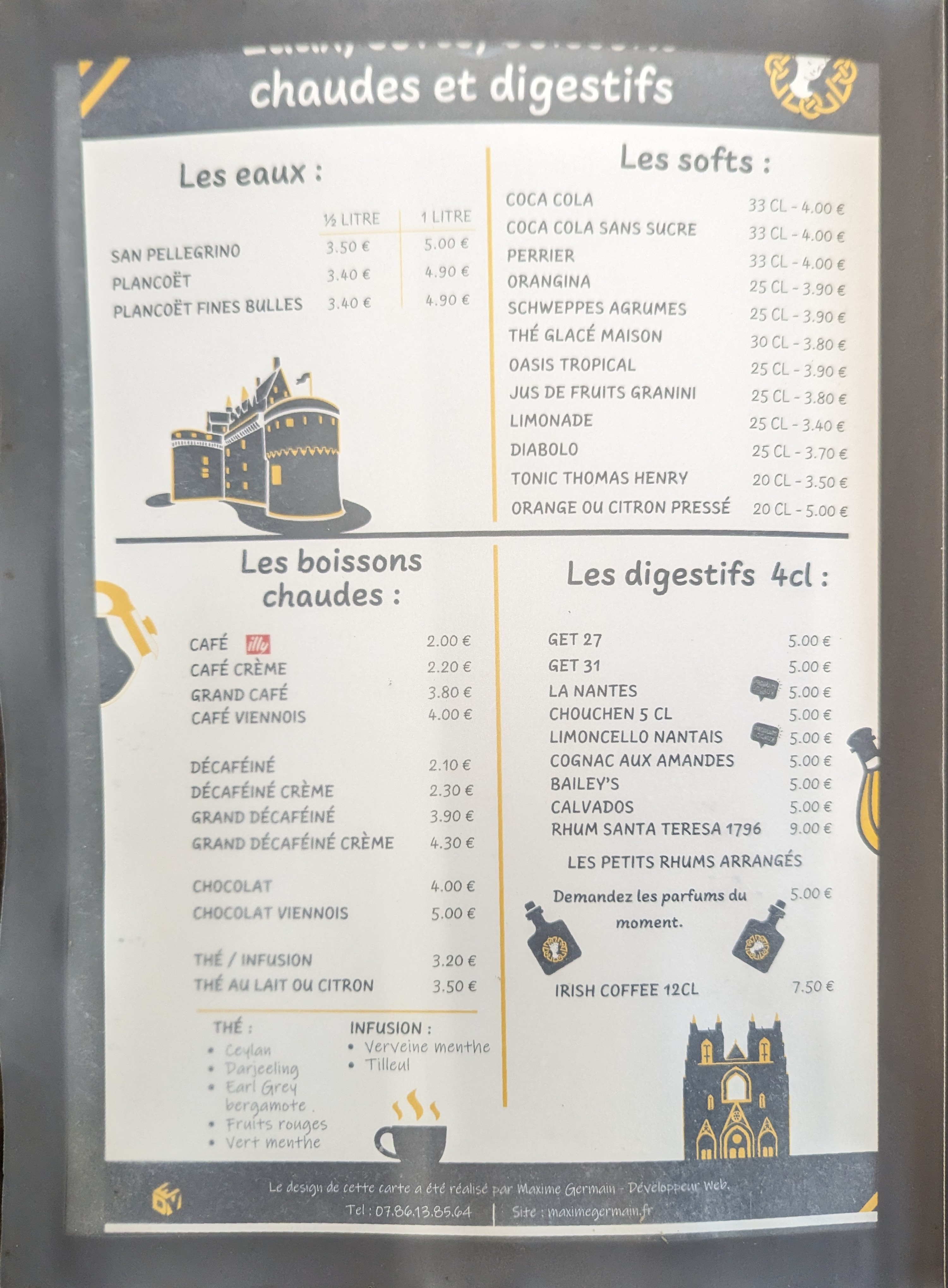 Déçue par le plat du jour, une poêlée d’encornets quo n’étaient pas poêlés, un gâteau nantais très loin de celui de Larnicol et une glace rhum raisins trop sucrés ; côte burger très moyen aussi : sec, fromage industriel (perso, je mets du morbier dans mes hamburgers…). Des gens certes très sympathiques, mais cela reste beaucoup trop coûteux aux regard du contenu des assiettes.