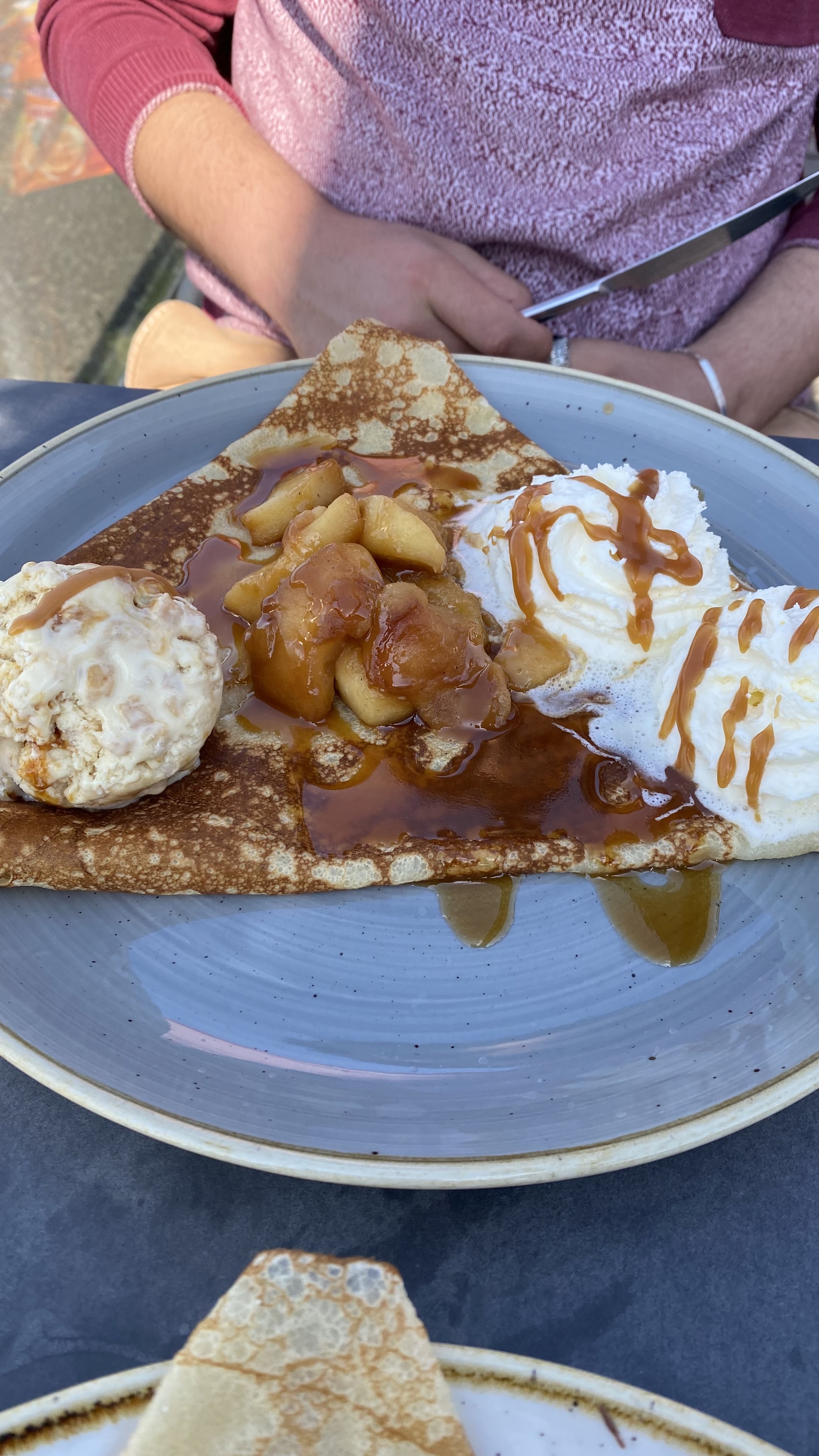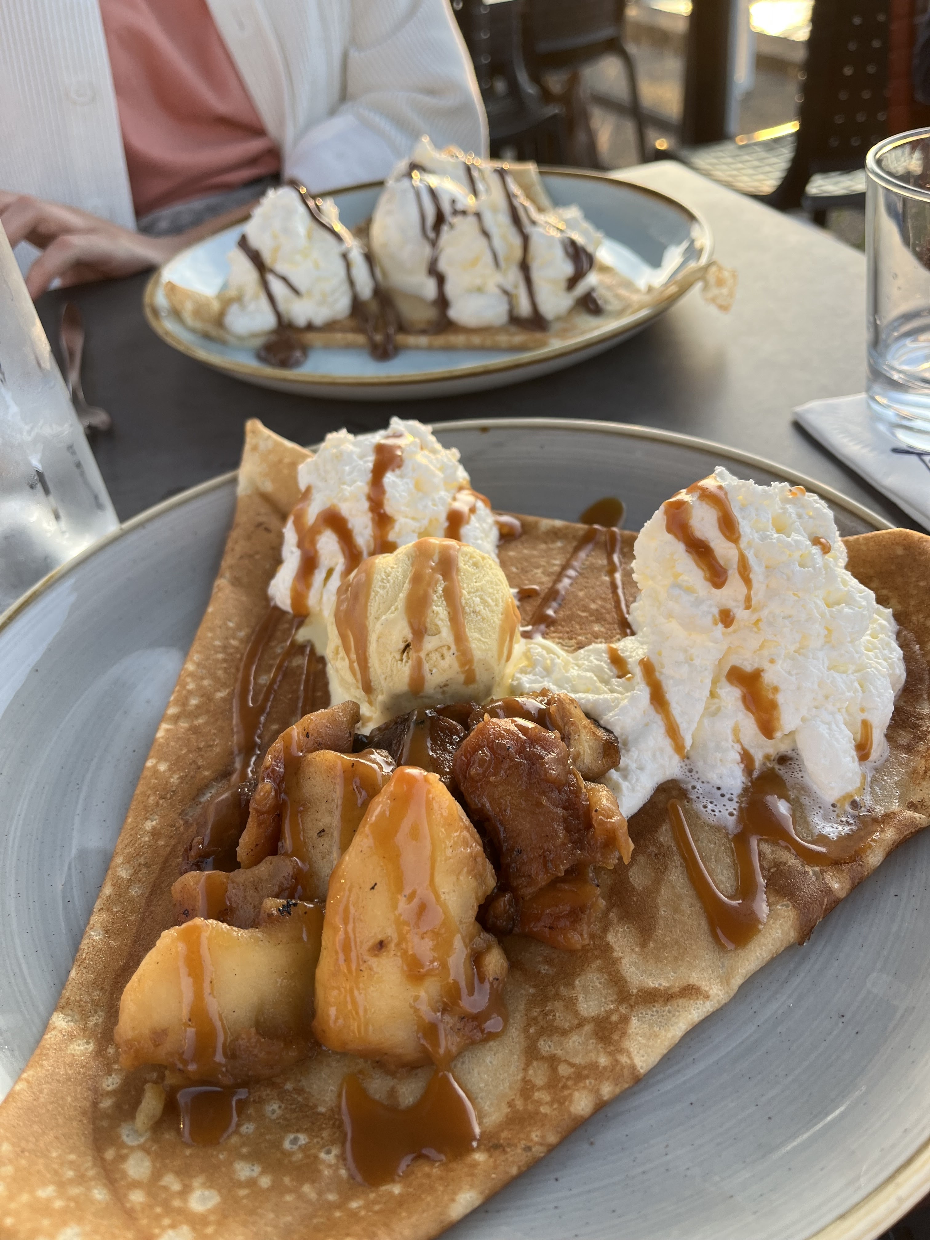 Très bonne adresse, la vue est agréable. La galette à l'andouille farcie au lard était incroyable 🤩 et bien copieuse. Les crêpes sucrées étaient froides à notre regret, et les pommes étaient un peu acides. Par contre ce n'était pas trop sucré ce qui est bien et le caramel était très bon.