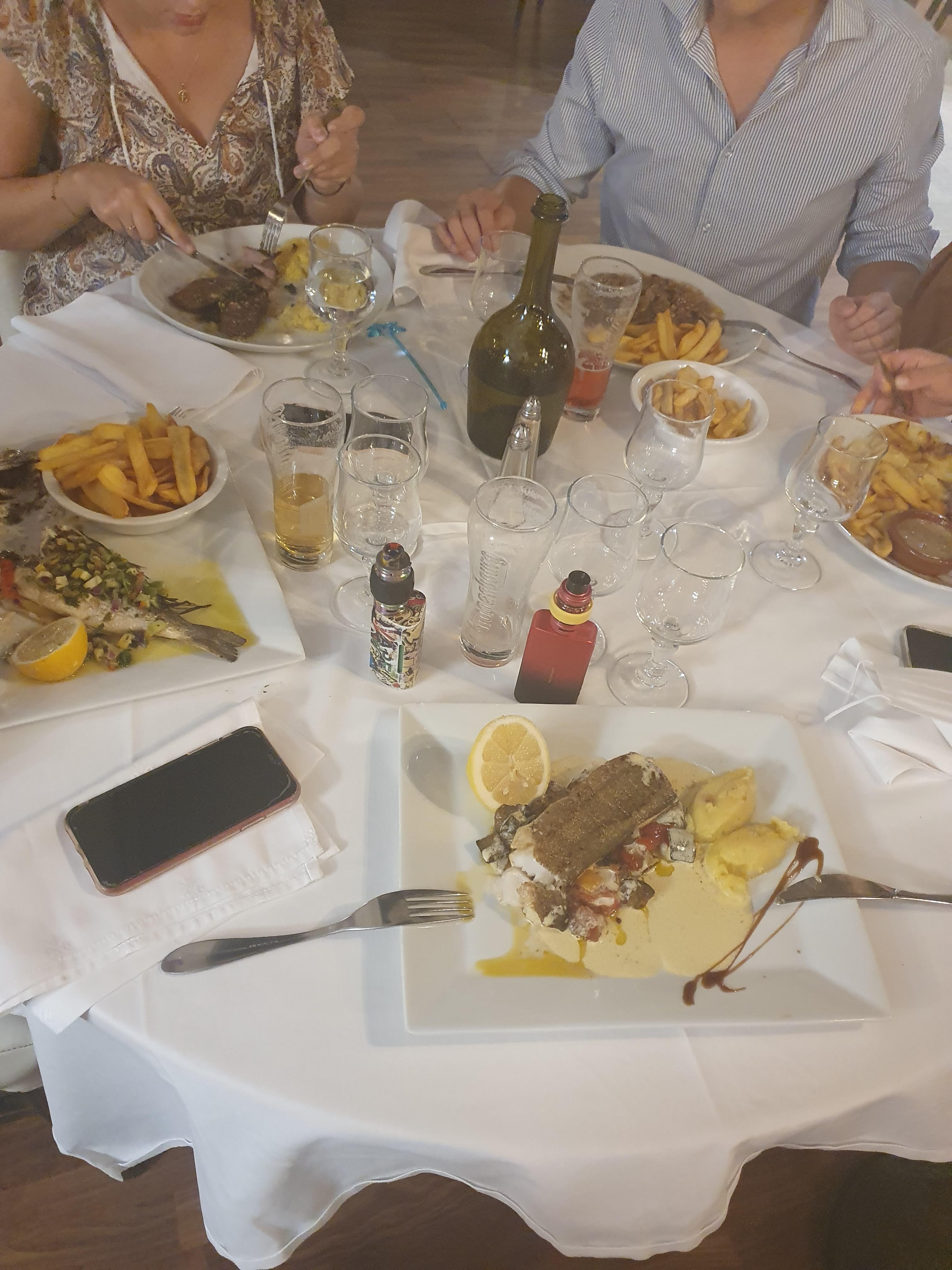 Repas mitigé (bonnes entrées, plats et desserts moyens). Une déco qui se veut classe mais avec des fauteuils éventrés. Attention en été, les chaises en skaï, c'est assez désagréable😉 Et une ambiance visiblement tendue entre les serveurs😬