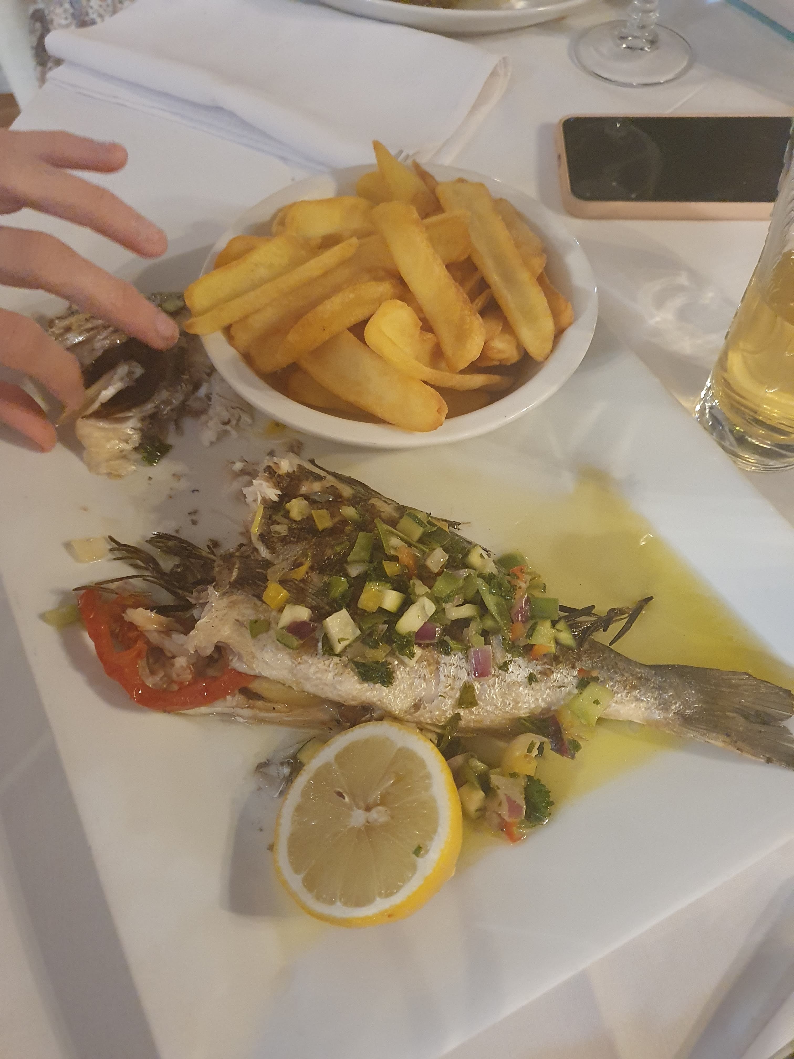 Poisson très bon. Lieu agréable mais manquement aux consignes de sécurité sanitaires. Le serveur (ou peut être patron) ne portait pas de masque en portant nos assiettes. Merci pour les postillons ! De plus il a tiqué parce ce que nous ne prenions pas de vin.