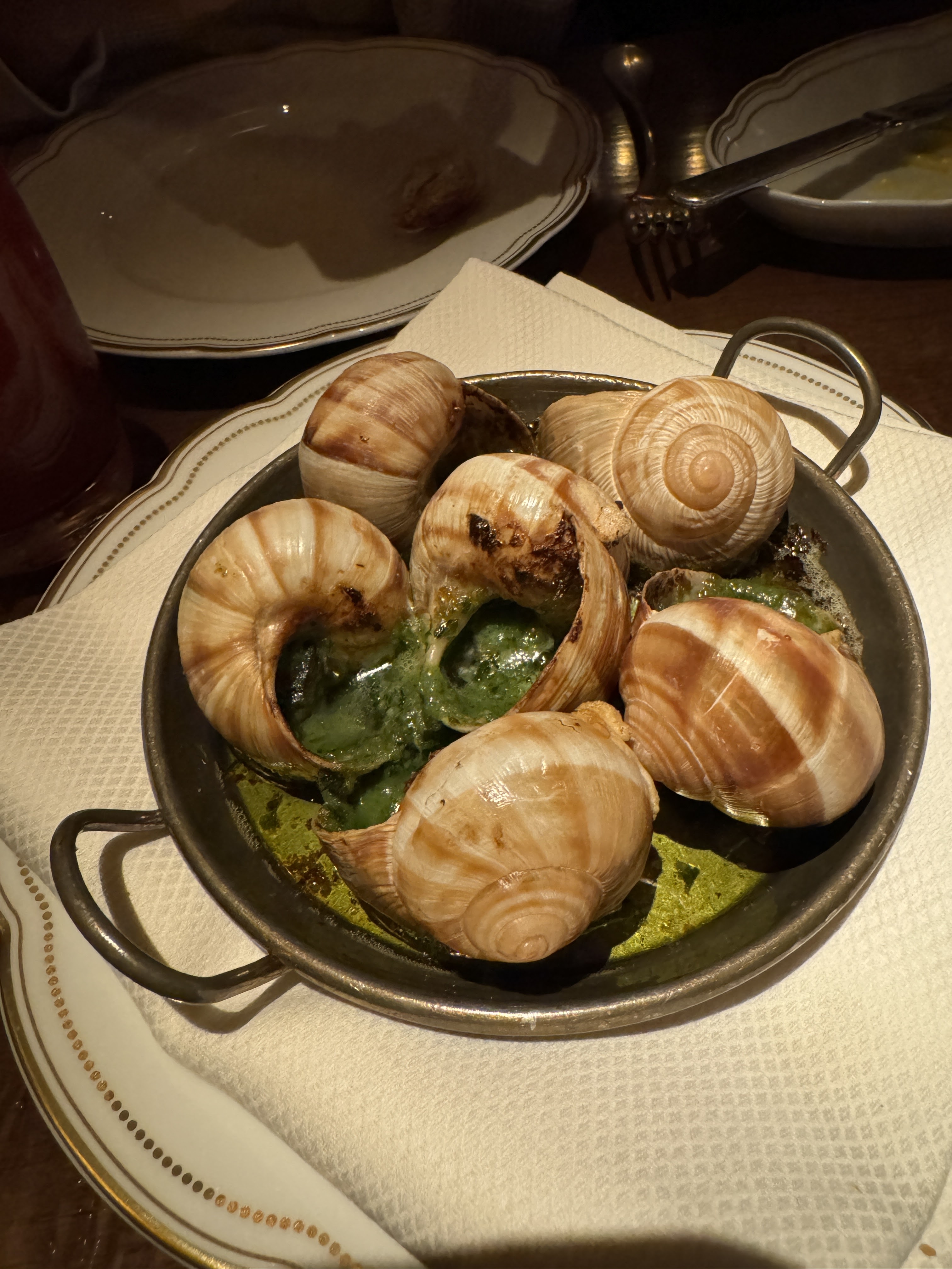 Nous étions à 2 pour ce rendre dans ce très bel endroit, un accueil chaleureux, et le personnel au top, jeune, dynamique, sympathique, aux petits soins pour les clients, bienveillant... un grand merci. En cocktail nous avons pris un Spritz.. à tomber par terre, hyperbement bien dosé.😍 Le foie gras excellent.. il manquait pour la touche frenchy une compotée d'oignons ou confiture de figue et une tranche de pain brioché. Une douzaine d'escargots succulents. Ensuite une côte de veau et un carré d'agneau accompagné de purée, frites et haricots verts. Les plats sont délicieux 😋 😋 mais un peu trop copieux.. (selon ce que l'on doit faire, on ne peut pas toujours partir avec des doggy bag 😔). Je recommande cet endroit et à l occasion j'y retournerai avec plaisir.