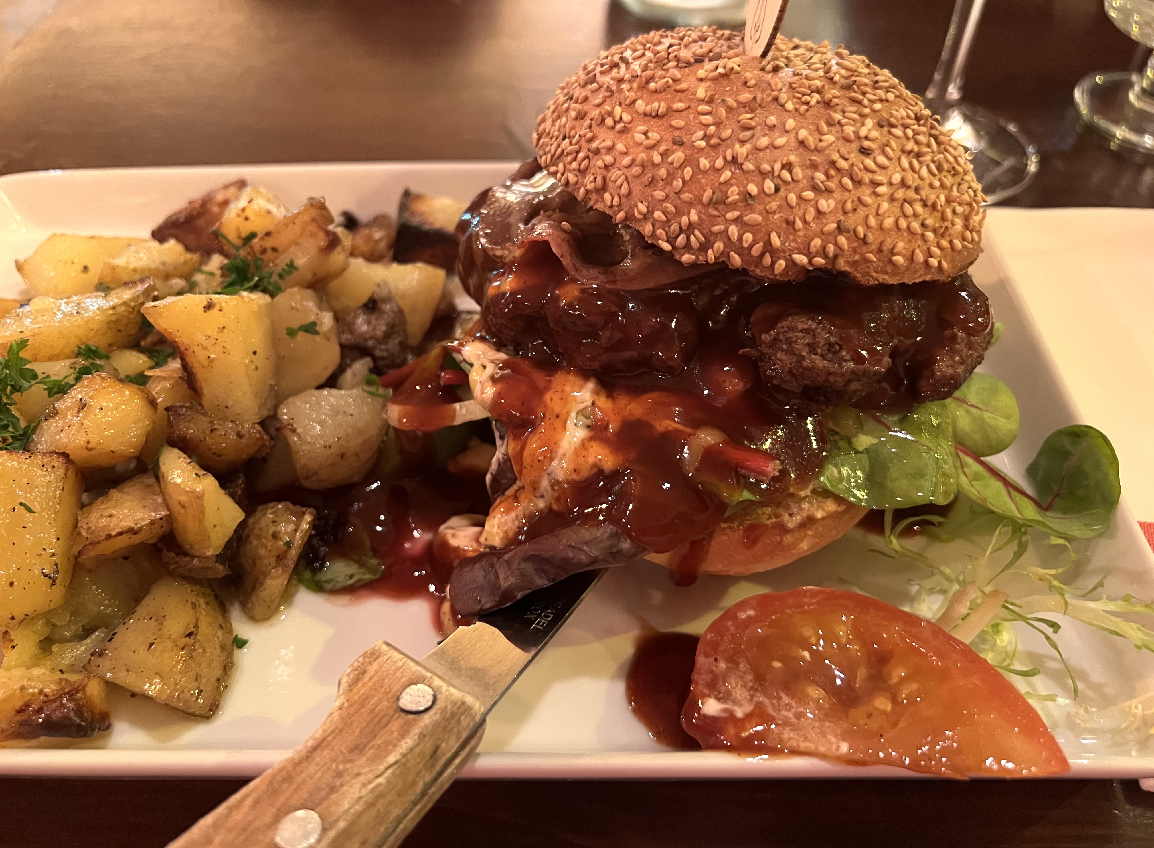 Nous étions seuls au restaurant. Lorsqu'on lui a demandé si vous étiez ouvert. la dame assise au fond de la table a répondu oui. Le gars qui était le serveur était poli mais a oublié de commander le troisième repas. Cela signifie ? Mon mari a attendu, nous avons mangé. Ce n'est pas possible si personne d'autre que nous n'est assis au restaurant. Alors que nous partions, le fils de la maison s'est assis sur la table et a dîné. Et c'est ainsi que nous avons été accueillis. C'est une sorte de bar. Seuls les vins semblent un peu chers. Un huitième d'un vin que j'aurais pu avoir envie de boire coûte 26 euros. Au début, je pensais que c'était le prix de la bouteille. Je ne peux pas recommander l'endroit. Si trois d'entre vous ne peuvent pas manger en même temps, le dîner n'en vaut pas la peine. Sinon, l'endroit a l'air confortable avec beaucoup de bouteilles de boissons.