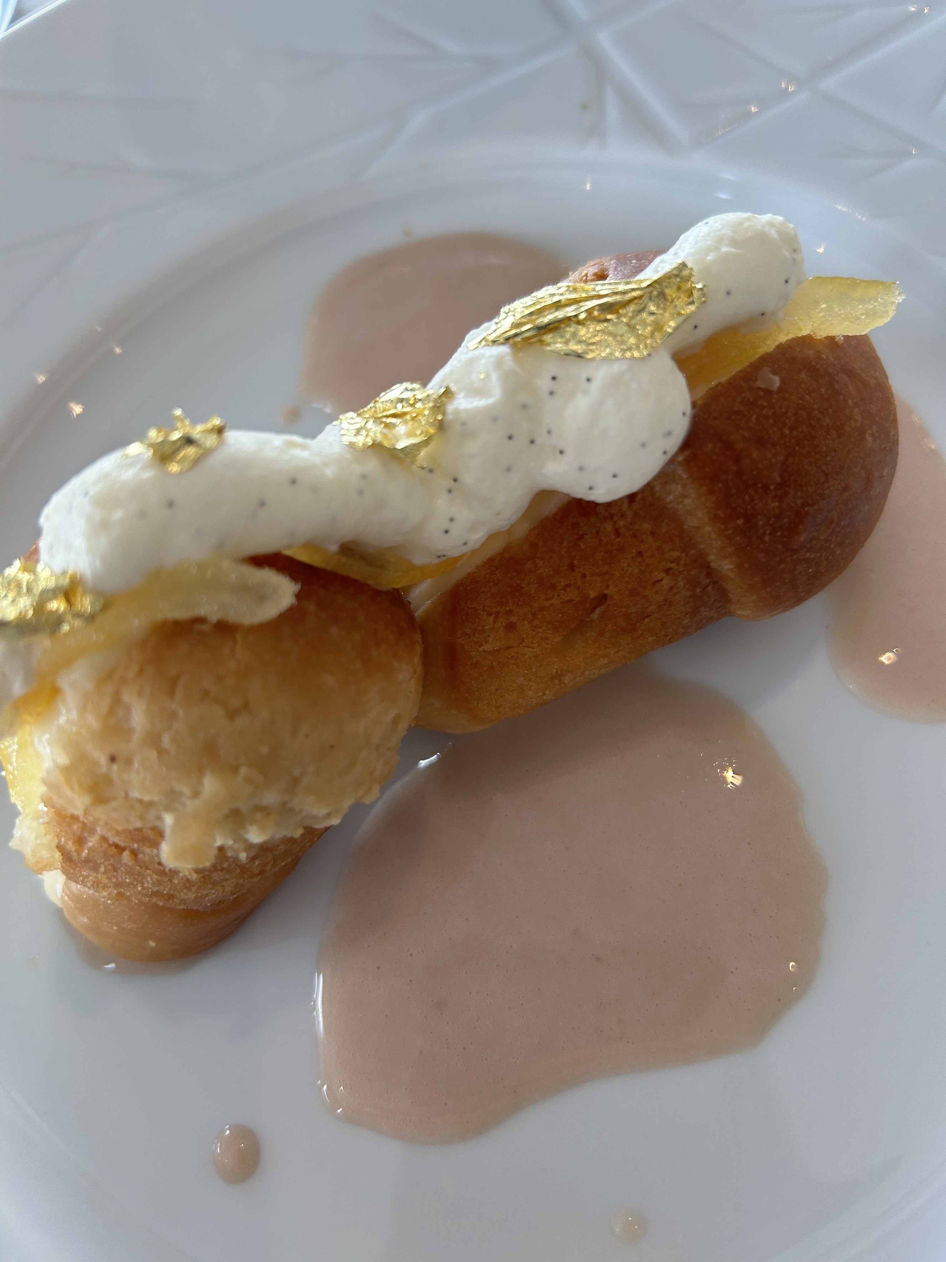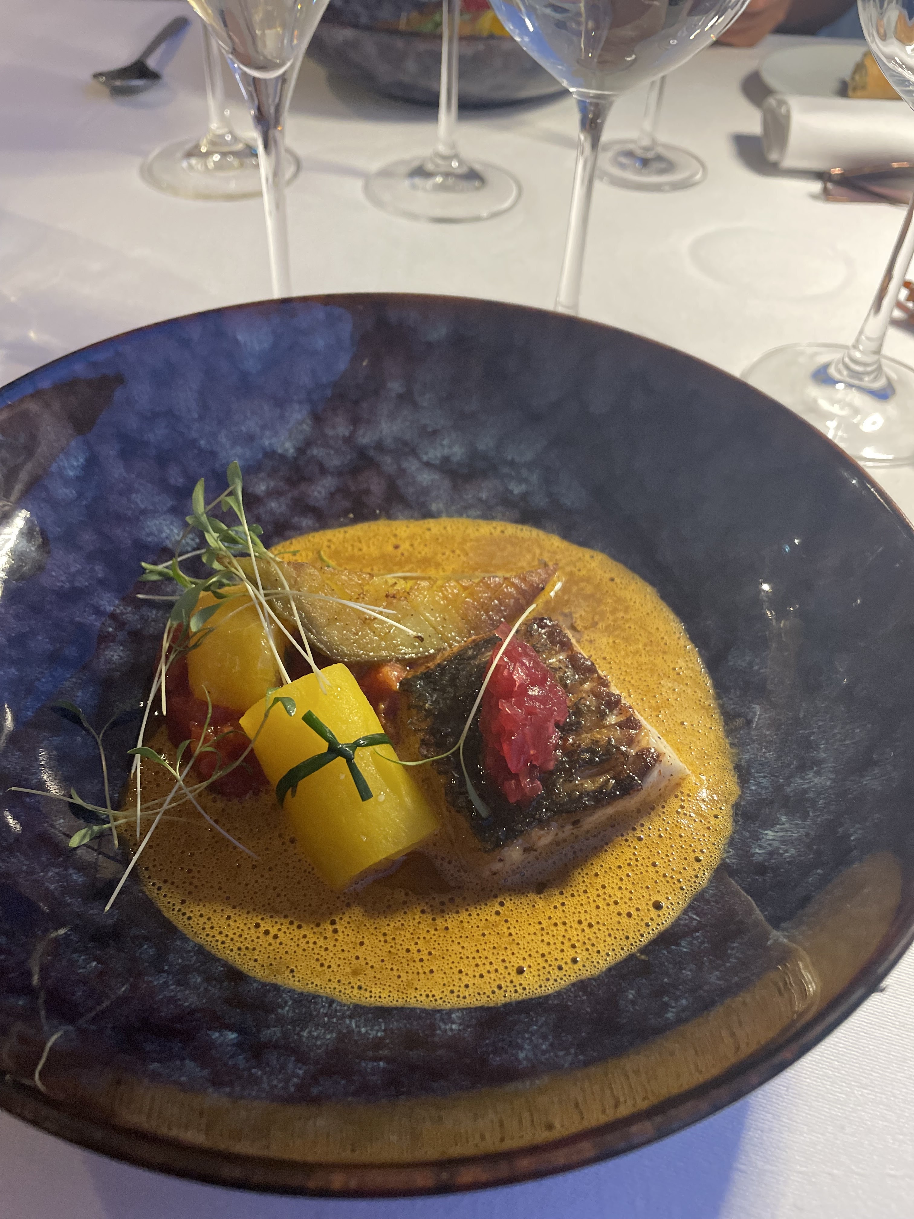En entrée émulsion de tomates avec burratta très bon ,mon compagnon à particulièrement apprécié l'entrée avec la gambas. La tomme de vache de roure étais agréable, très fine. Le litchi à l'intérieur du macaron étais une douceur, dommage de pas avoir pu choisir nos desserts ayant demander de le prendre pour chez nous ayant suffisamment mangé. C'est un très bon endroit ( sans parler du cadre magnifique ) si vous avez l'habitude des gastronomiques rien d'exceptionnel mais très bon mélanges de bon produits , simple bien travaillé et très bon.