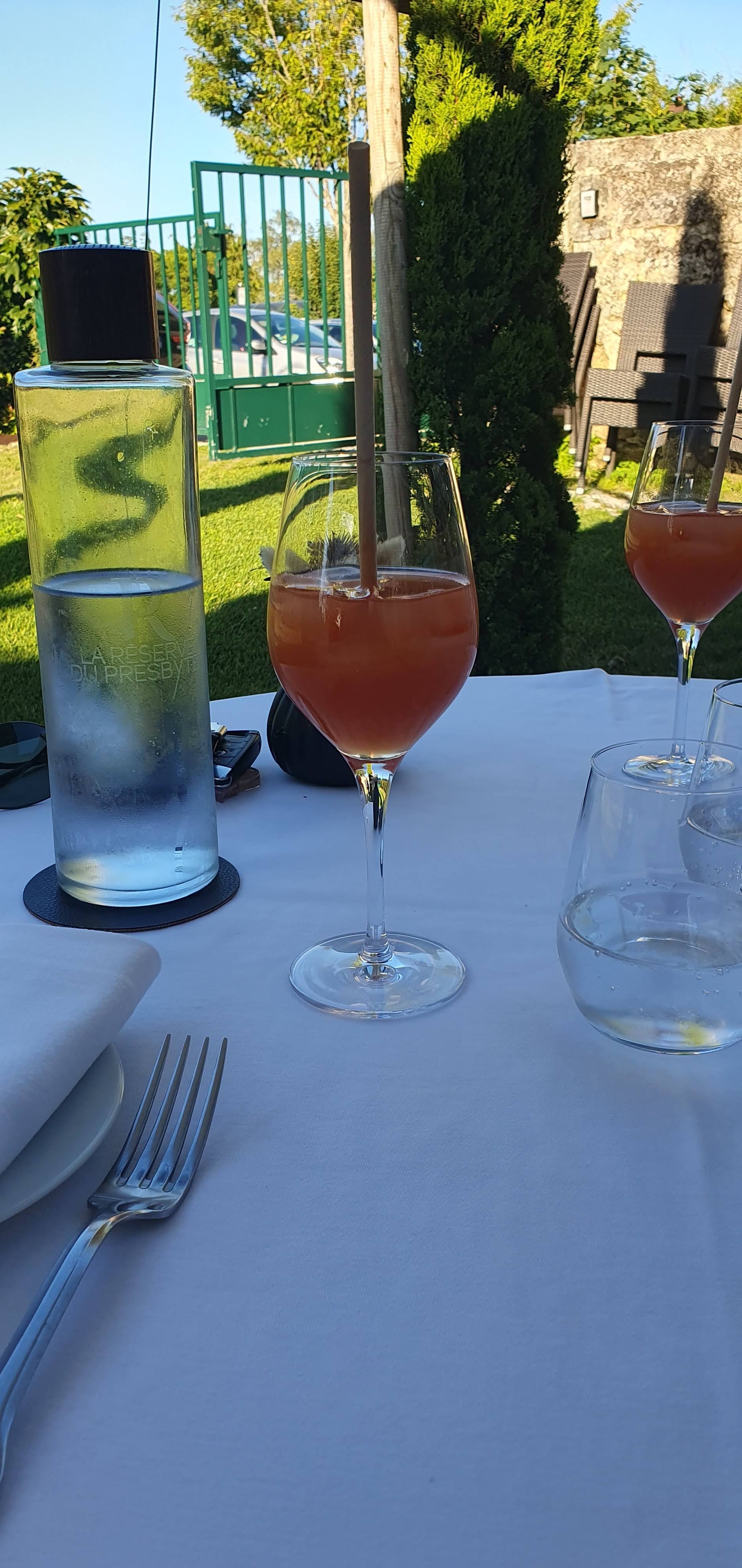 Le restaurant baigne dans un cadre magnifique. Nous avions eu la chance de dîner au coucher du soleil, la lumière venait tapisser la verdure du jardin où nous dînions. Le pâté en croûte se mariait agréablement avec le chutney d'abricots. Le tartare de poisson était excellent mais j'aurai aimé une pointe d'acidité supplémentaire et une légère touche d'échalote. Le fondant au chocolat avec le sorbet aux fruits rouges était exquis. Moi qui ne suis en général pas fan de sorbet, j'ai trouvé celui-ci particulièrement goûtu, rien à voir avec ce qu'on trouve au supermarché. Le repas a été un sans faute !