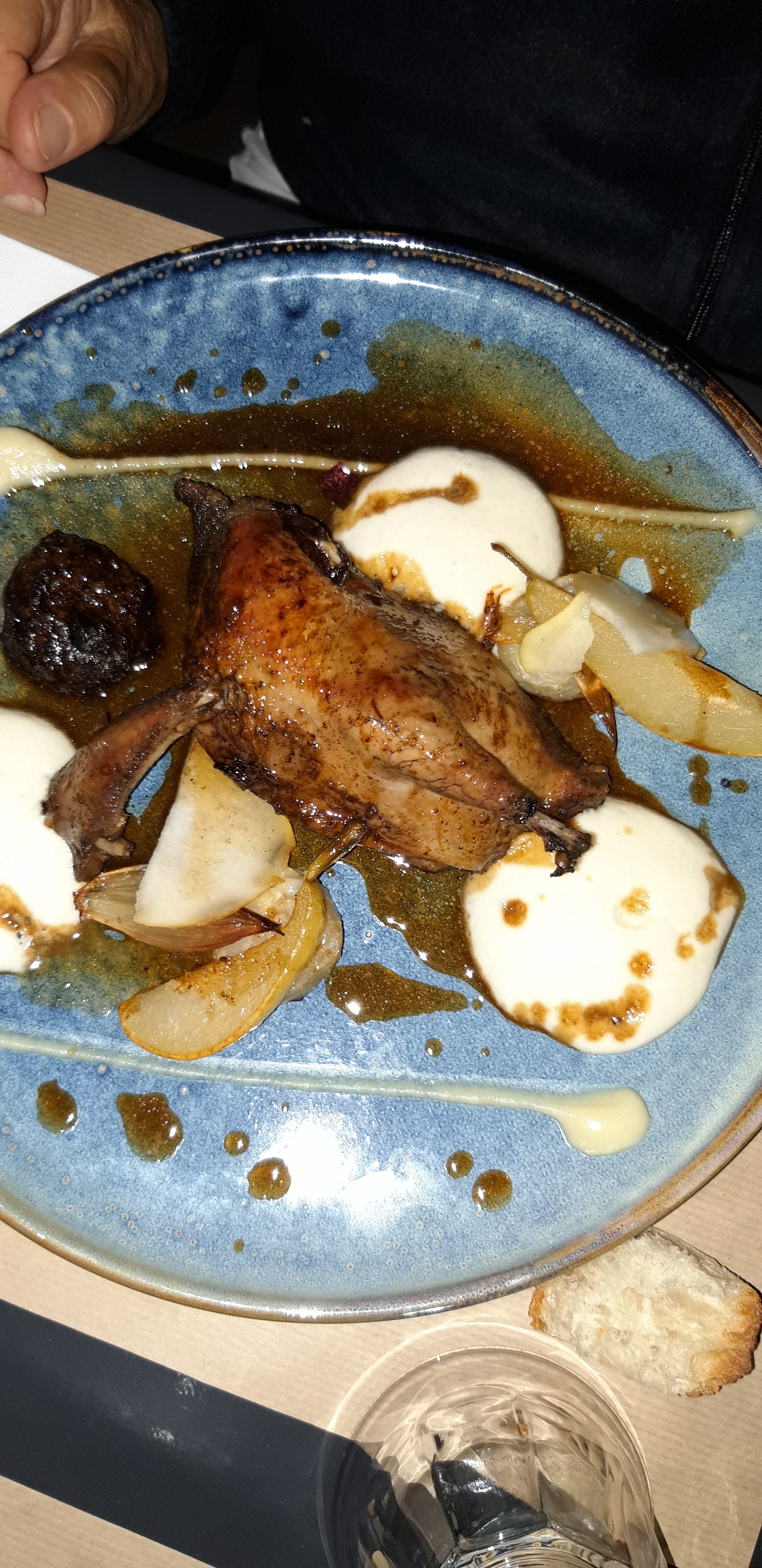 Tres bon mais manque de sauce sur le ribs de porc . Crumble abricot vraiment très très acide ..immangeable. si non tres bon