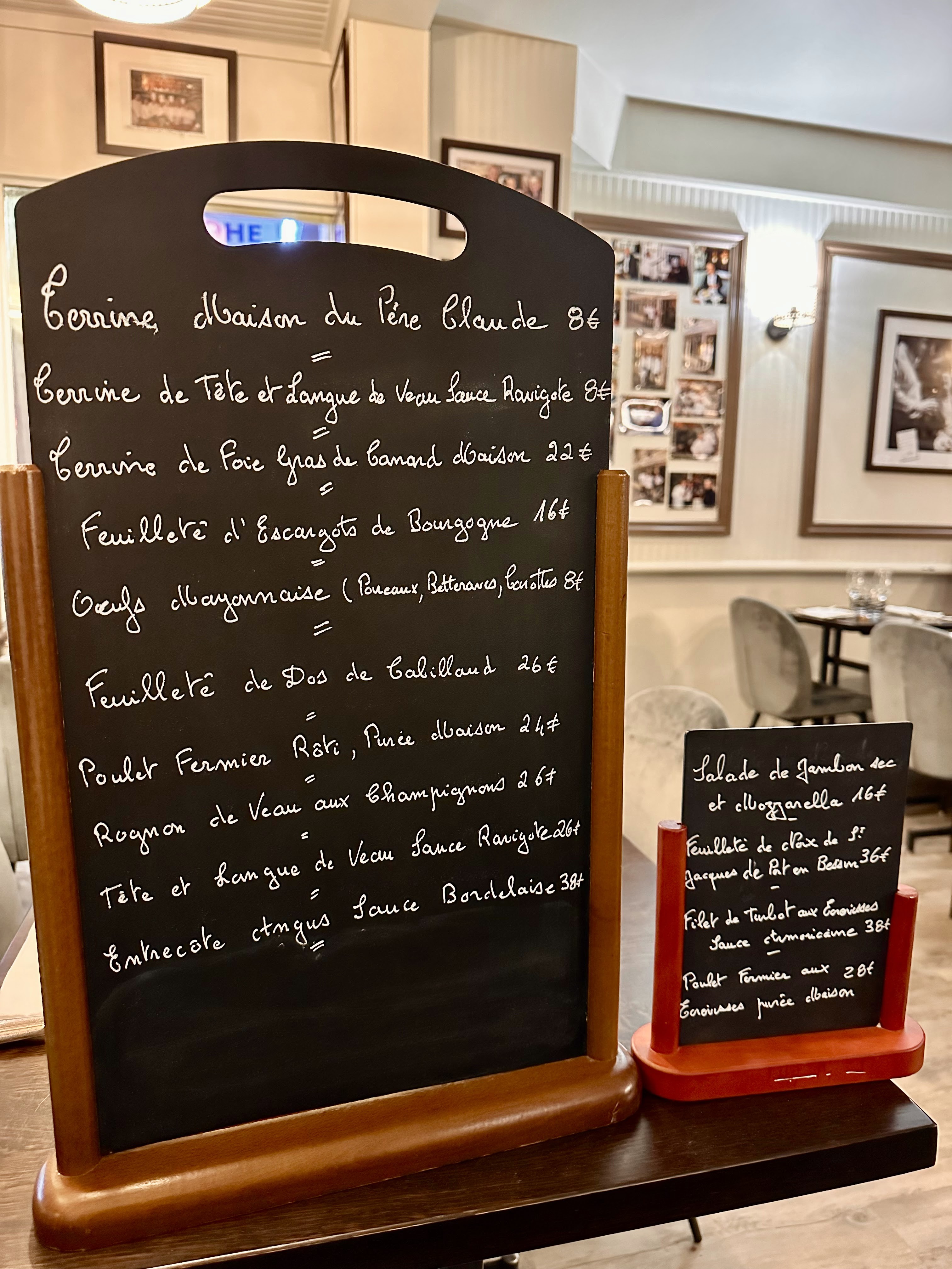 On y retrouve la cuisine de MR Claude En revanche la terrine en entrée beaucoup trop froide cela hélas lui fais perdre du goût. Il y manque à mon goût certains de ses classiques : plats en sauce et le boudin noir Il est certain que cela reste une belle adresse dans le 75015