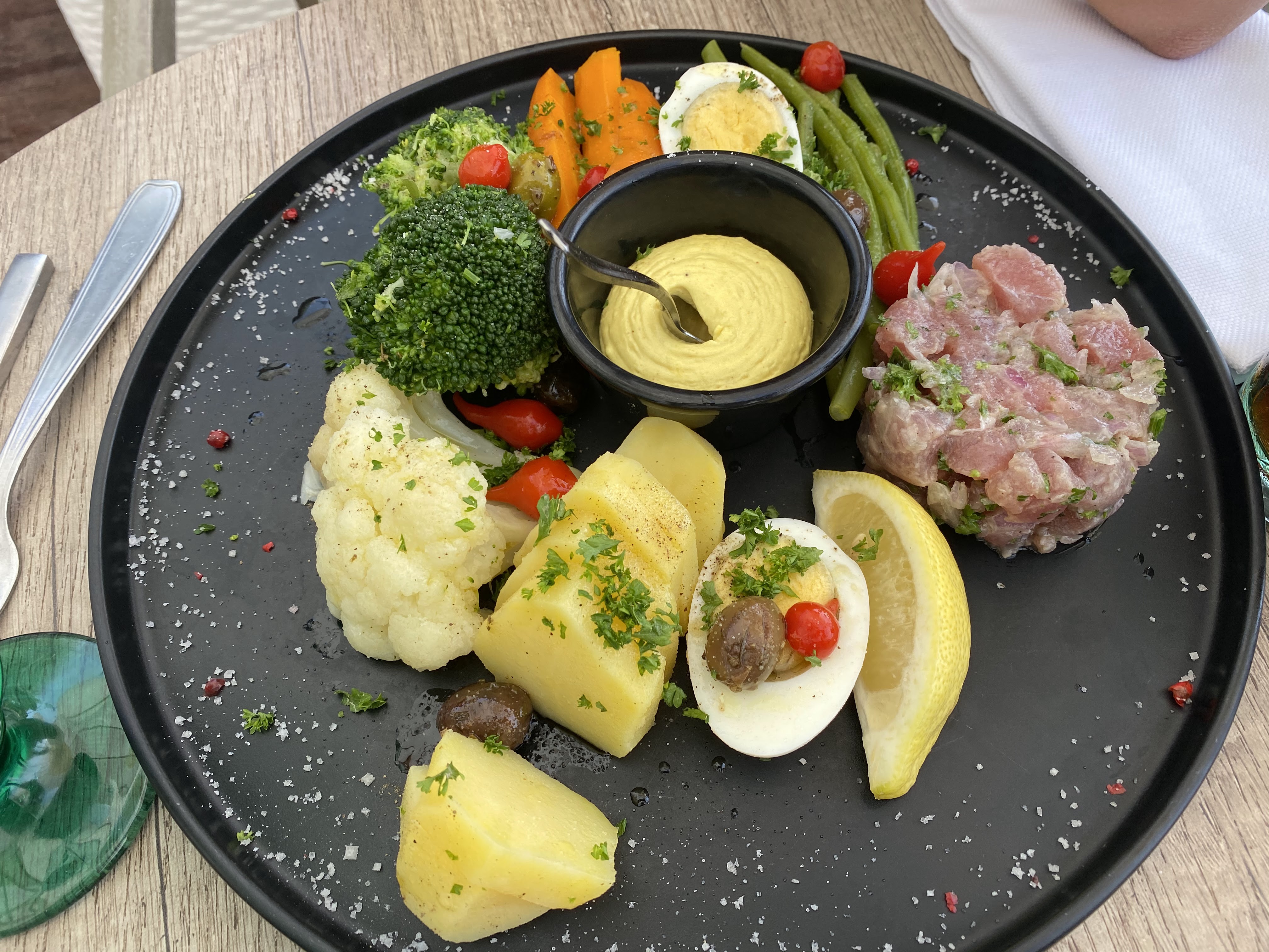 Un tartare au couteau , un Virgin mojito pour Madame, une salade Cesar Poulet pour Monsieur , deux cafés : 72,50 euros Les prix ont été revus à la hausse mais la qualité est là, le cadre et le service aussi Conclusion : une carte estivale sympa , une ambiance bord de mer .. what else ? … Quelques suggestions du moment , plats du jour avec un brin local … En tout cas , nous y reviendrons avec plaisir