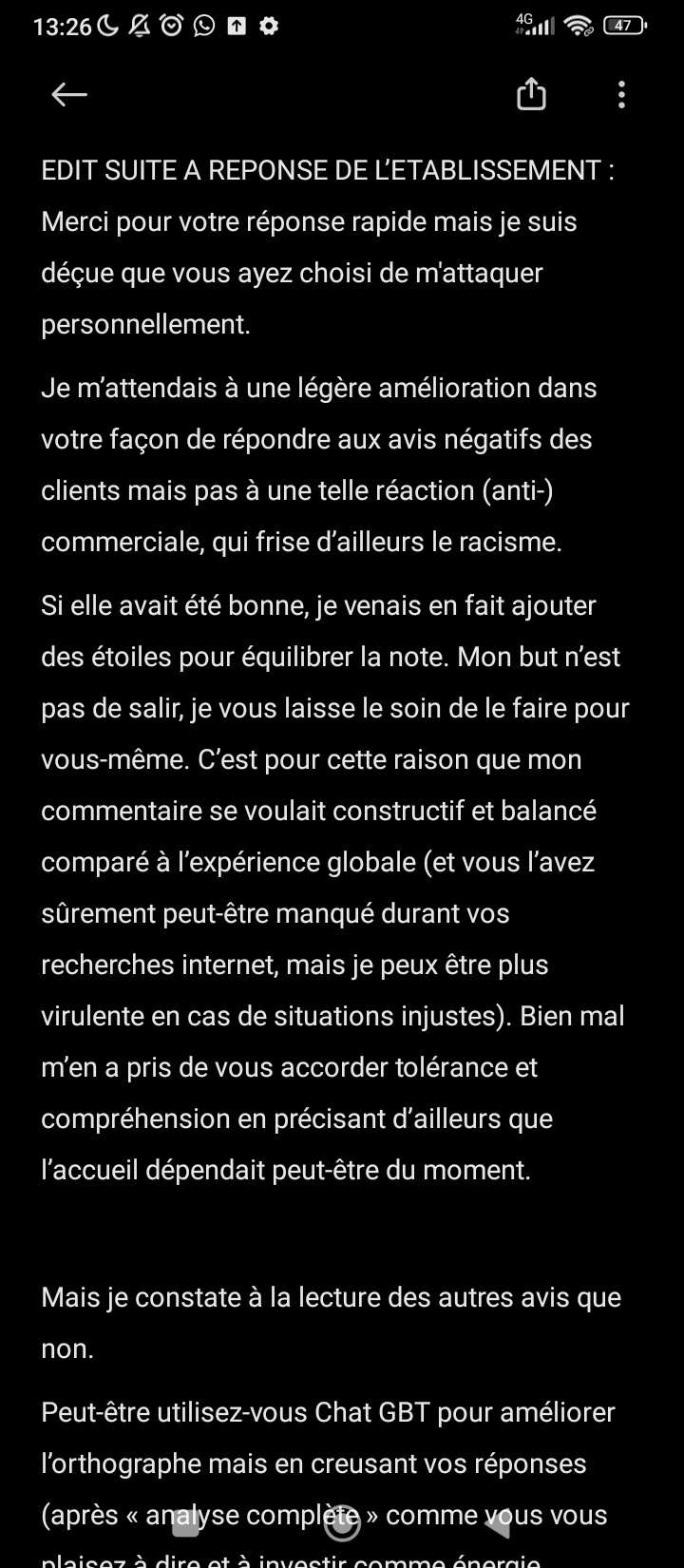 EDIT : L’établissement a répondu de manière hallucinante en insultant plusieurs corps de métiers (désolée pour nous) et en étant limite racistes. Je m’accorde exceptionnellement un droit de réponse (car normalement pas trop d’énergie à dépenser là dedans). Celle-ci étant un peu longue, je suis obligée de vous la partager par screenshot à la suite de cet avis. Merci de le prendre en considération. Ah et bien sûr, comme les clients d'avant, ils m'ont bloquée de Facebook ! ahaha J’espère que ça leur servira (au moins, de leçon). -- Quel dommage... Mon ami m'avait la surprise de réserver une table dans cet établissement que j'avais toujours voulu découvrir. A la lecture des avis, je comprends qu'à La Rhumerie c'est quitte ou double, ça dépend de quand on vient, sur qui on tombe. Pas fou fou pour nous... Effectivement, au prix des cocktails (17e, personnellement je n'avais jamais payé autant), on s'attend à une expérience. Une présentation, des explications. Surtout qu'il n'y avait personne. La dame ne fait visiblement pas d'efforts ni sur sa présentation ni sur la présentation. J'ajoute 1 étoile en plus dans la catégorie service de mon avis pour le Monsieur qui a eu la gentillesse de nous donner quelques infos quand il a constaté que nous utilisions Chat GBT pour en apprendre plus sur le rhum (avec la dame qui attendait derrière). Apparemment, elle explique juste pour les shots ^^. Pas de proposition de verre d'eau maintenant que j'y pense (comme j'ai pu lire en commentaire pour comparer les retours), pour accompagner la dégustation. Nous avons eu de la visite pour nous redemander si nous souhaitions consommer autre chose, non pas de tapas pour nous, mais on aurait pu nous demander comment ça se passait ! Pour moi c'est signe d'un service attentionné, celui auquel encore une fois on s'attend dans cet établissement. Et cela permet de ne pas laisser les clients repartir déçus et sans s'être vus offrir la possibilité de s'exprimer. Ça donne un avis Google malheureusement... Bref, nous avons été étonnamment mieux accueillis et servis à La Boucherie, malgré une image moins glamour (serveuse qui sert main dans le dos, nous interroge sur nos besoins, amène pain et eau, aimable et souriante). Ah oui, enfin : pas une petite coupelle de quelque chose pour accompagner les cocktails. Bref, rapport qualité/prix et service à revoir. Soyez à l'écoute, attentionnés et constants !