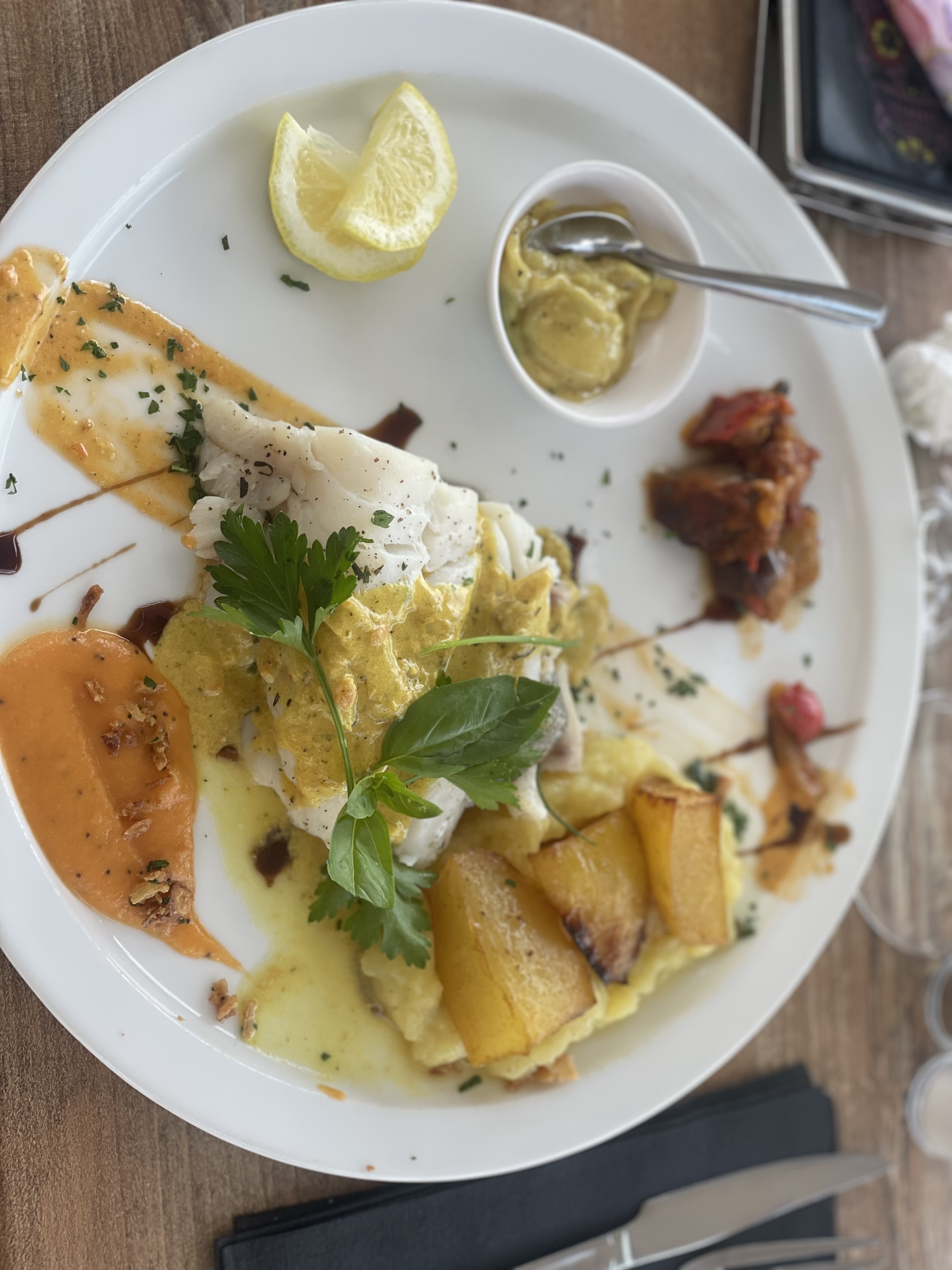 Très joli cadre et personnel très agréable. Mais service un peu long. Côté cuisine, une partie est faite maison, mais l’autre partie est industrielle (légumes en boîte posés sur des raviolis …), c’est dommage