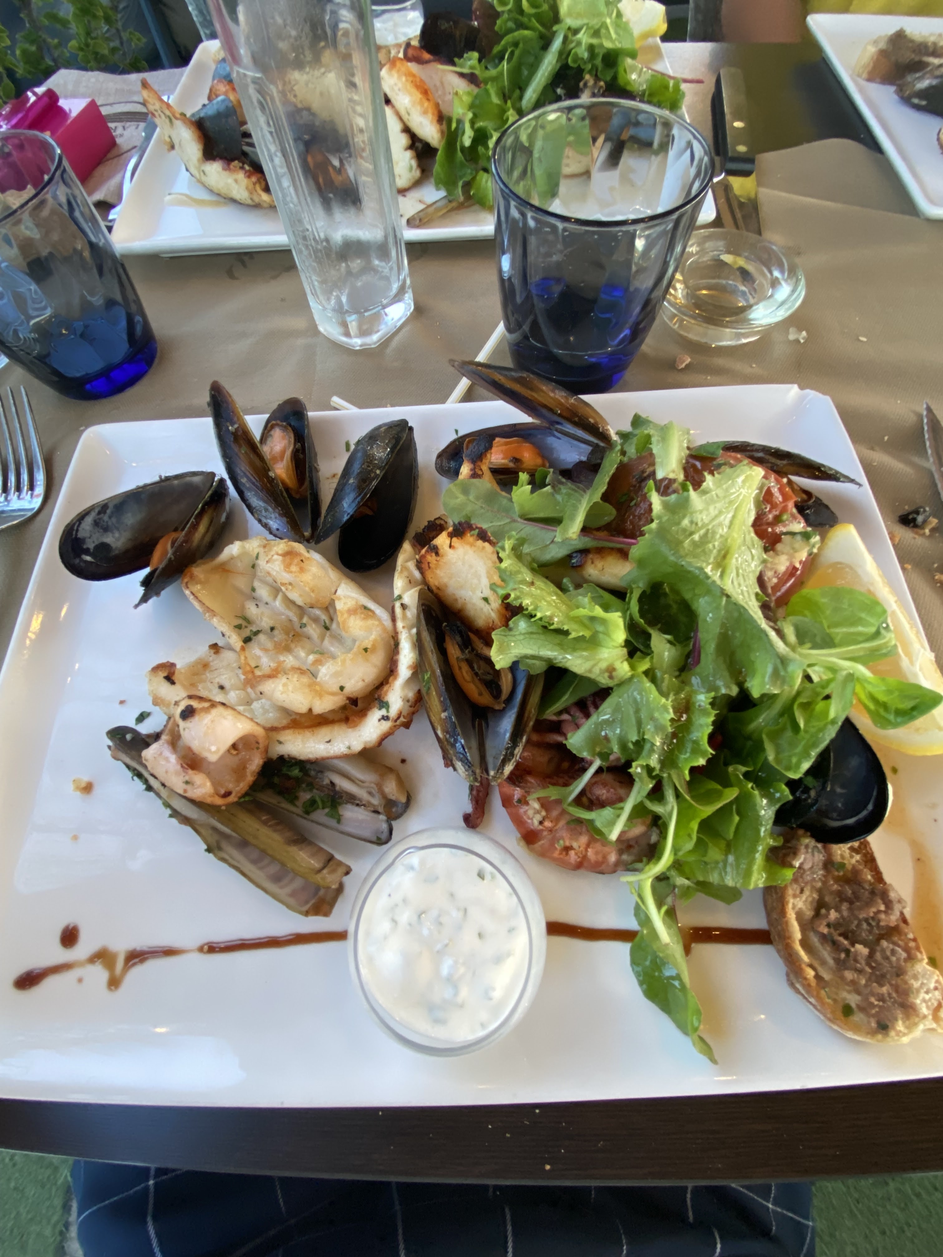 Un vrais plaisir au bord de l'eau. Service impeccable. Plat: une planchas de la mer copieuse et savoureuses. Tarte au citron 🍋 revisitée une révélation miam super bon tout ça. Allez y vous ne serez pas dessus.