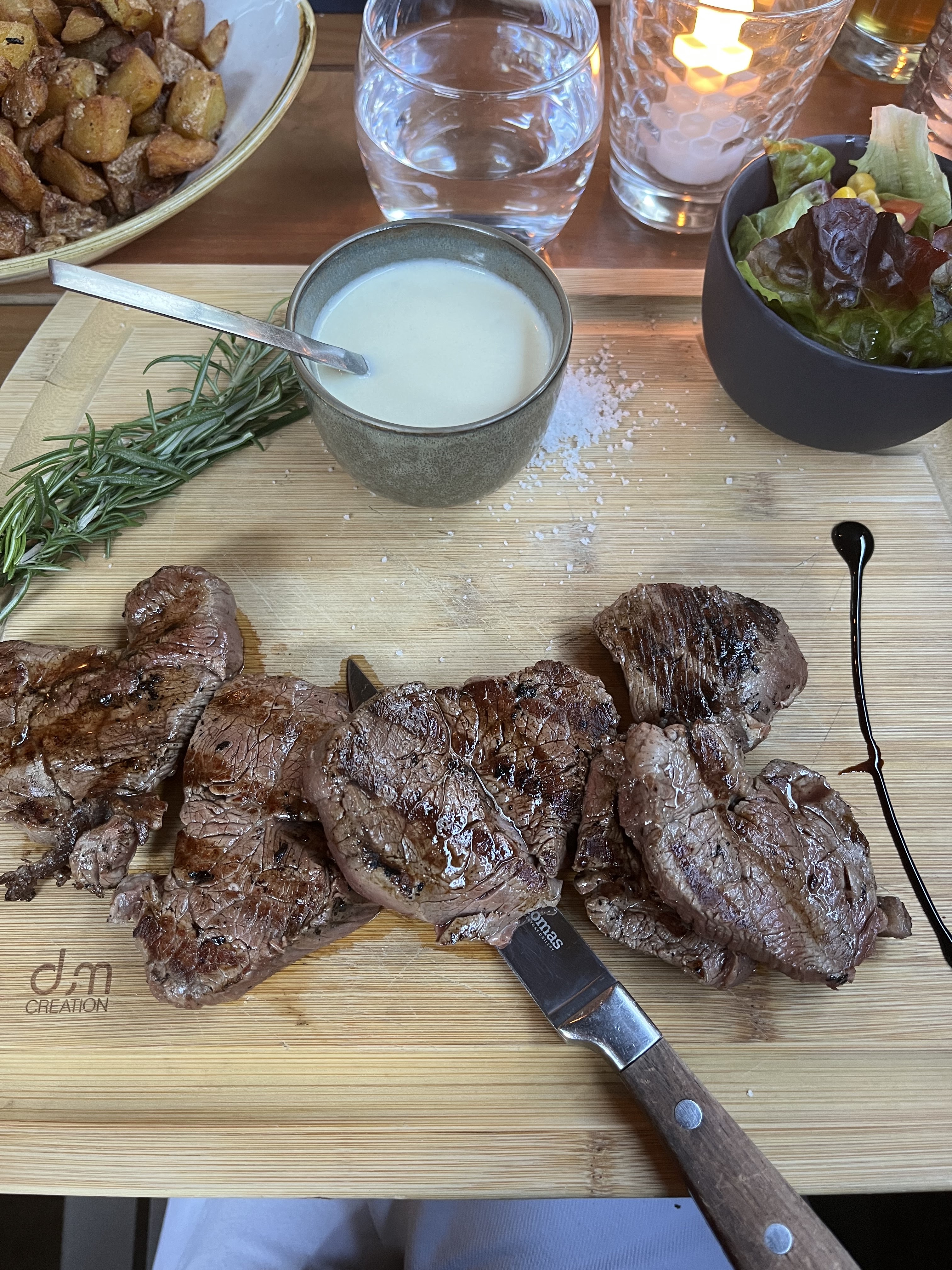 Décevant. Plats ordinaires et chers : Pour 80€ une petite cote de boeuf avec des pommes de terres à partager à deux avec sauce en supplément à 2,50€ que nous découvrons à l’addition… On a l’impression d'être arnaqué. Tables très proches, restaurant bruyant. Peu de diversité dans le menu : Globalement viandes et grillades. Accueil sympathique en revanche