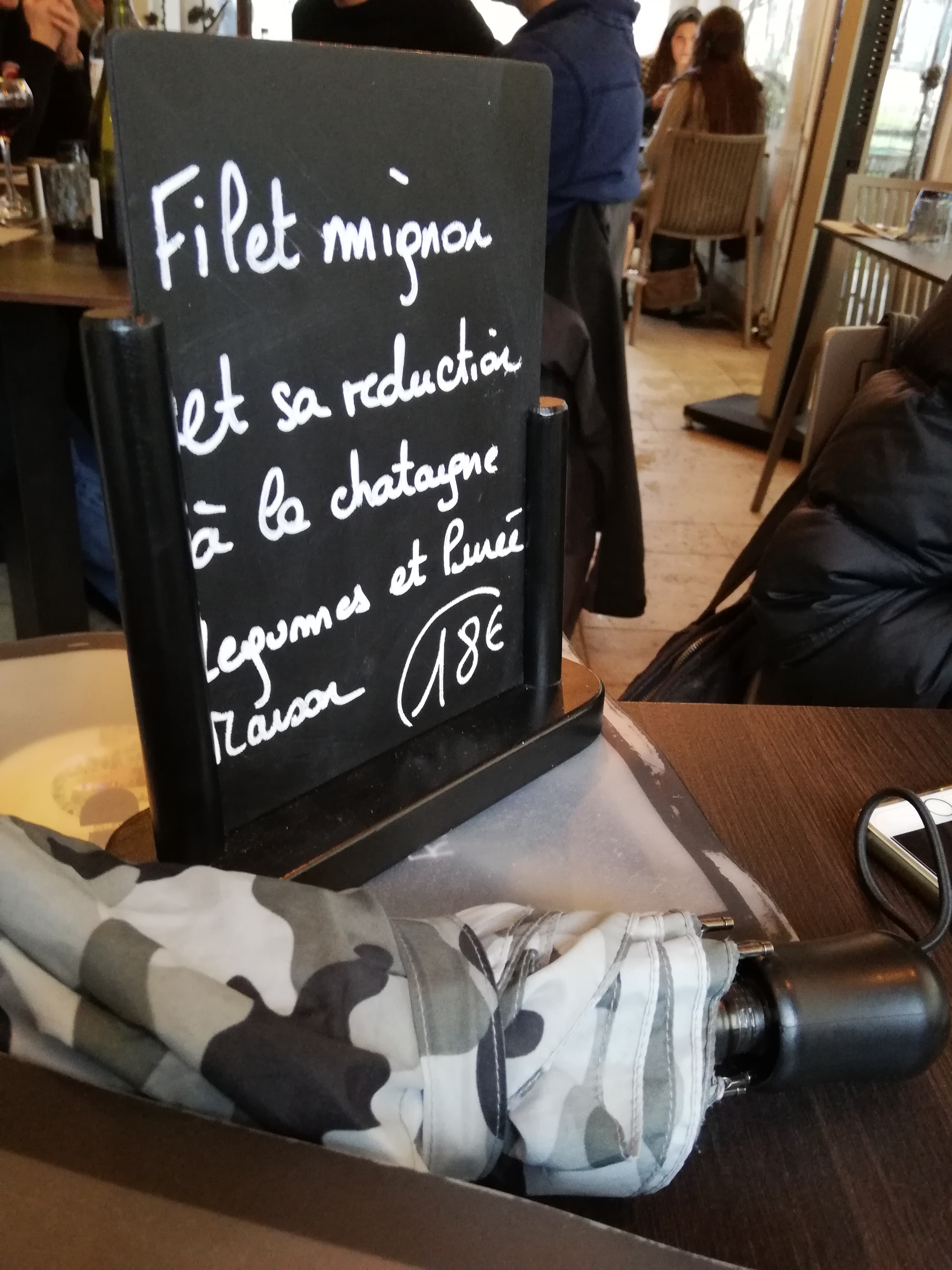 Excellent. Menu du jour pièce de boeuf avec raviolis aux cèpes (copieux tendre) Brochette de boeuf et veau (copieux et tendre) De même pour les desserts. Adresse à retenir.